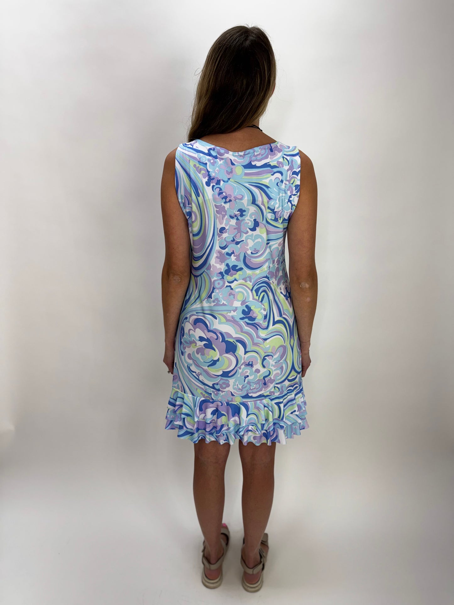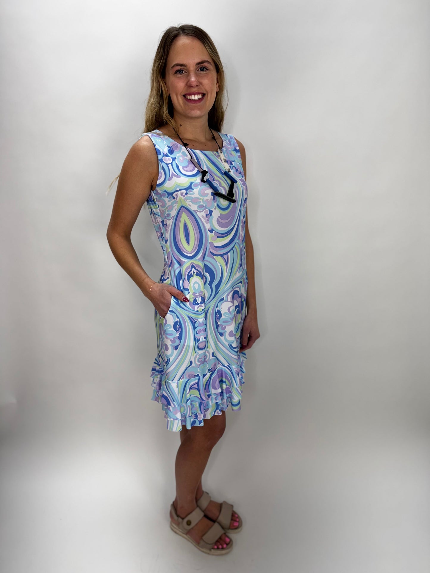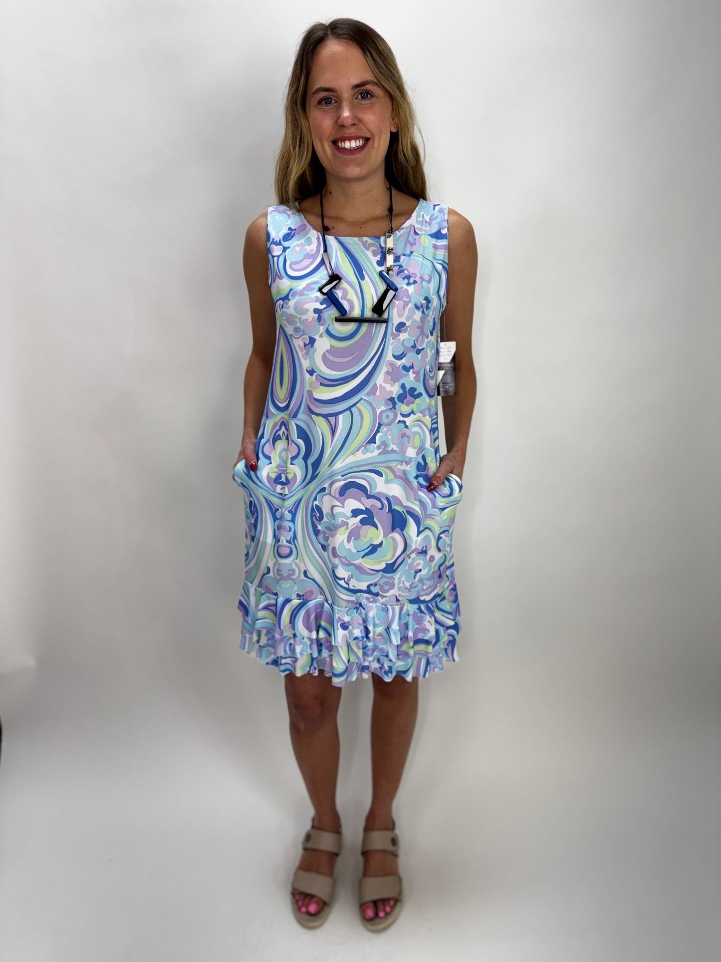 Effortless style meets everyday comfort in this sleeveless ruffle bottom dress. The soft light blue pattern flatters any complexion, while the playful ruffled hem adds movement and dimension. Functional pockets keep your essentials close without sacrificing the silhouette. Perfect for casual outings, weekend brunches, or layered styling. A versatile wardrobe staple that transitions seamlessly from season to season.