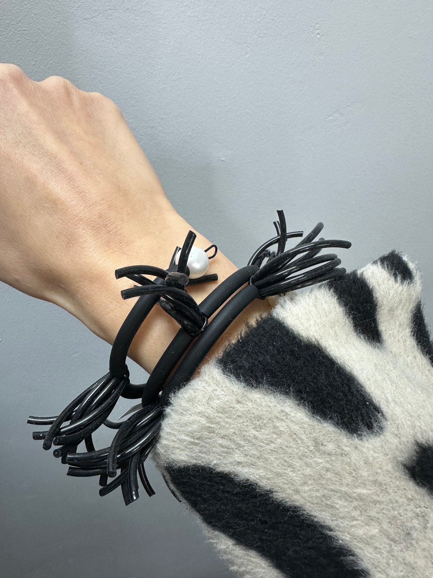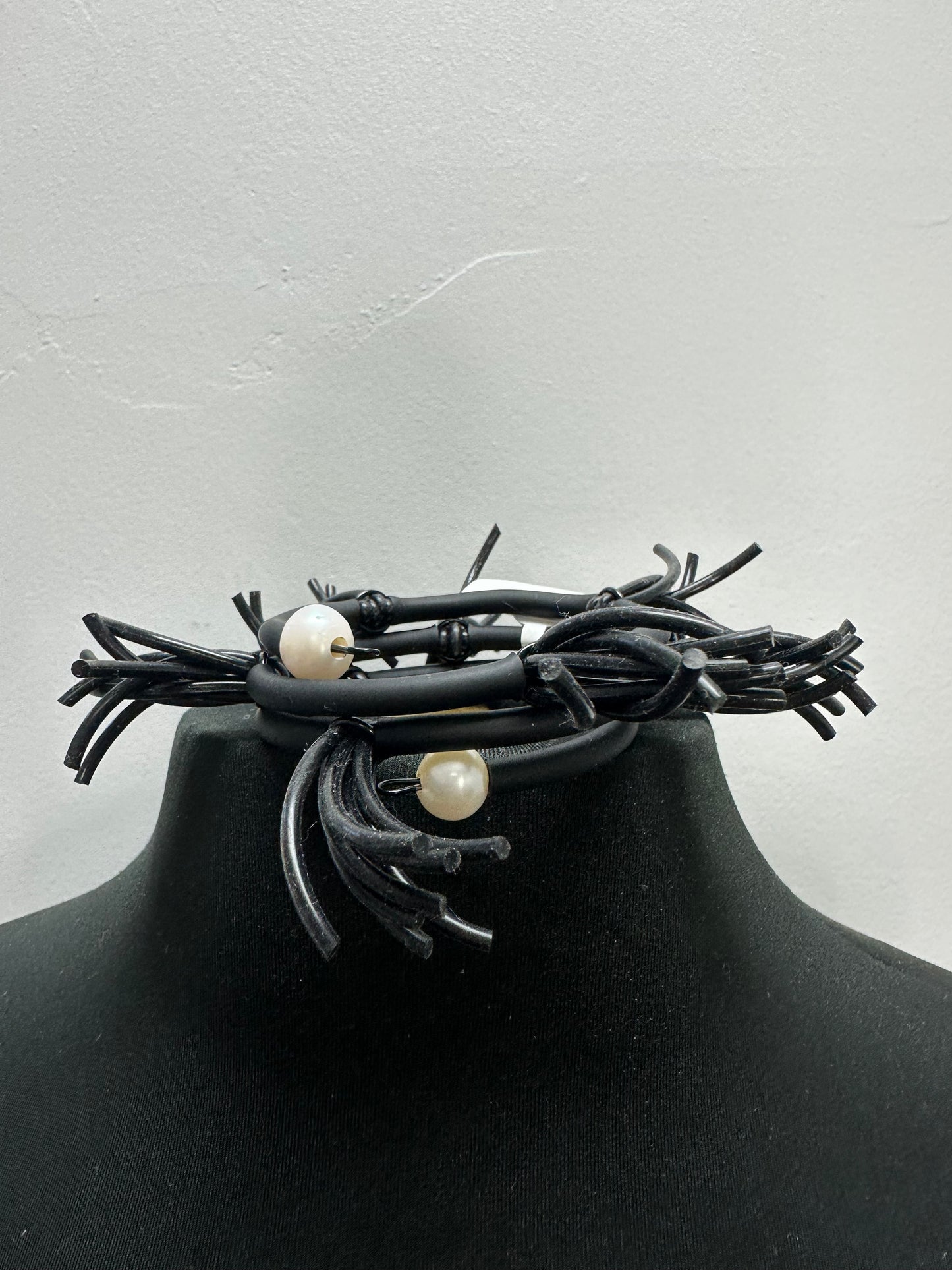 This Handmade Bracelet is created by our one-of-a-kind artist using recycled inner tube and pearls to create unique and artistic wearable art.