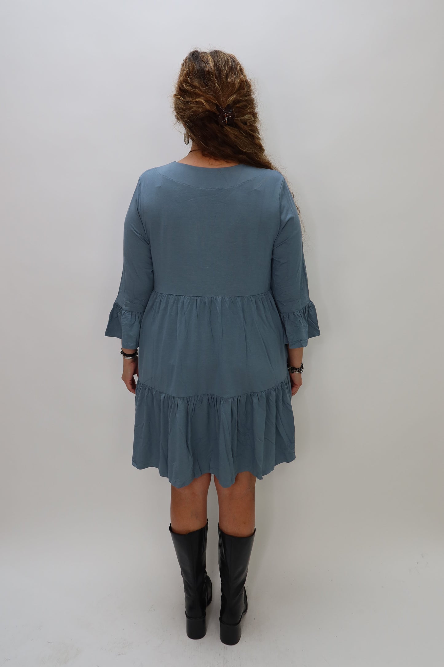 Steel Gray Blue Tencel Long Sleeve Tiered Dress