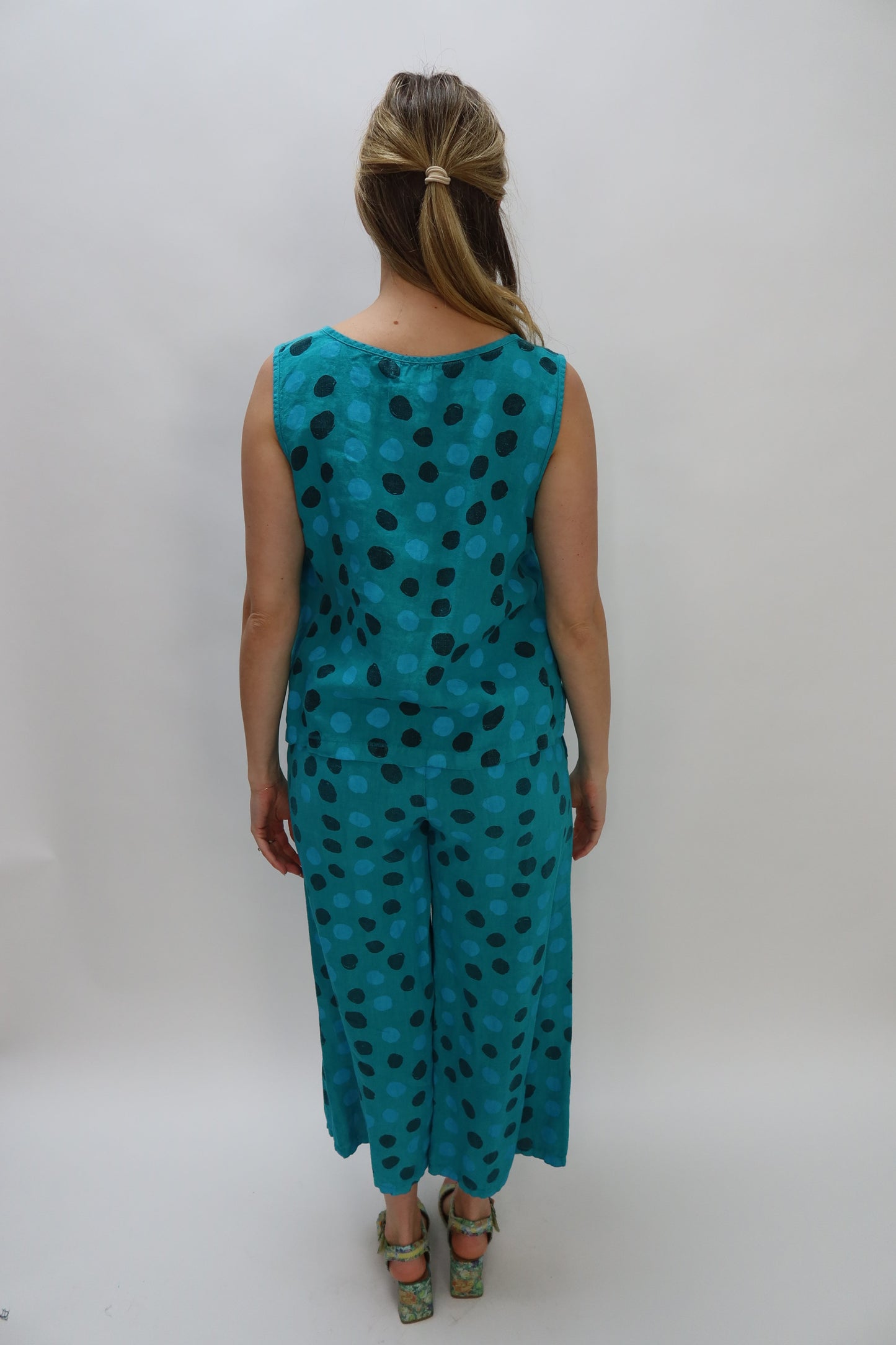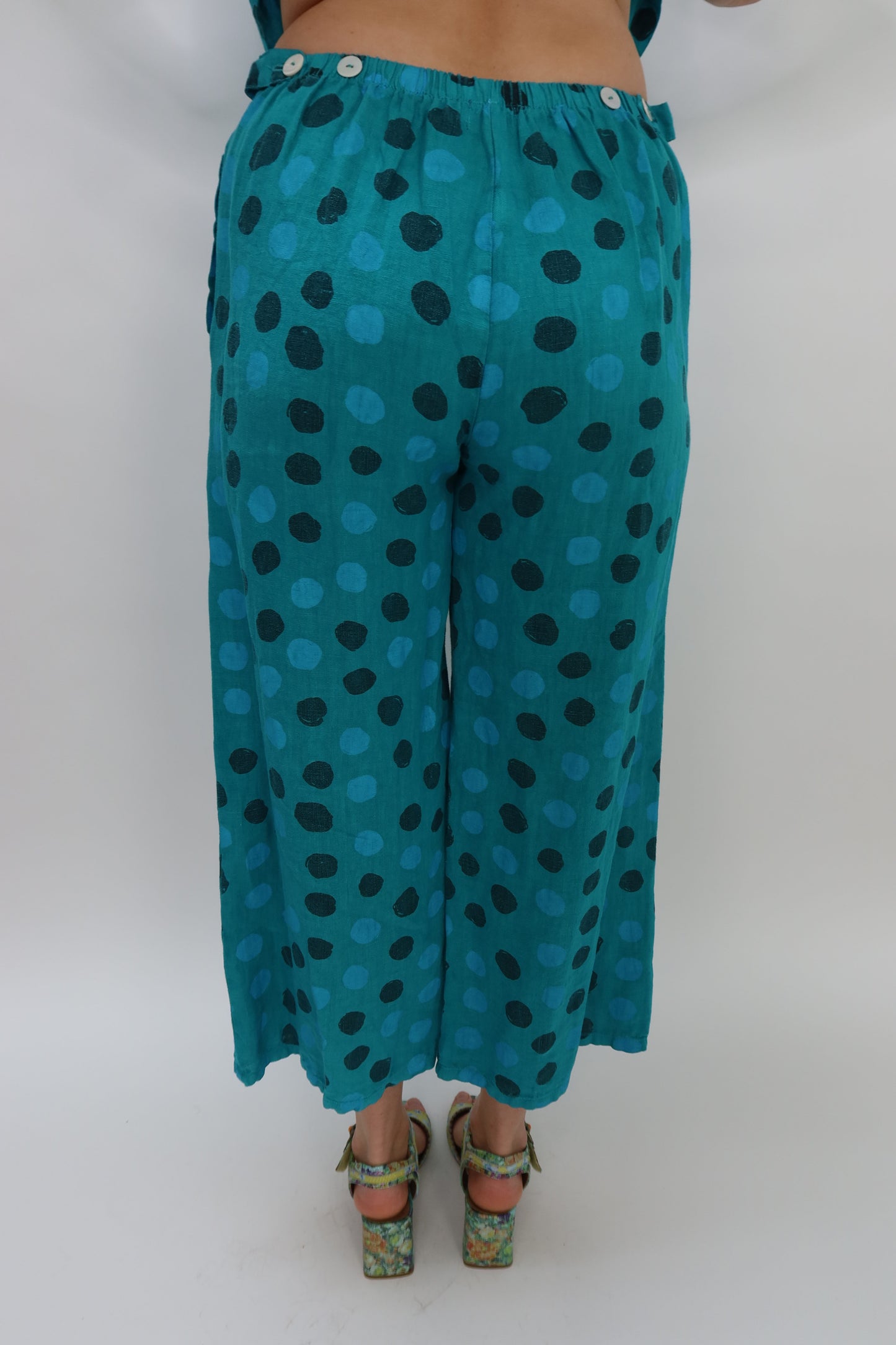 Teal Dots Linen Flat Front Crop Pant with Adjustable Waist