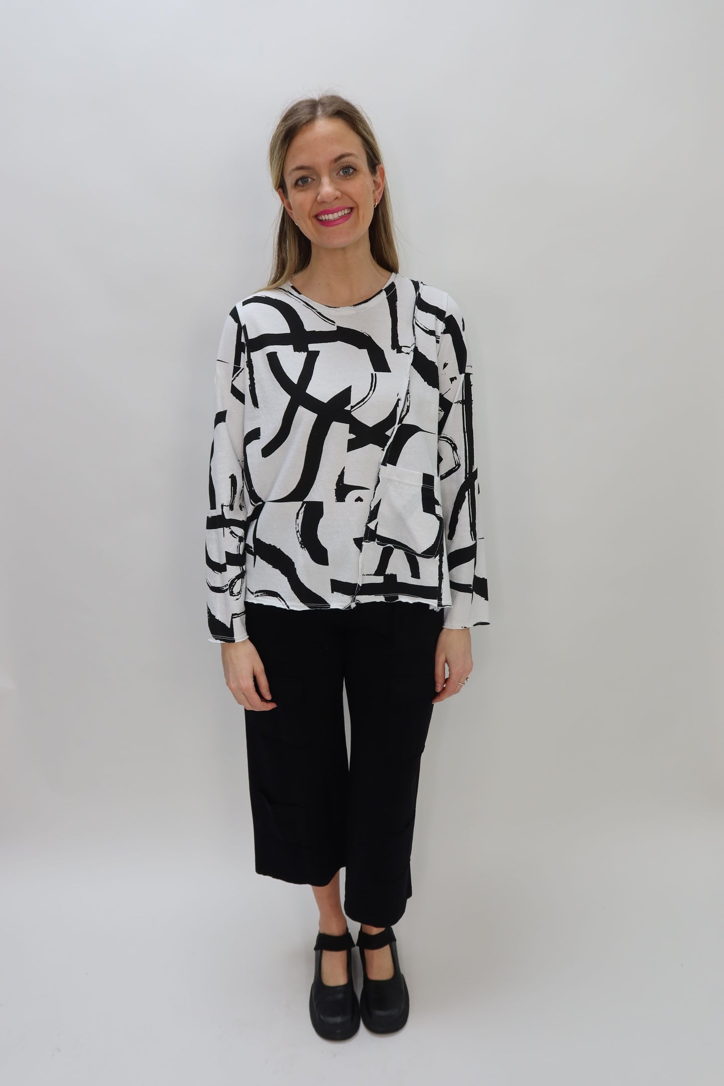 This striking asymmetrical top combines artistic flair with everyday wearability. The bold black and white paintbrush stroke pattern creates visual interest, while the asymmetrical cut adds modern edge without sacrificing comfort. A single functional pocket keeps essentials within reach, and the straight hemline with subtle flair ensures a flattering silhouette that works for casual outings or creative occasions. Perfect for anyone who wants to make a statement with their style.