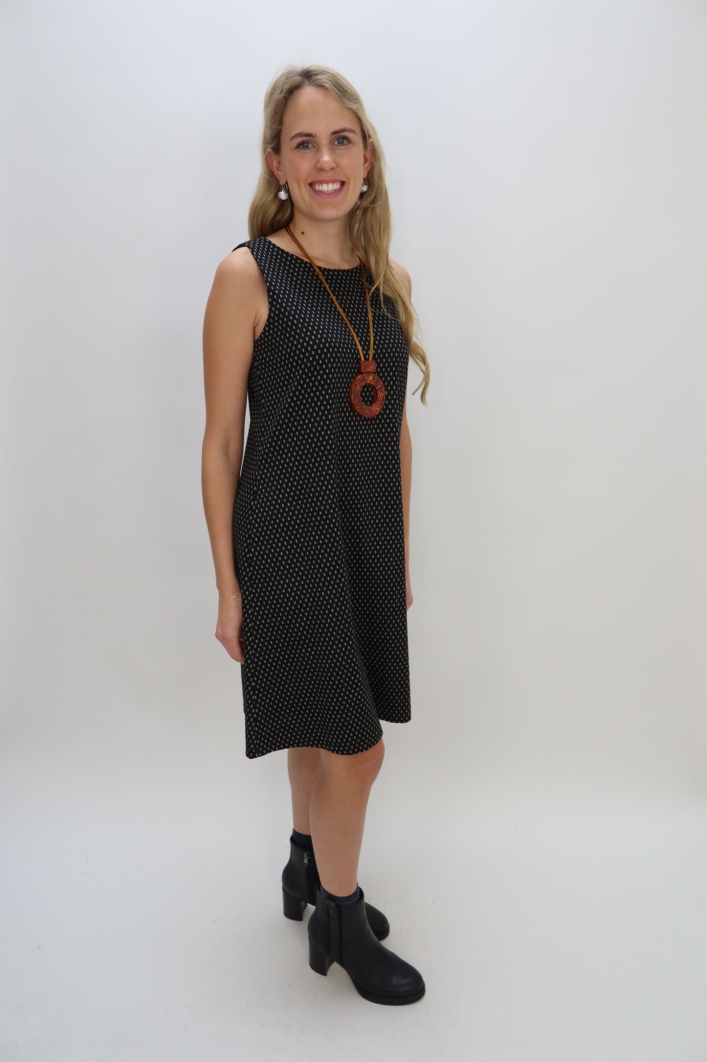 This sleek sleeveless dress combines a timeless black and ivory pattern with a flattering silhouette that elongates your frame. Crafted from luxuriously soft fabric, it moves with you throughout the day while maintaining its shape. The understated geometric design works effortlessly from office to evening, making it a versatile essential that feels as good as it looks. Perfect for anyone seeking comfort without compromising on style.