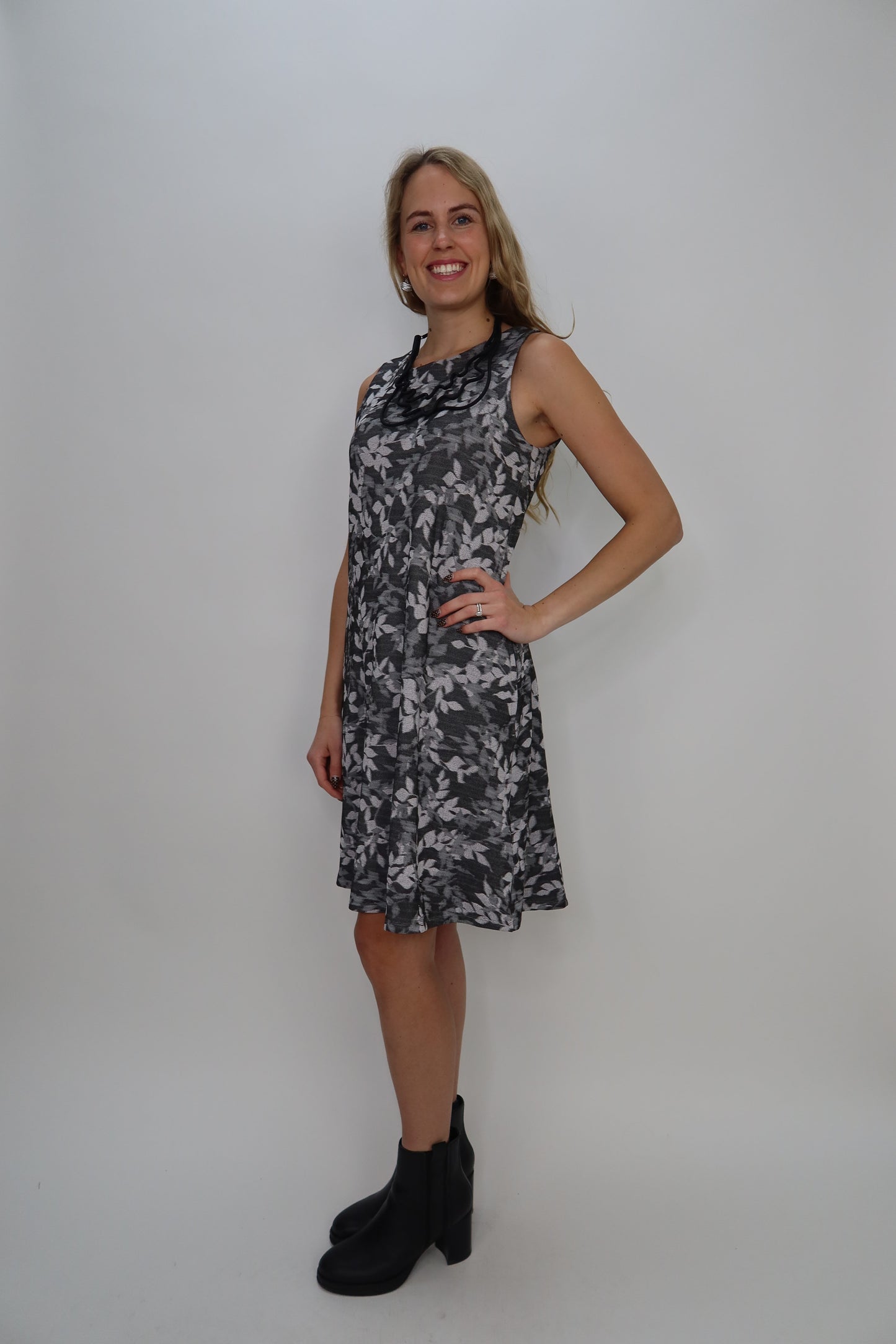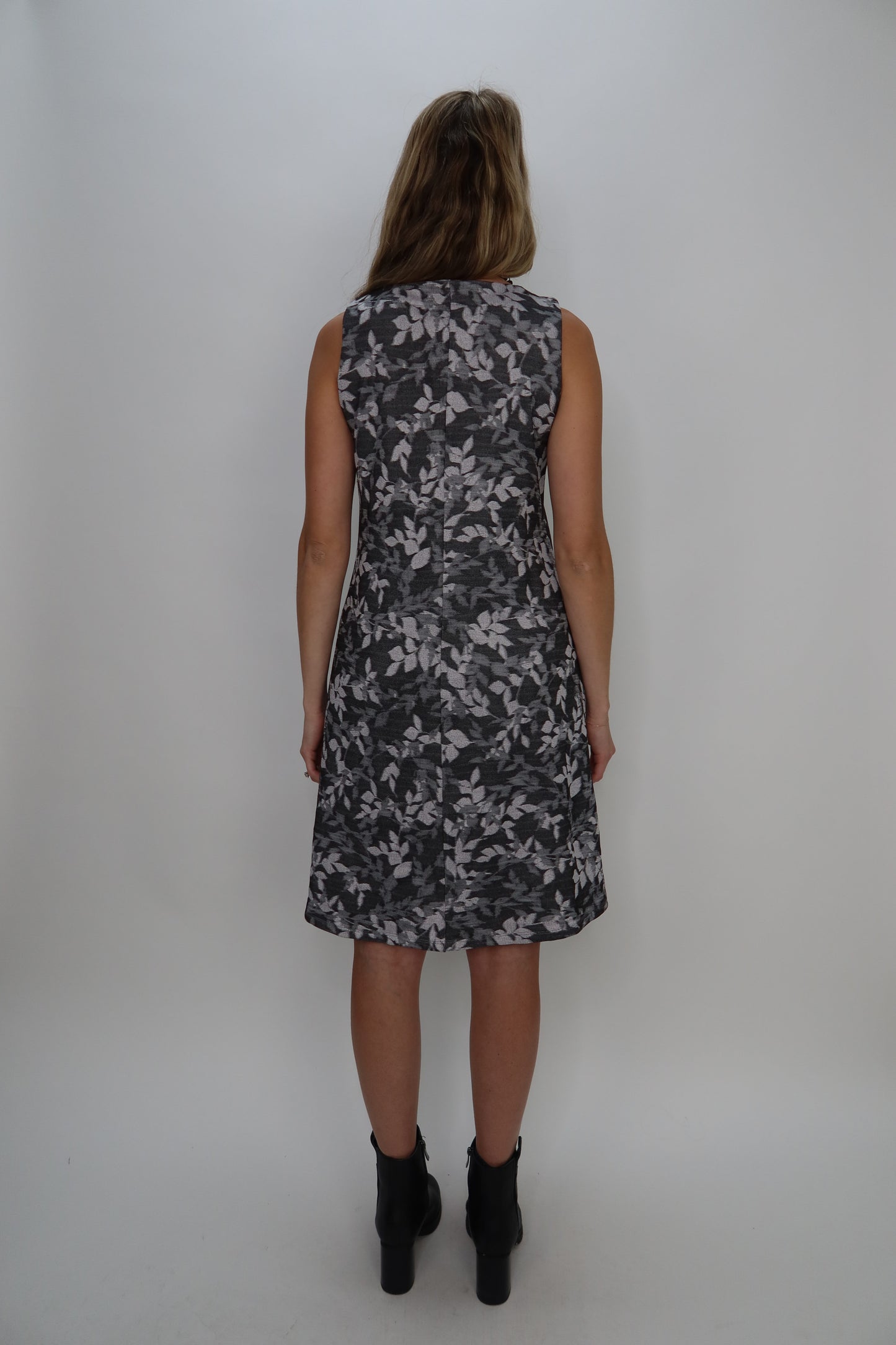 This charcoal and gray patterned dress combines style with substance. The sleeveless design keeps things breezy while the heavy-duty fabric provides reliable support and structure throughout the day. A playful pattern adds personality, while the knee-length cut and high neckline offer a polished, put-together look that works for any occasion. Comfortable, durable, and undeniably fun—this dress does it all.