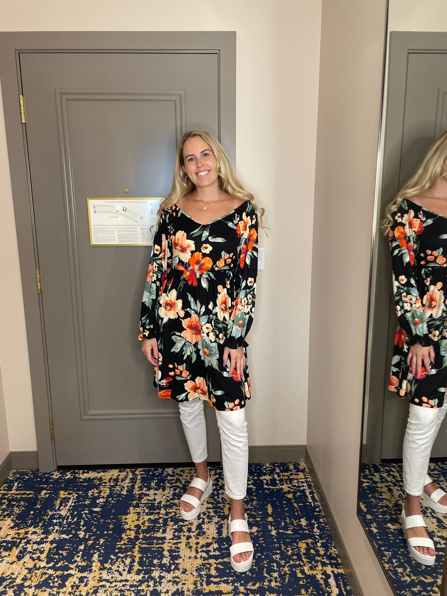 Regular price $24.50This super cute black dress has an orange floral pattern to it. It has a soft v-neck with elastic arms that can be ruched up or kept down.