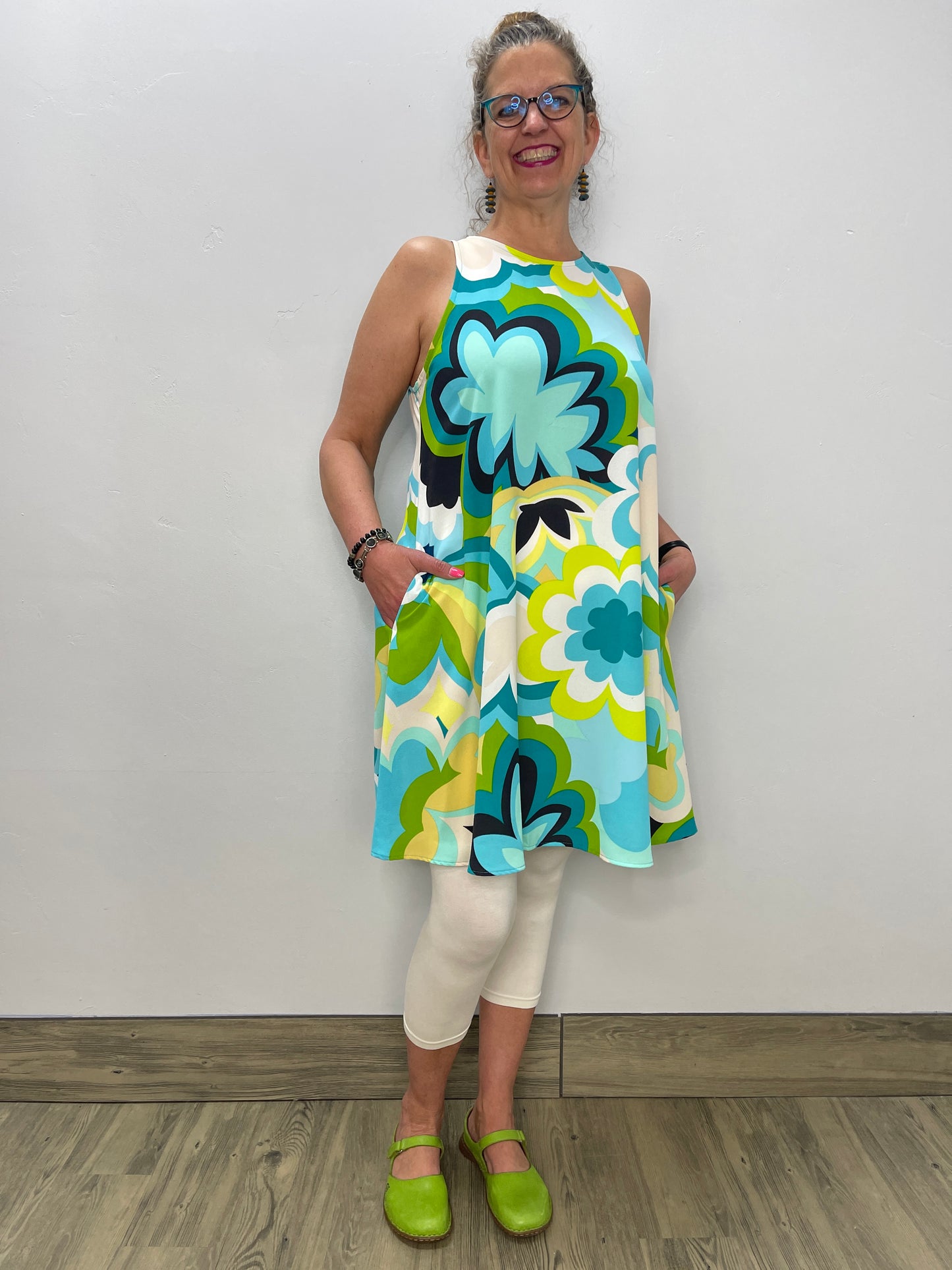 Blue Green Floral Print Sleeveless Keyhole Dress