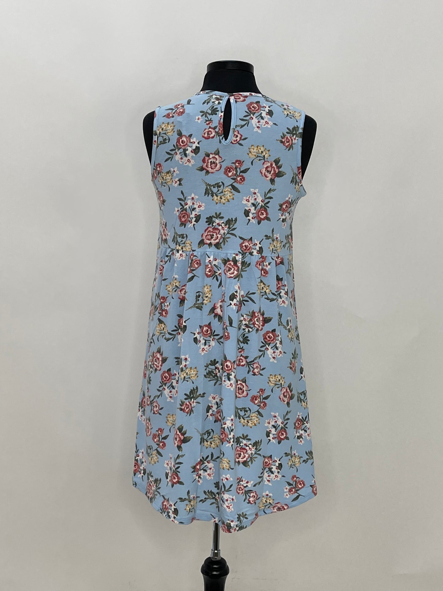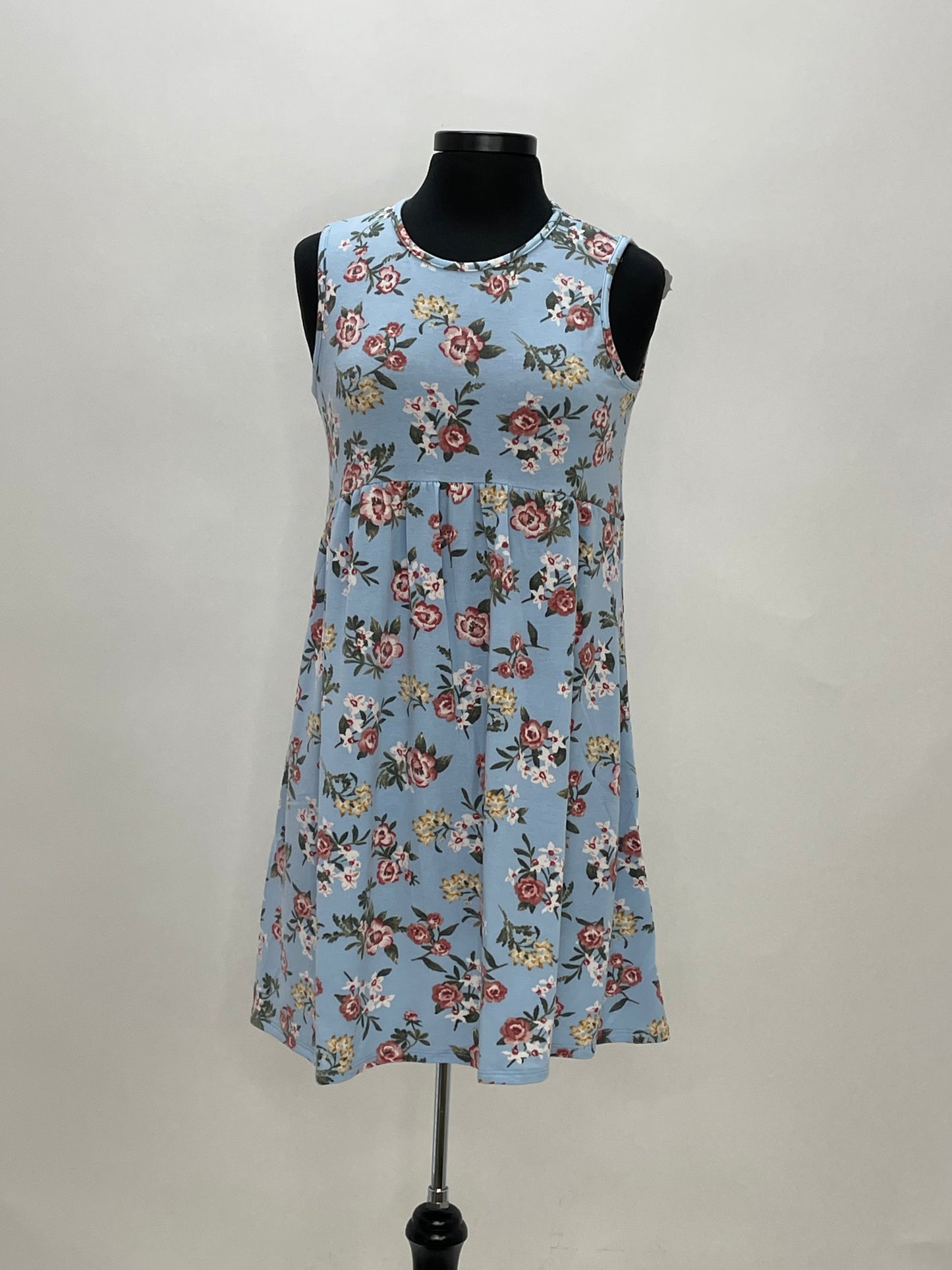 Regular price $55.30This adorable blue dress has a floral pattern on it. It is a sleeveless dress with a button closure in the back. Wear this dress alone or add a pair of leggings to extend the look.