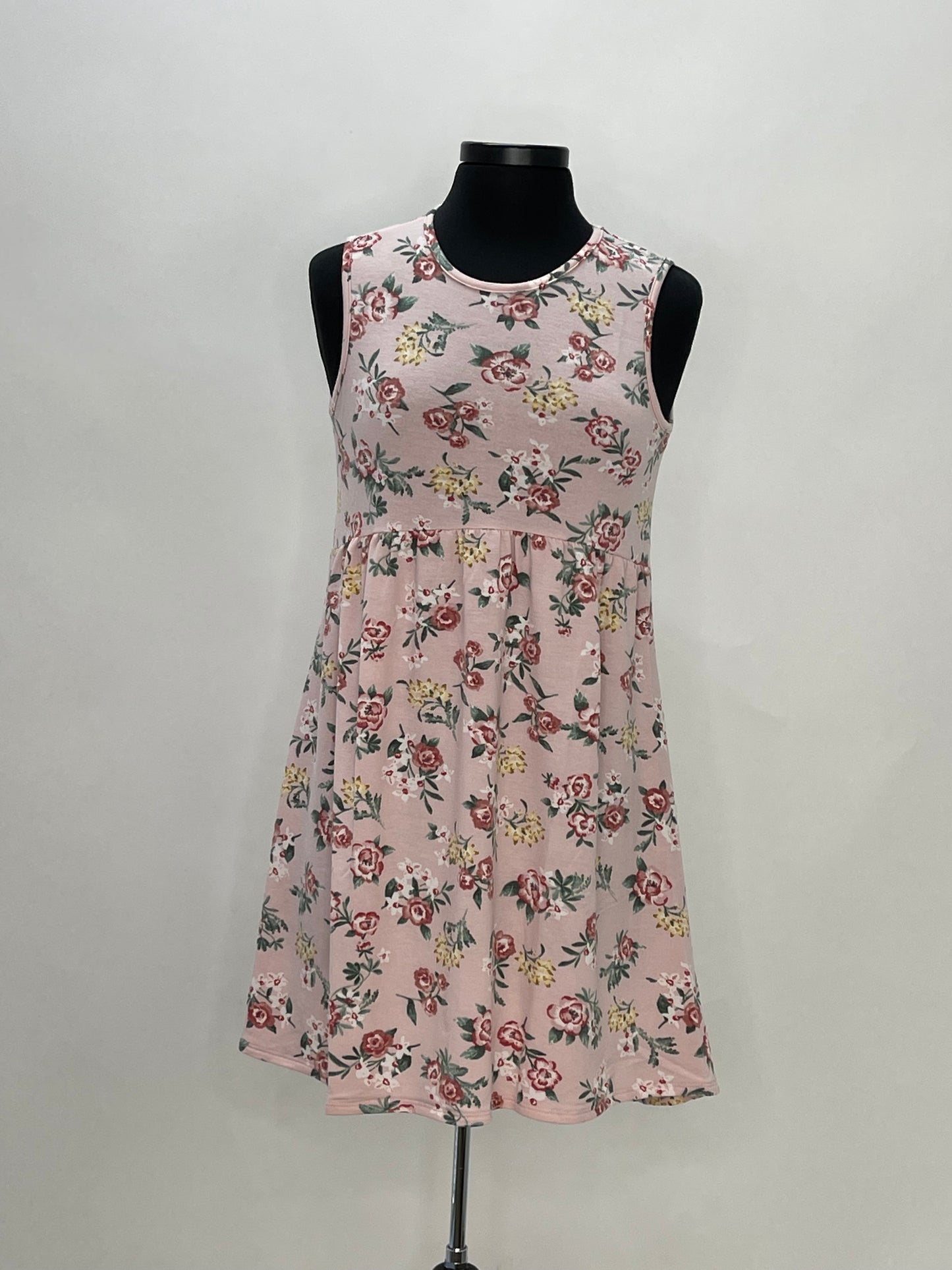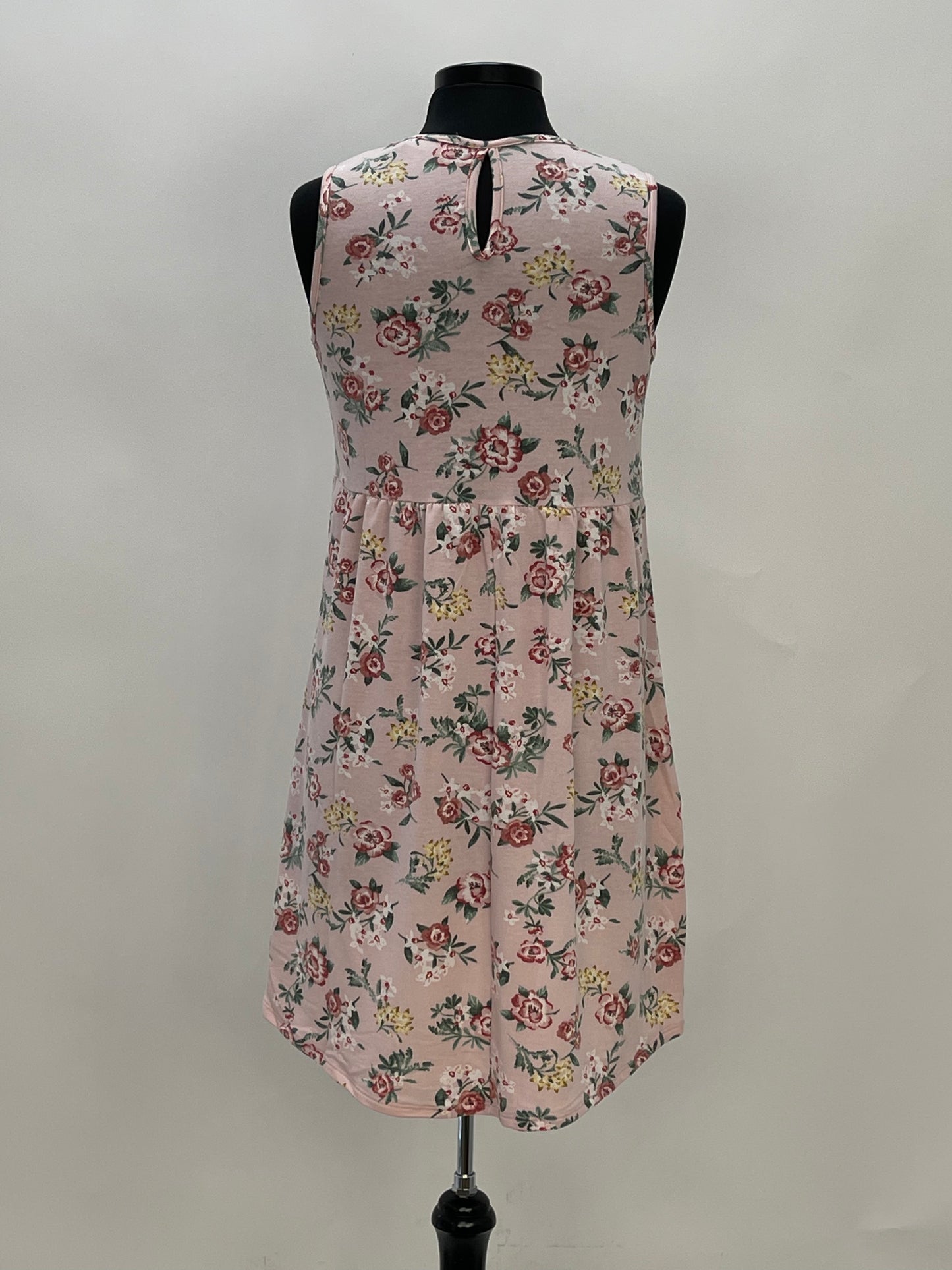 Regular price $55.30This adorable pink dress has a floral pattern on it. It is a sleeveless dress with a button closure in the back. Wear this dress alone or add a pair of leggings to extend the look.