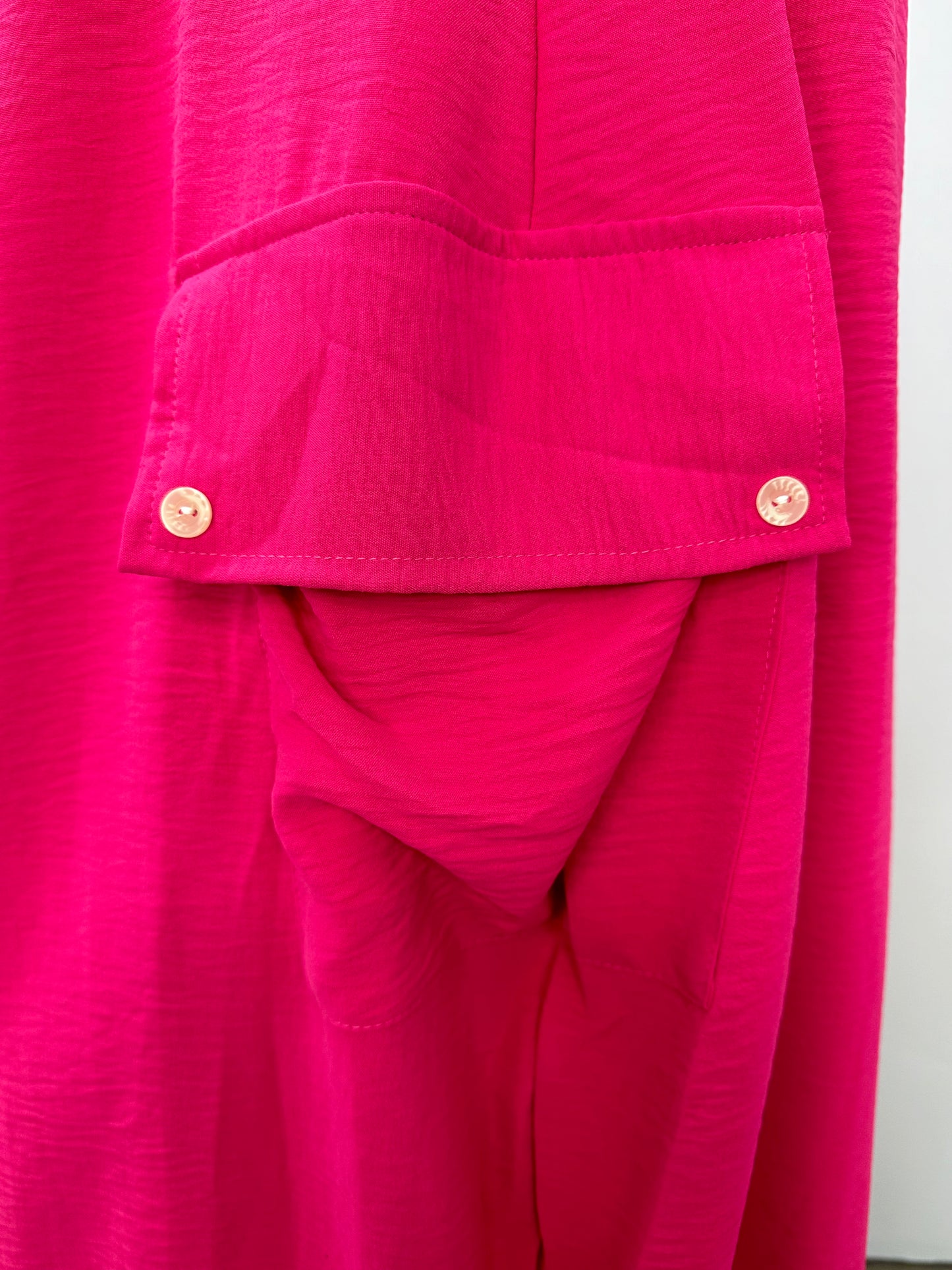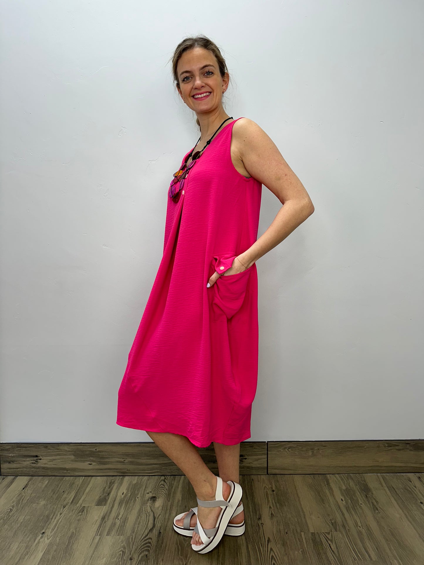 Regular price $76.30Effortlessly transition from day to night with our beautiful fuchsia sleeveless dress. Made with a vibrant pink fabric, this dress features a functional pocket and delicate button details on the top. With its knee-length design, it's perfect for any occasion. Elevate your wardrobe with this pretty and versatile piece!