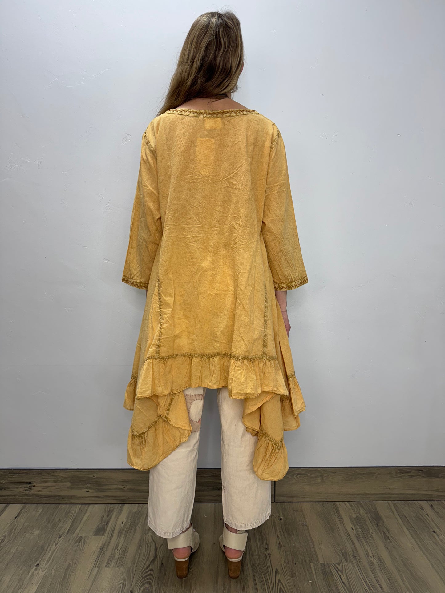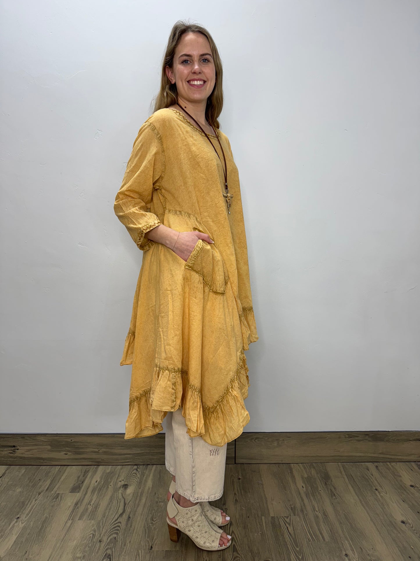 Regular price $111.30Indulge in the luxurious comfort and style of our Gold Printed Mineral Wash Scoop Neck Asymmetrical Dress. The beautiful asymmetrical hemline adds a touch of drama, while the ruffles and embroidered neck detailing exude elegance. Perfect for any occasion, this dress is sure to turn heads and make you feel confident and chic.