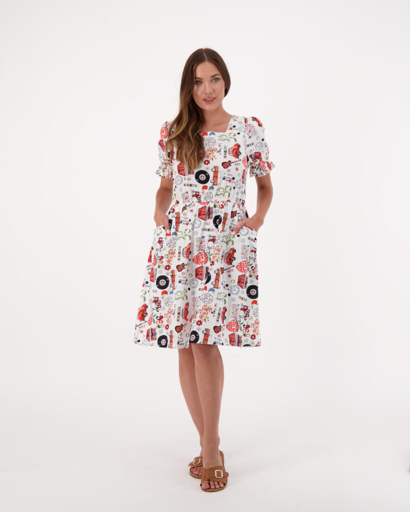Regular price $104.30This Gabby Isabella dress apart of the 60s retro line and is SO cute. This knee-length dress is perfect for the summer on a hot day. Feel free to add a legging for a cooler day and a cardigan. This dress has two front pockets and a little pucker sleeve on the shoulders. This dress is super bra friendly and is perfect for any occasion.