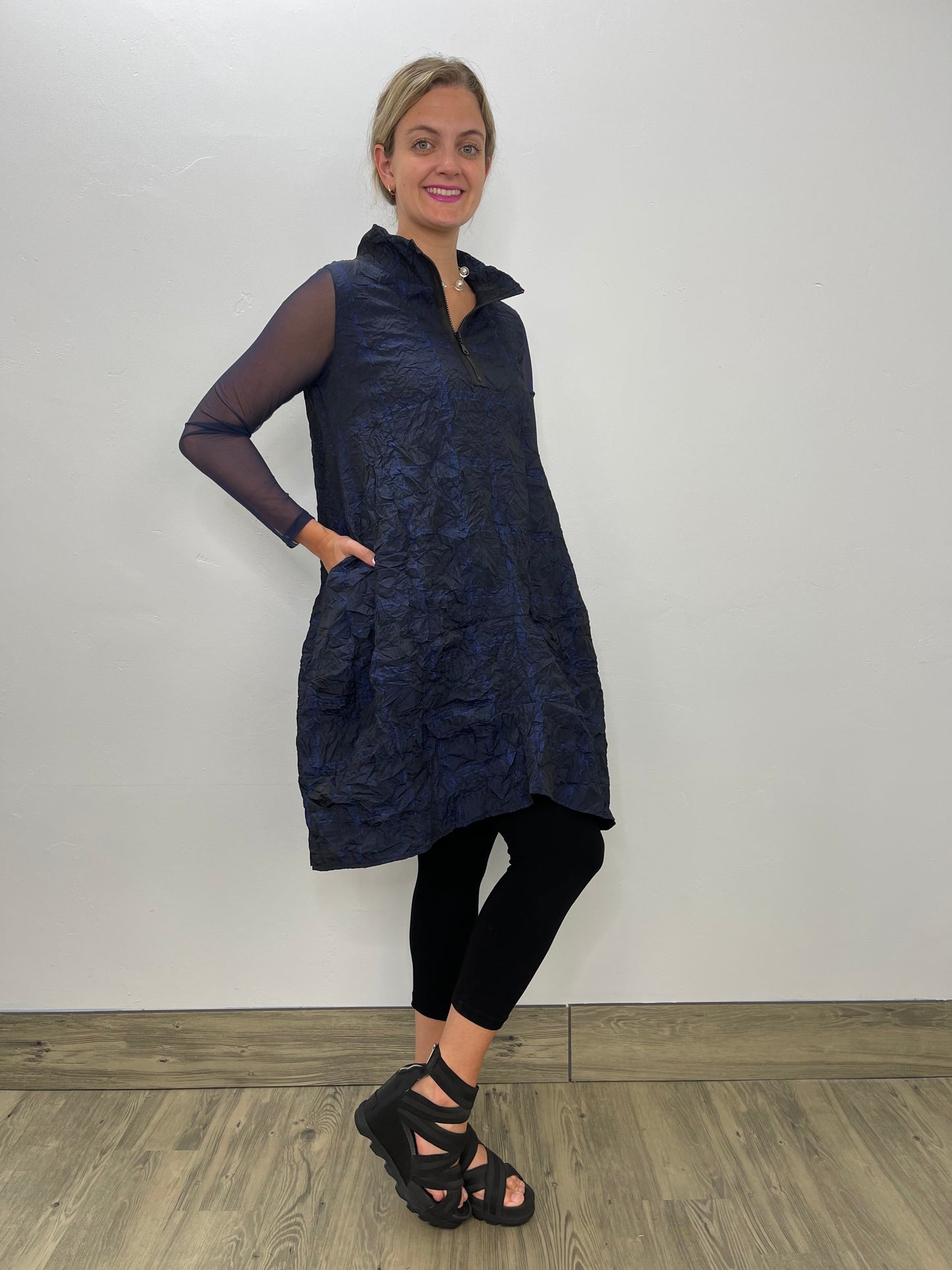 Regular price $153.30This Navy Long Sleeve Knee Length Dress is the epitome of sophisticated style. The beautiful navy color and mesh sleeves give it a luxurious feel, while the collar neck and quarter zip front offer a smart modern look. Dare to turn heads in this unique and stylish piece!