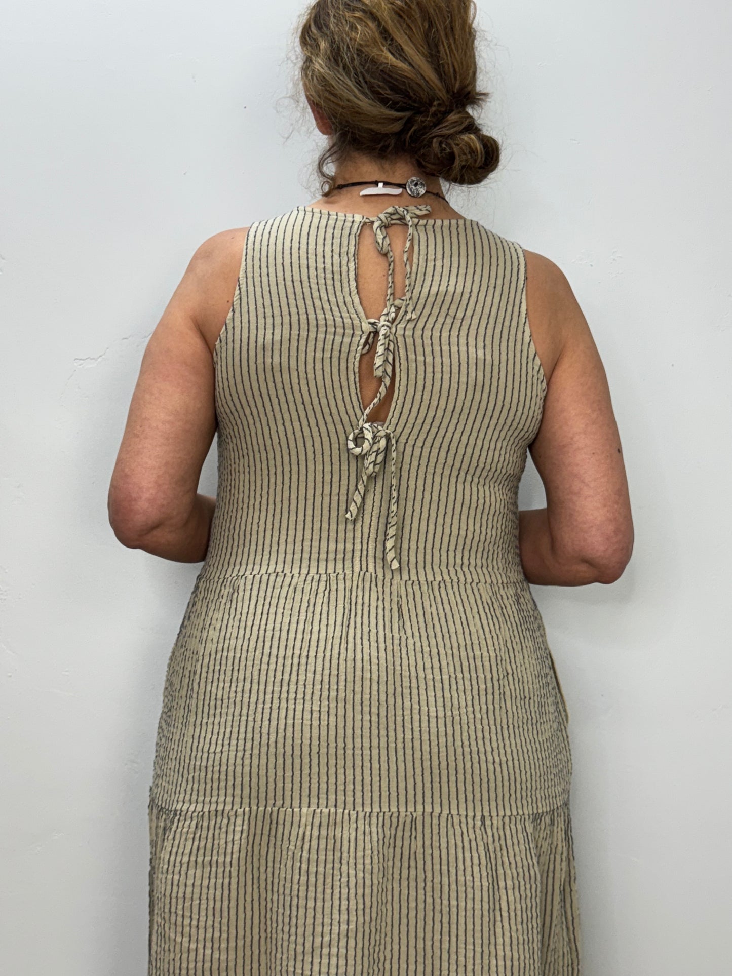 Regular price $67.90Indulge in comfort and style with our Sand Stripe Tiered Dress! Made of 100% natural cotton gauze, this maxi dress is breathable, hypoallergenic, and lightweight. The sleeveless design and two pockets offer convenience, while the back ties add a touch of elegance. Perfect for any occasion!