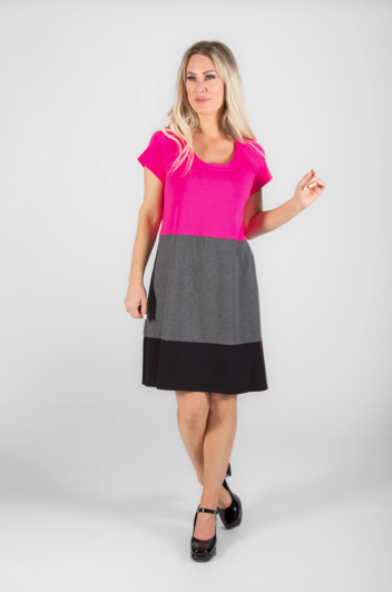 Regular price $71.40Elevate your weekend wardrobe with this Short Sleeve Pink Tiered Dress! This flirty piece features short sleeves, a scoop neck and a three tiered design. The pink top transitions to grey and black, giving the dress a unique, stylish touch. Plus, with a knee-length and breathable 67% rayon of bamboo, 28% cotton and 5% spandex fabric blend, it's the perfect day-to-night transition piece. Make a statement in this effortlessly chic dress!
