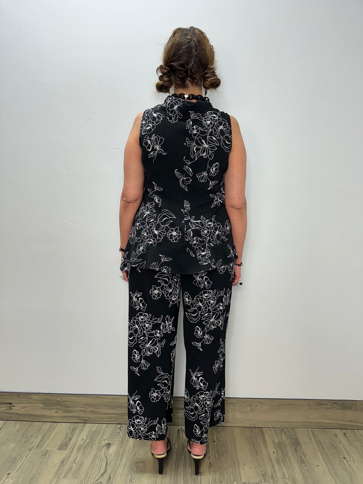Black White Flowers Mock Neck Sleeveless Tunic Top