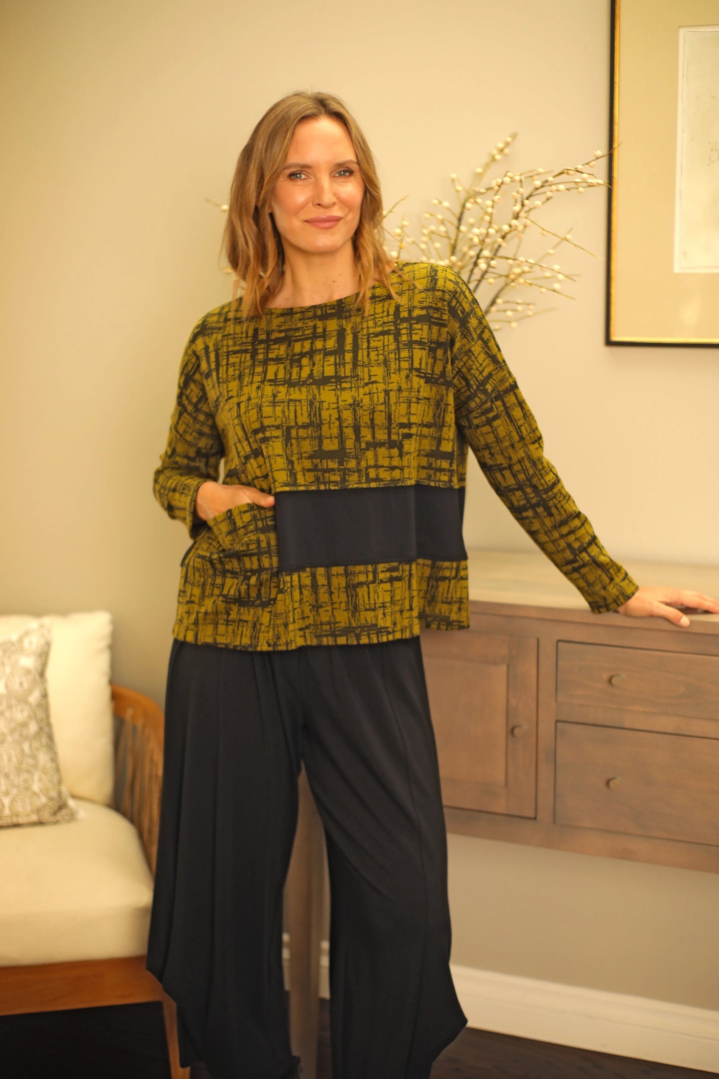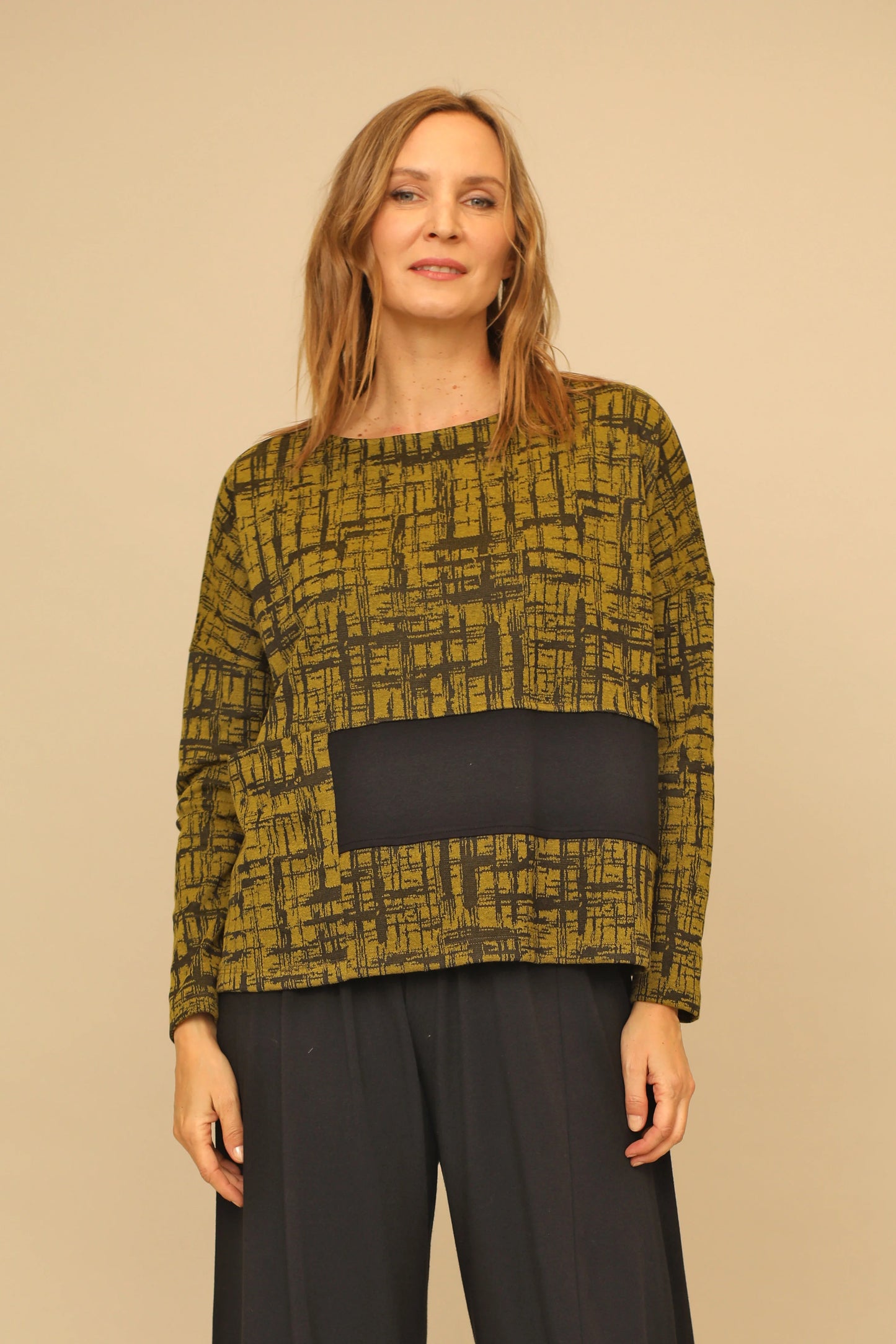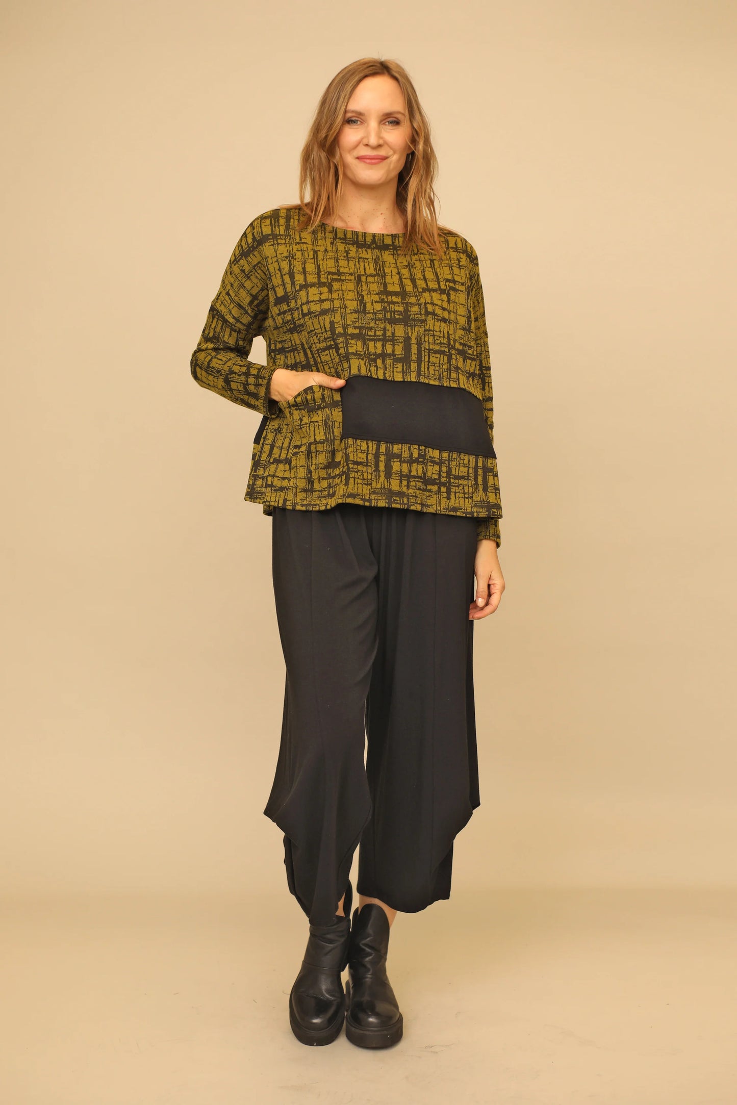 Regular price $104.30Promote your wardrobe and get stylishly creative! The never-before-seen Gwen Top is guaranteed to draw eyes with its gorgeous black bamboo solid contrast that sits next to the large patch pocket. Bringing a comfortable feel with its drop shoulders, long sleeves, and a rounded neckline with a straight hem in a boxy silhouette.