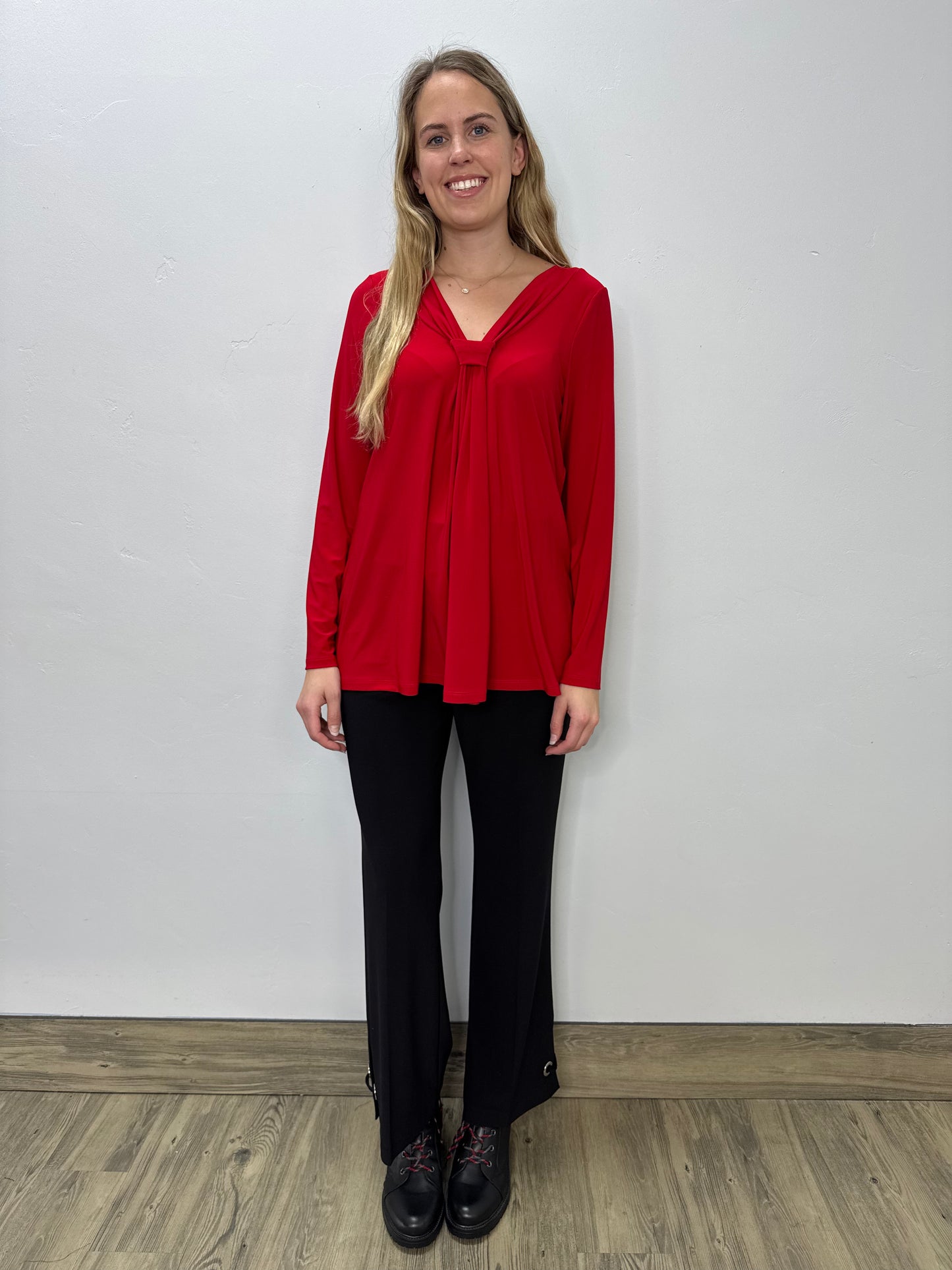 Regular price $58.20The Red Long Sleeve Knot V-Neck Top is the perfect combination of elegance and simplicity. With flattering lines and long sleeves, this top is both stylish and practical. Its v-neckline and knot detail add a touch of sophistication. Elevate your wardrobe and exude confidence with this must-have top!