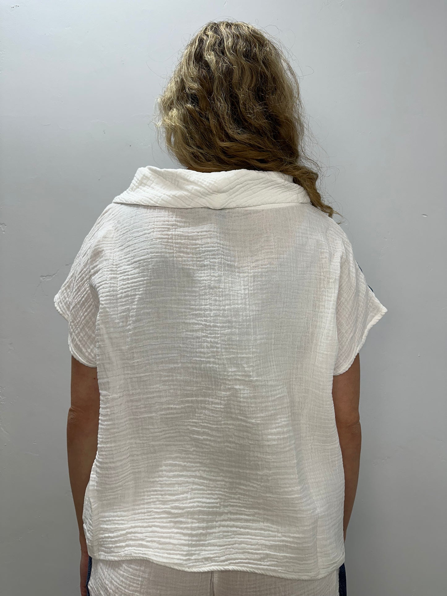 White Cotton Gauze Short Sleeve Top With Cowl Neck