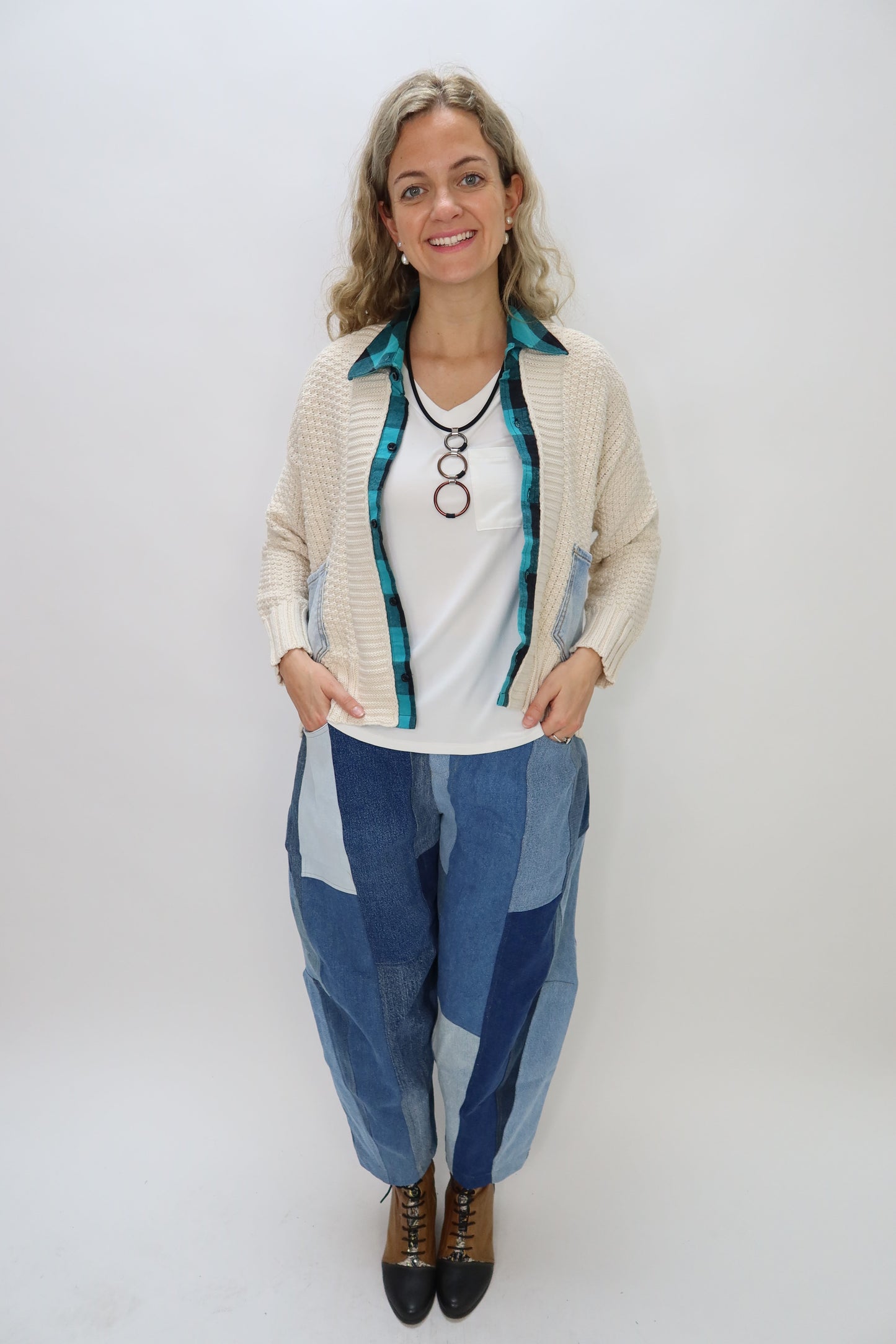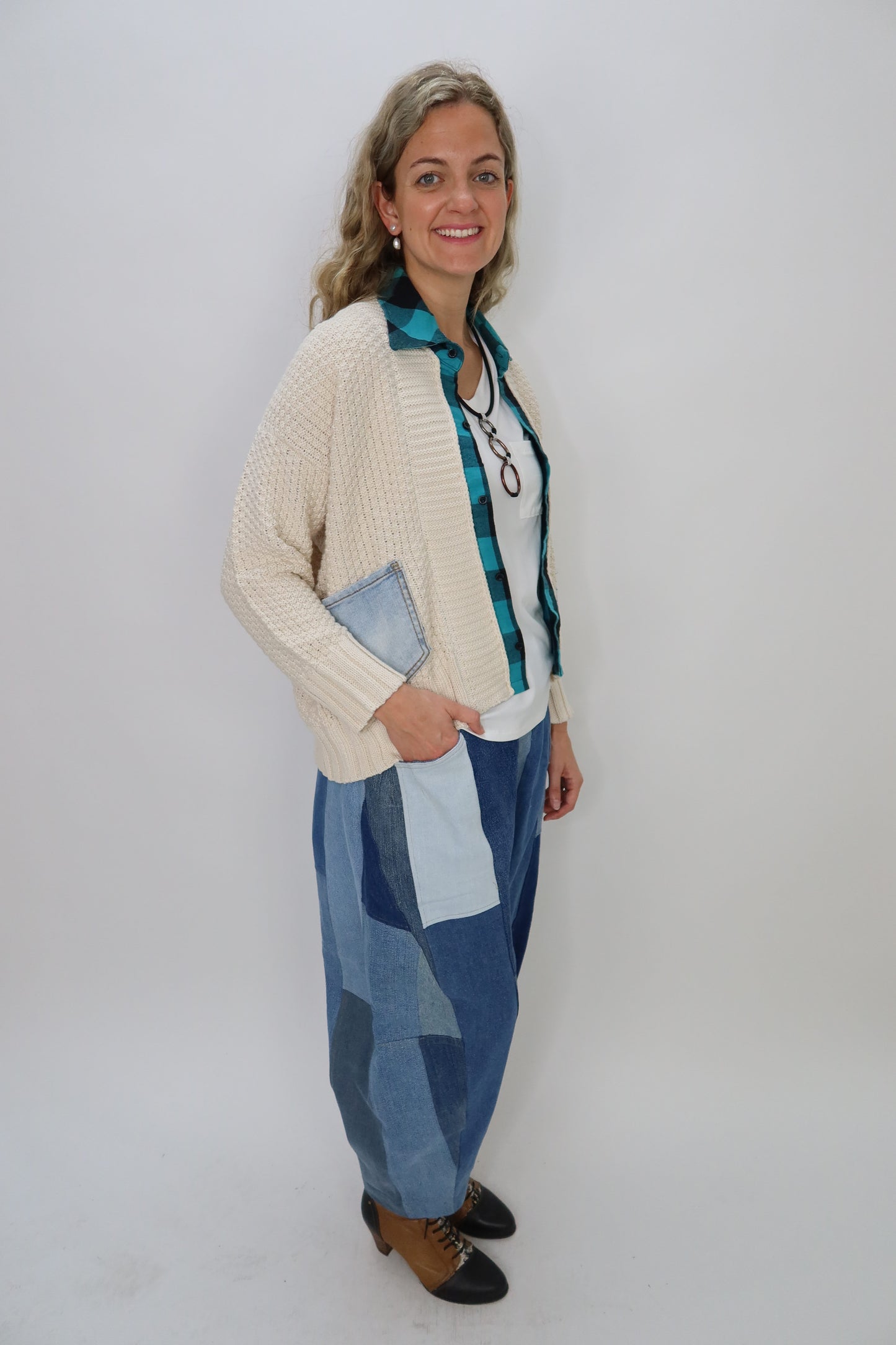 Add Upcycled Teal Flannel and Denim Knit Cardigan One Size to the cart