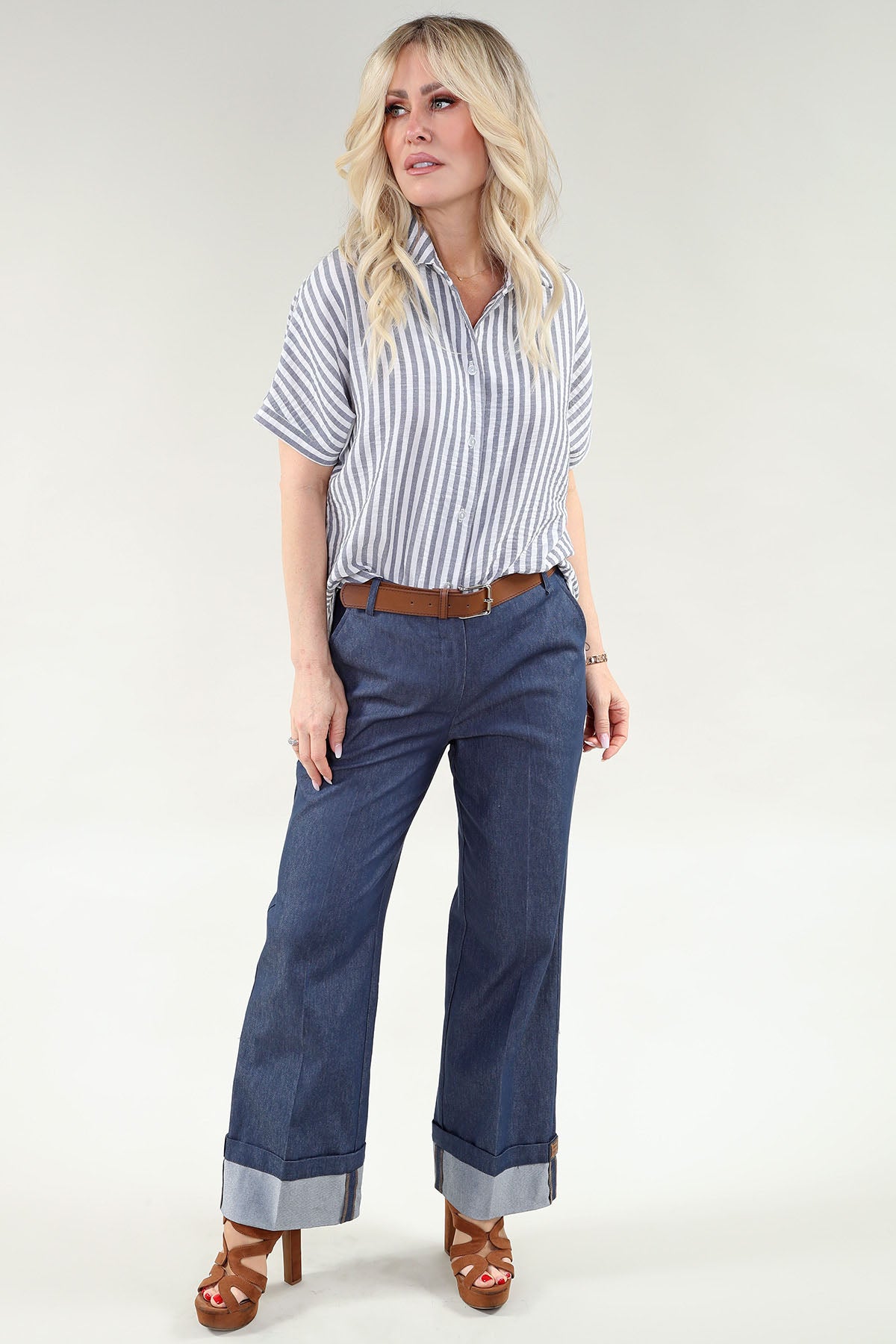 Blue and White Stripe Crepe Short Sleeve Button Down Top
