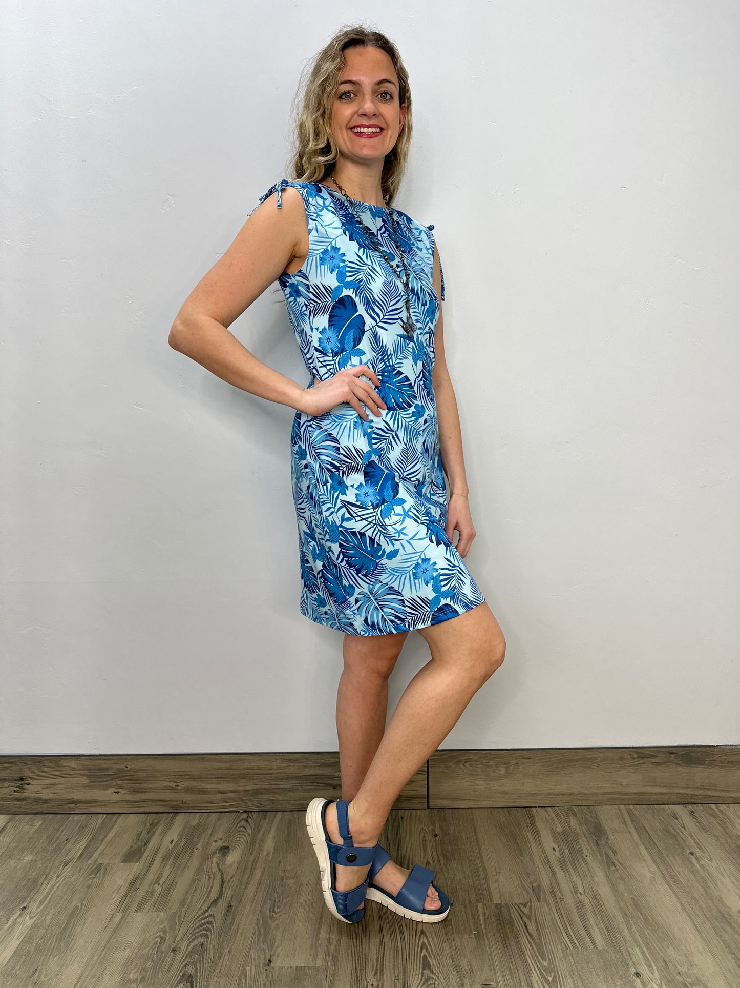 Elevate your wardrobe with our Blue Palm Leaves Cap Sleeve Dress! Stand out in the striking palm pattern and feel comfortable in its high neck and cap sleeves. Knee-length for a versatile look. Say yes to style and comfort in one!