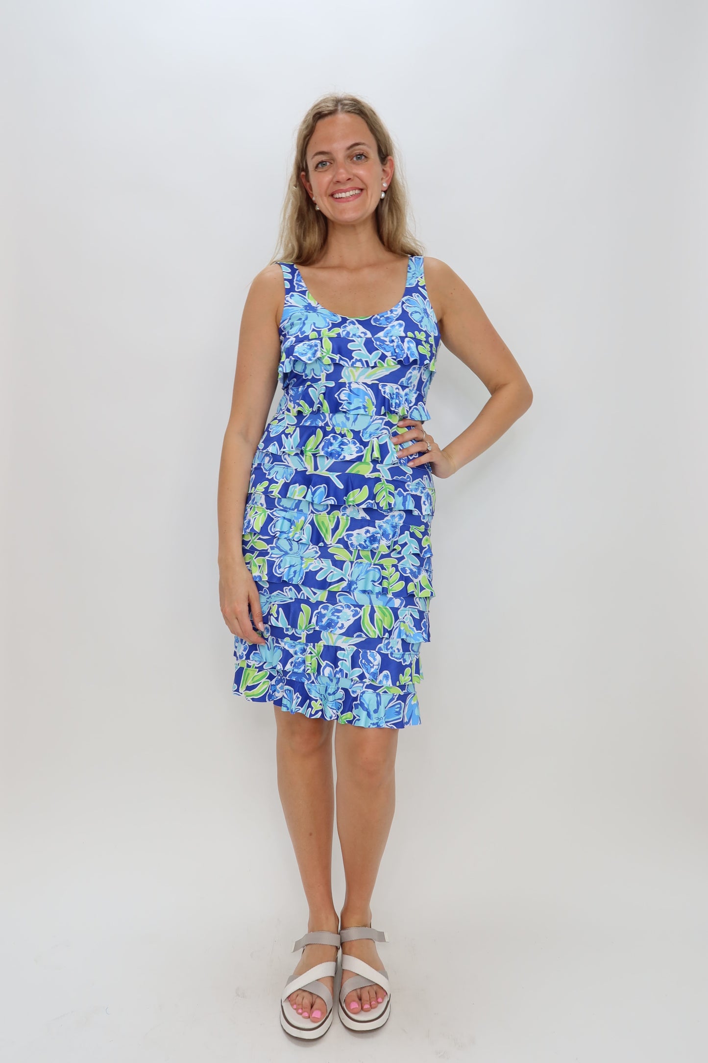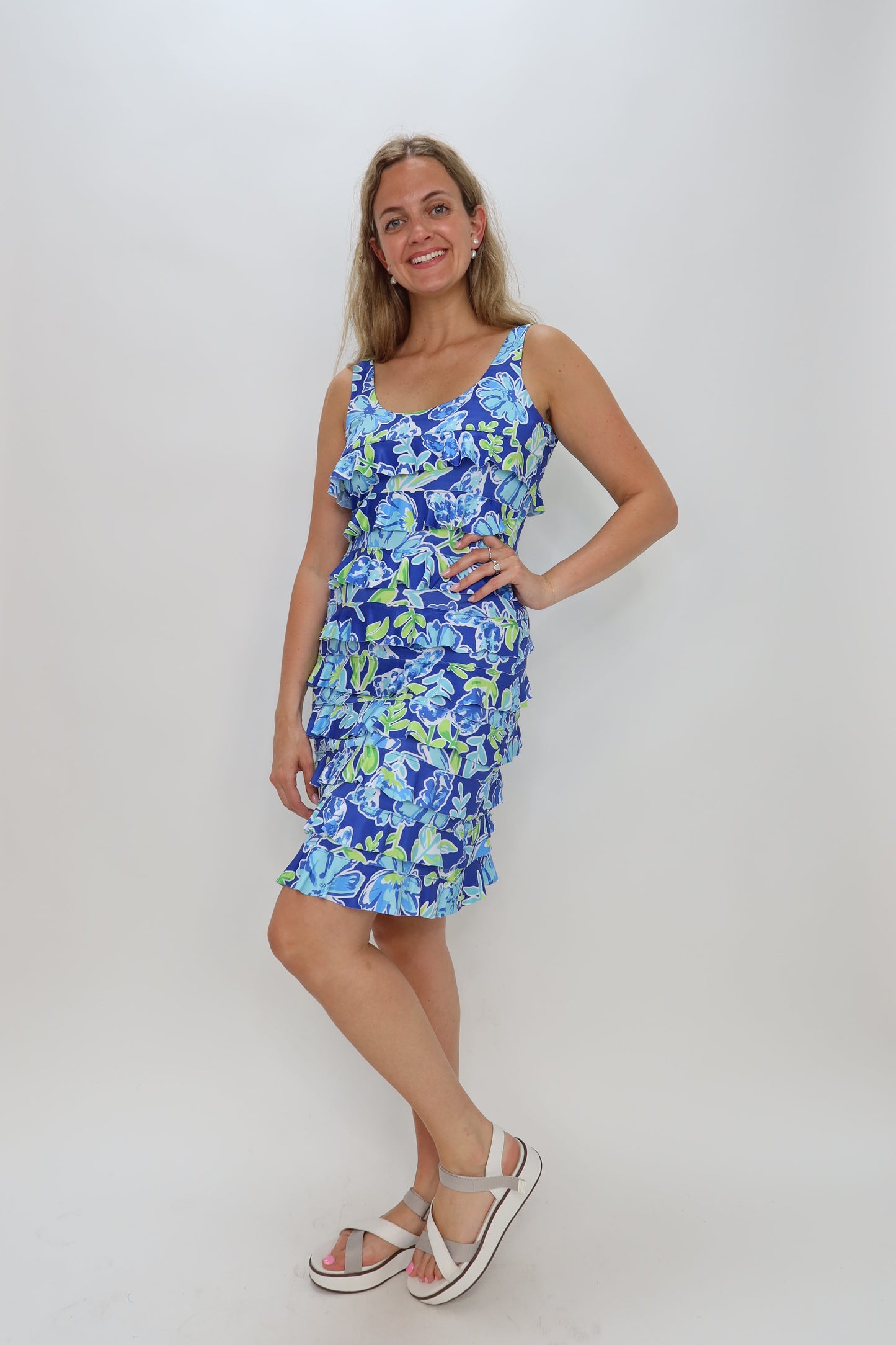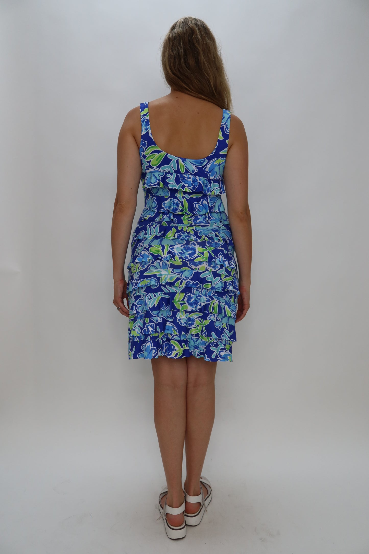 Blue and Green Floral Sleeveless Mesh Ruffle Dress