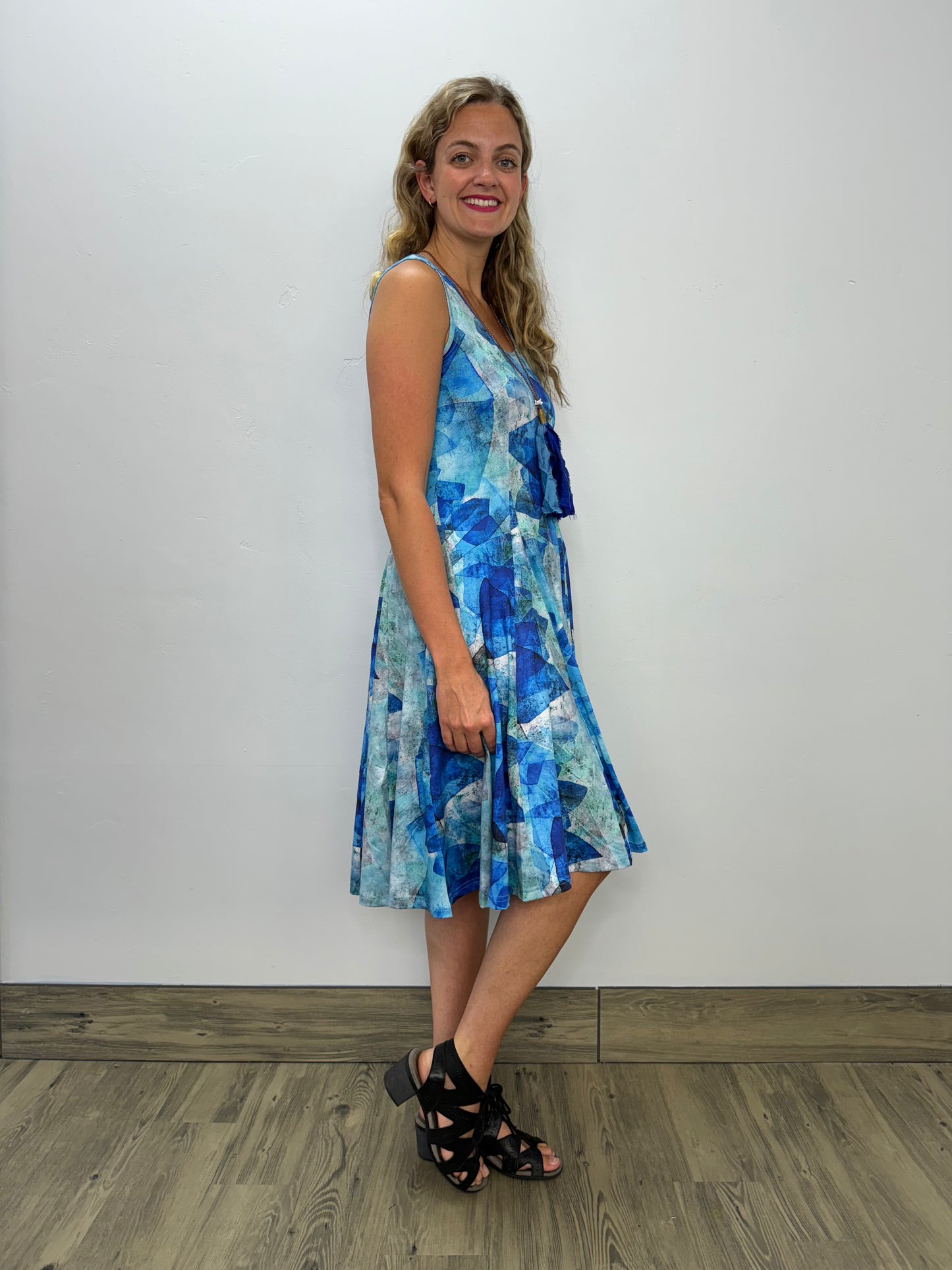 Introducing the Blue Watercolor Sleeveless Scoop Neck Bubble Dress! Feel confident and chic in this beautiful tango mango dress with a pretty blue pattern. With 8 ties underneath, easily transform the dress for a longer and flowy style. Perfect for any occasion, this dress will be your go-to choice!