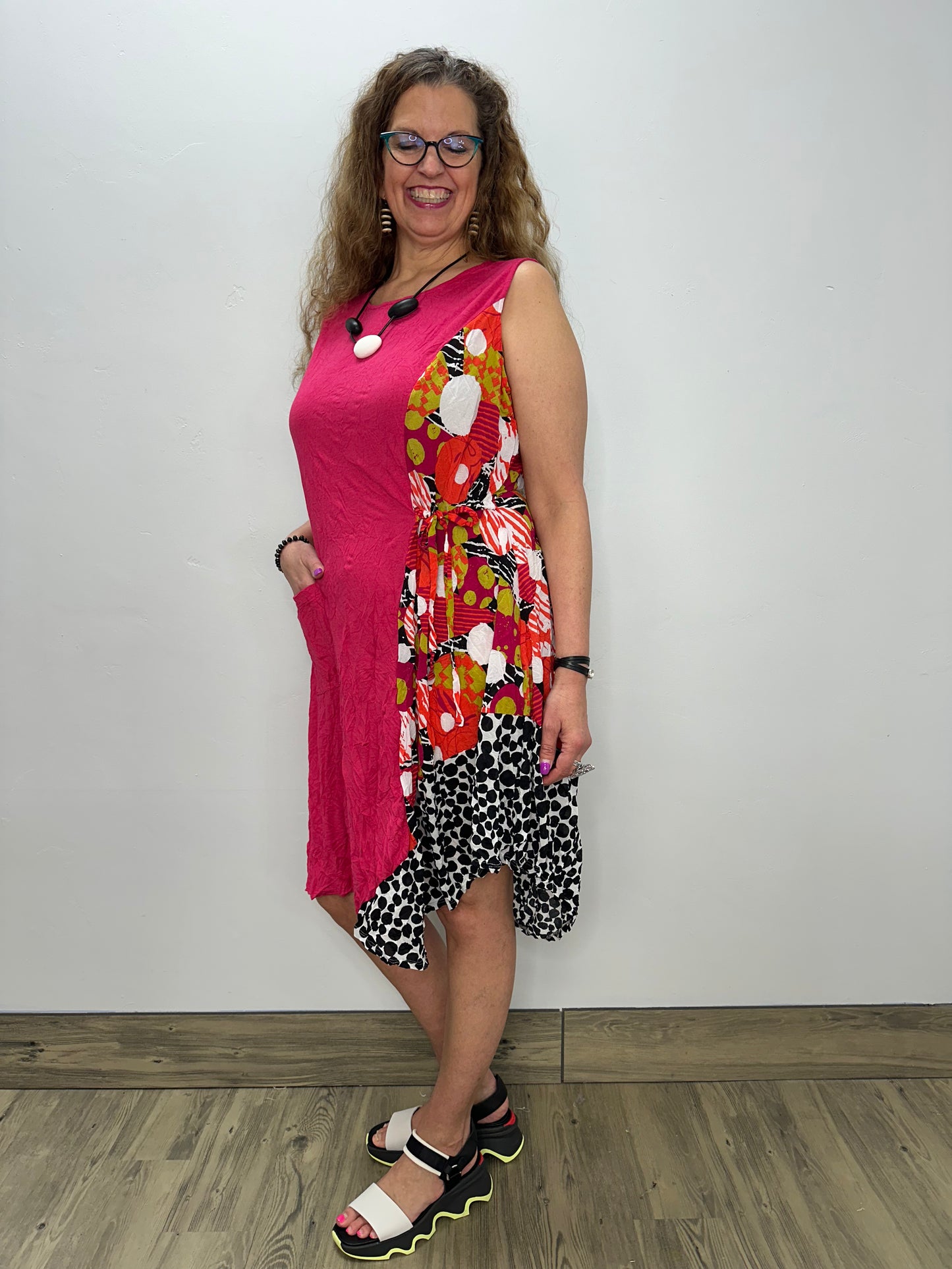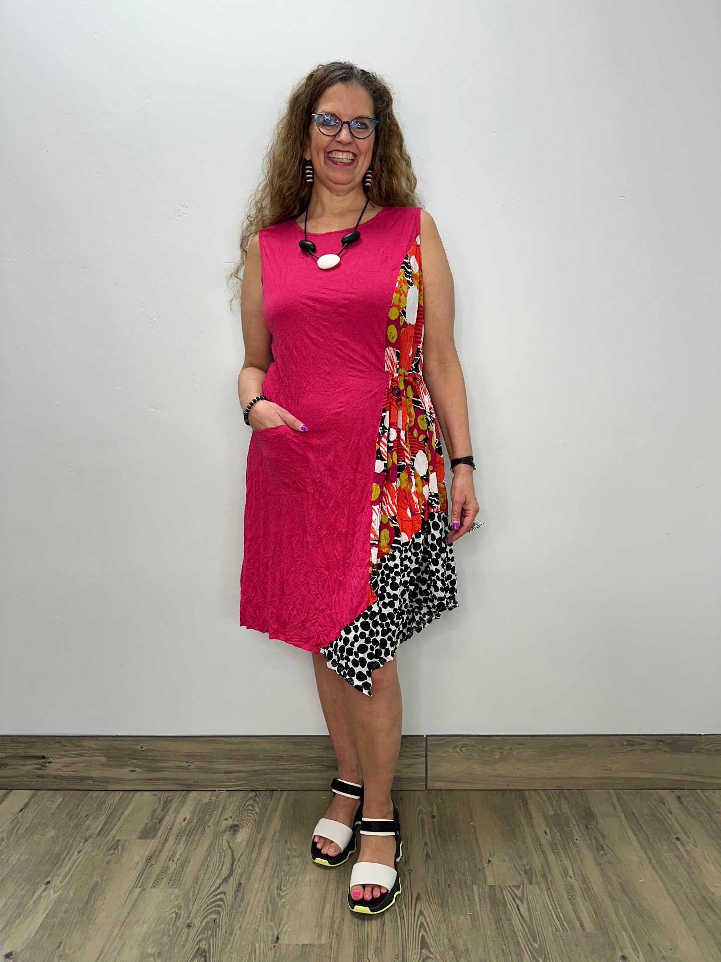 Regular price $151.20Always ready to show off at a garden party or elegant dinner, the Fuchsia Pink Pattern Sleeveless Crinkle Mesh Dress models comfort when it comes to its rounded neckline and A-line silhouette in our crinkle jersey fabric, all the while its breathtaking contrasting design of crinkle mesh dots print. Allowing it to pair beautifully with the asymmetrical hem, front patch pocket, and cinched drawstring detail.