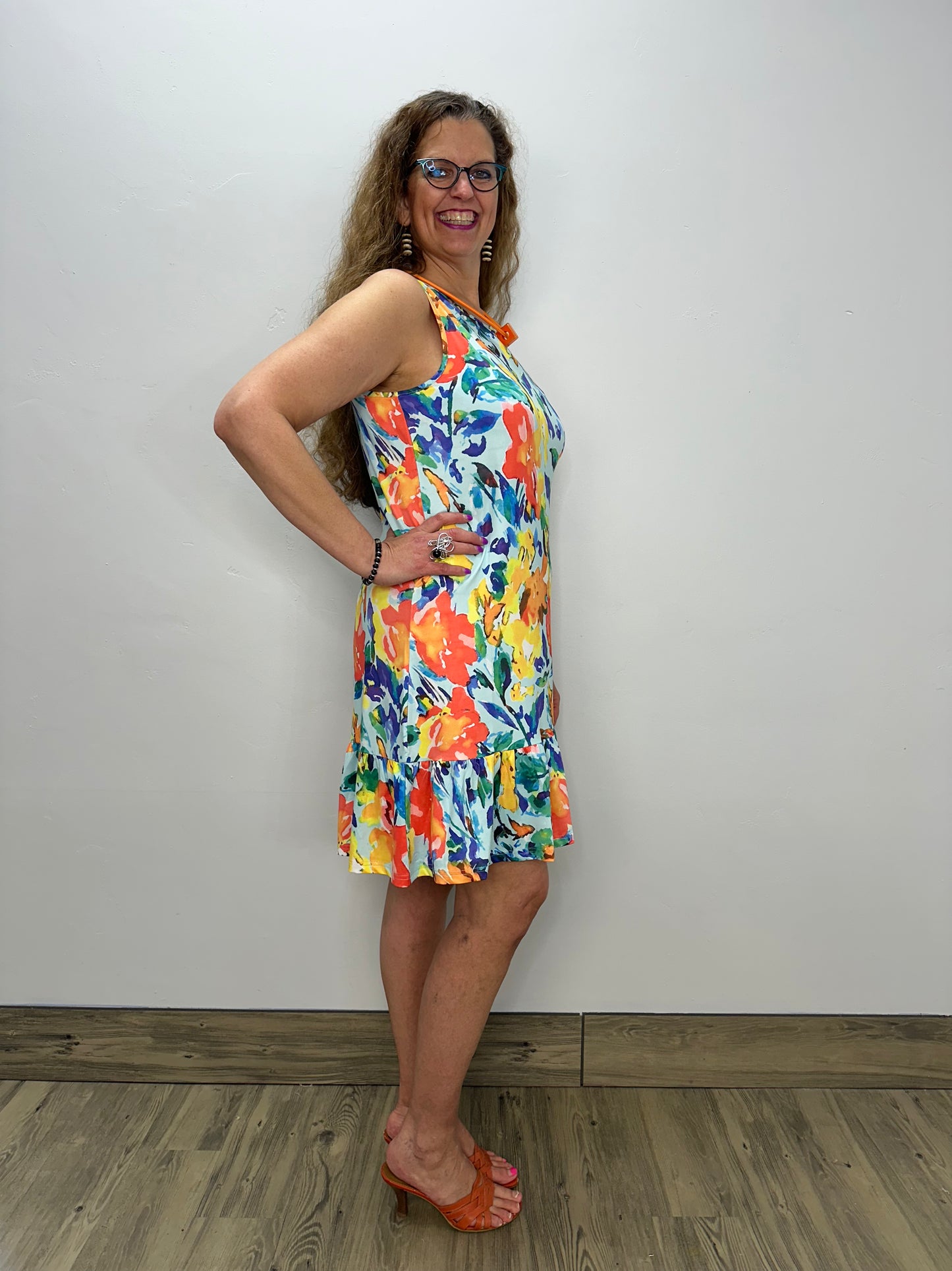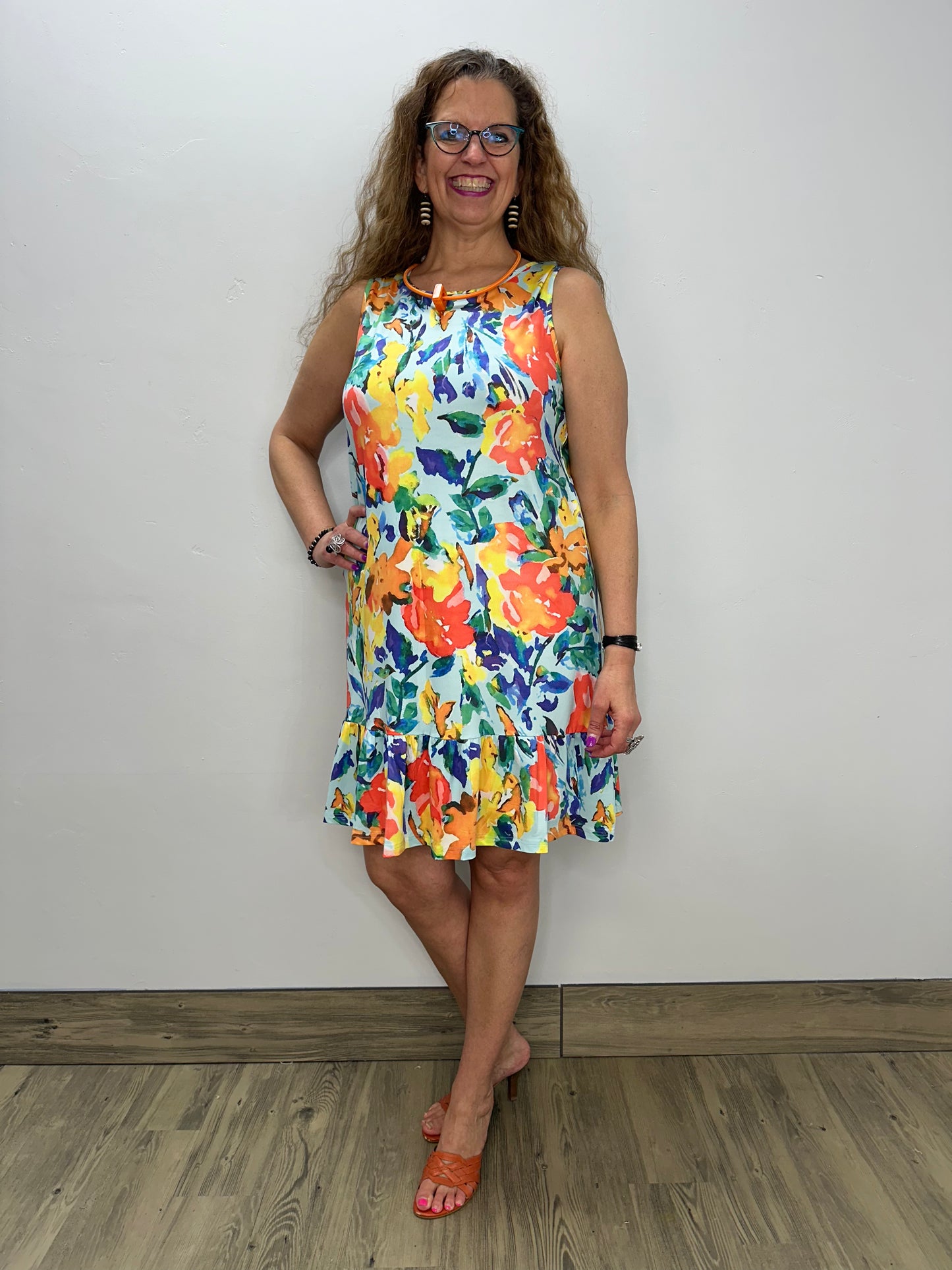 Get ready to turn heads in our Tango Mango Orange and Blue Floral Scoop Neck Sleeveless Aline Dress! With a playful ruffle detail at the bottom, this dress is both fun and cute! Perfect for spring, you'll feel adorable and stylish in this dress. Embrace the season in style with this must-have addition to your wardrobe.