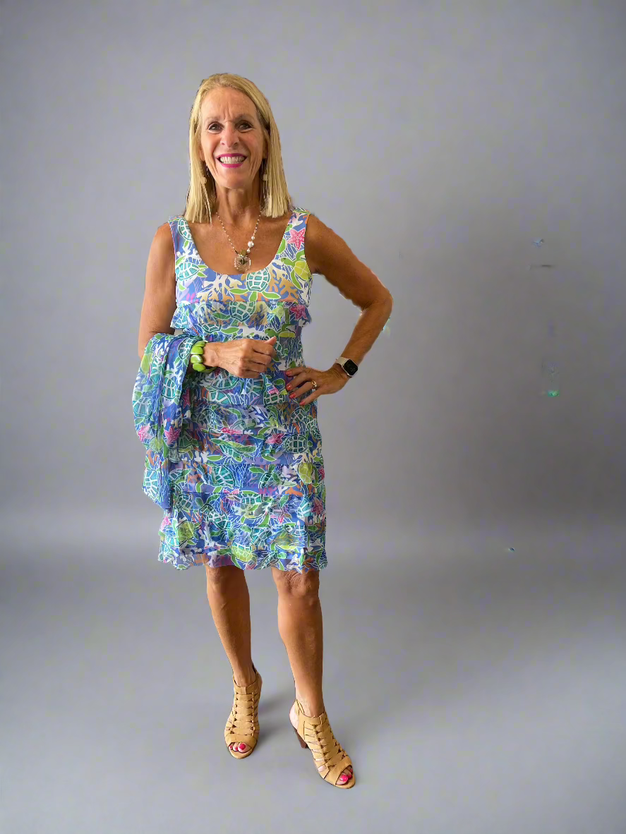 Turtle Pattern Sleeveless Mesh Ruffle Dress