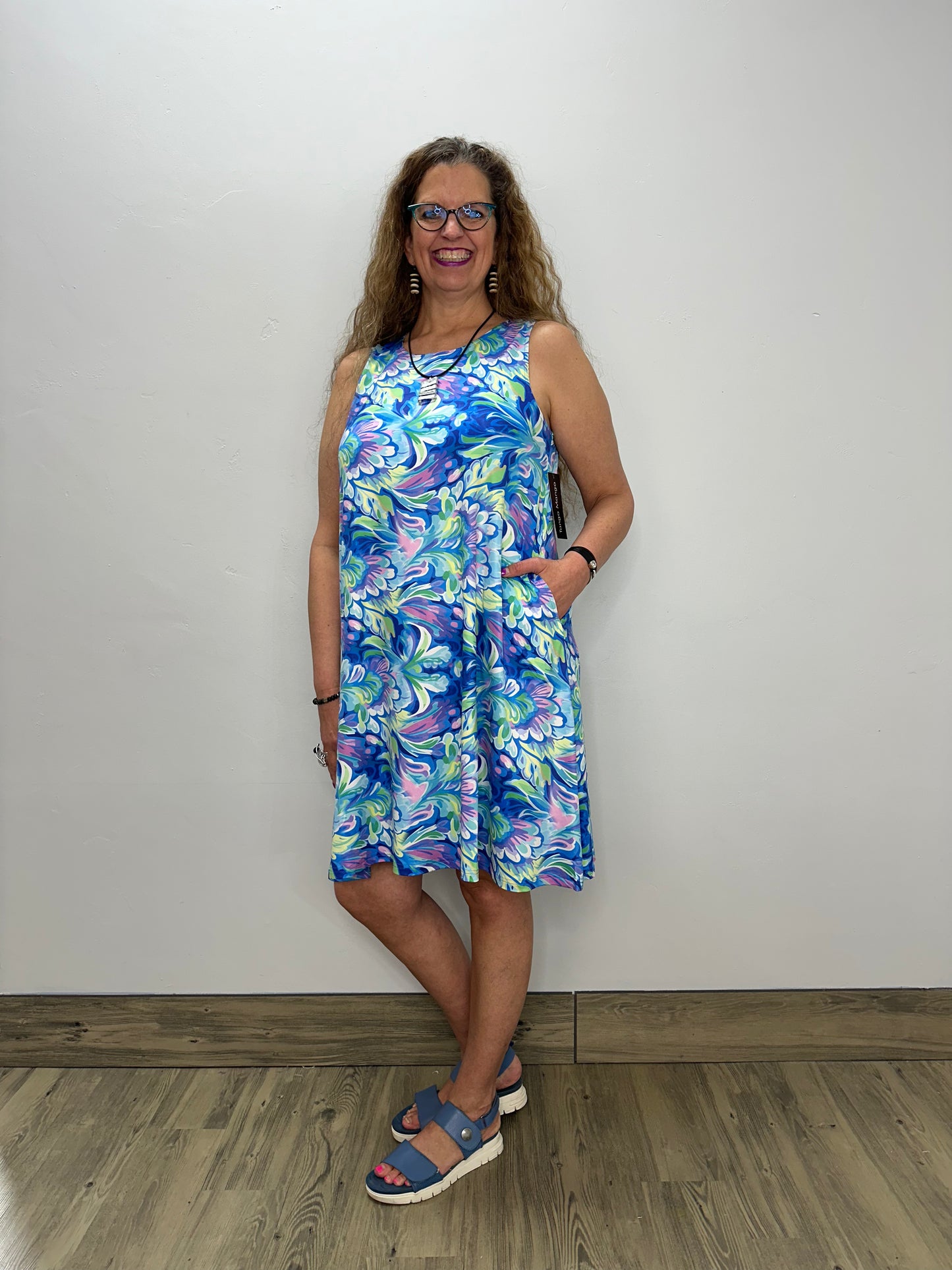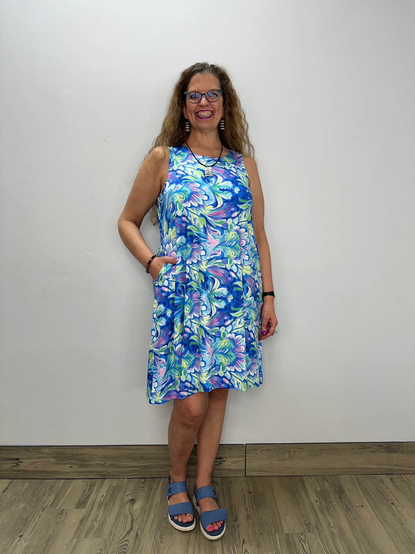 Blue and Purple Floral Pattern Sleeveless Aline Dress with Keyhole