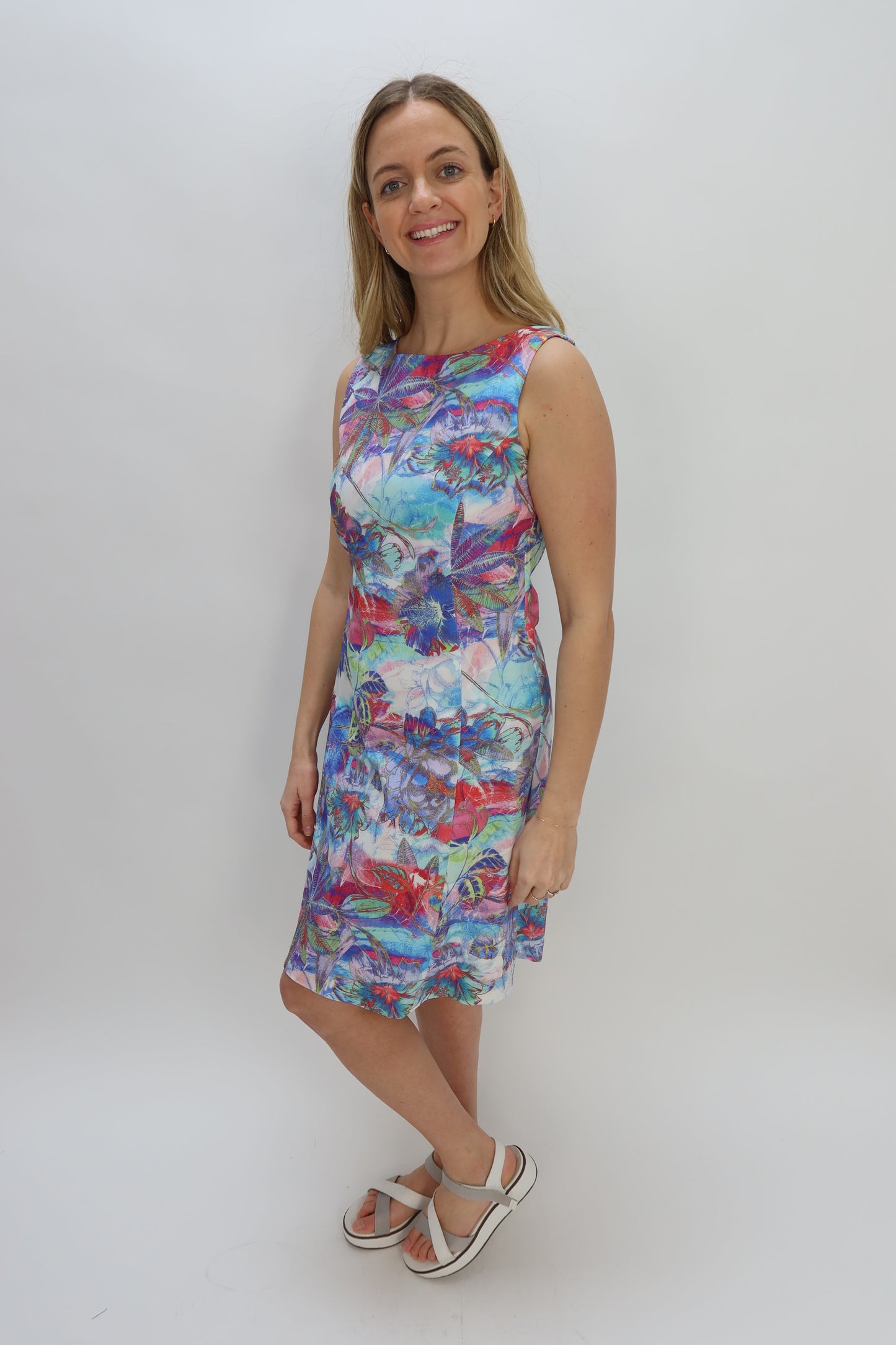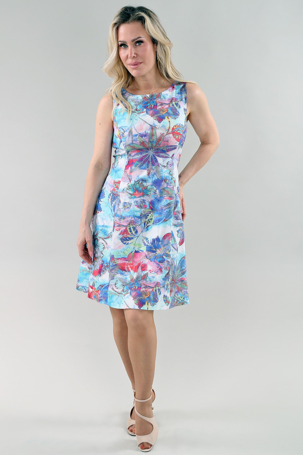 Blue and Pink Floral Sleeveless Flared Dress