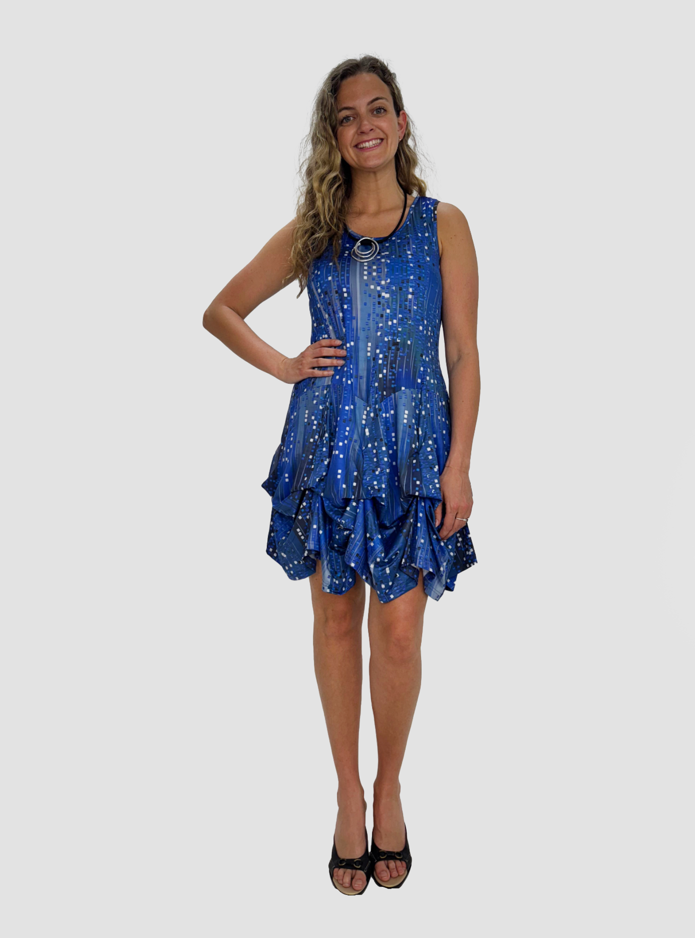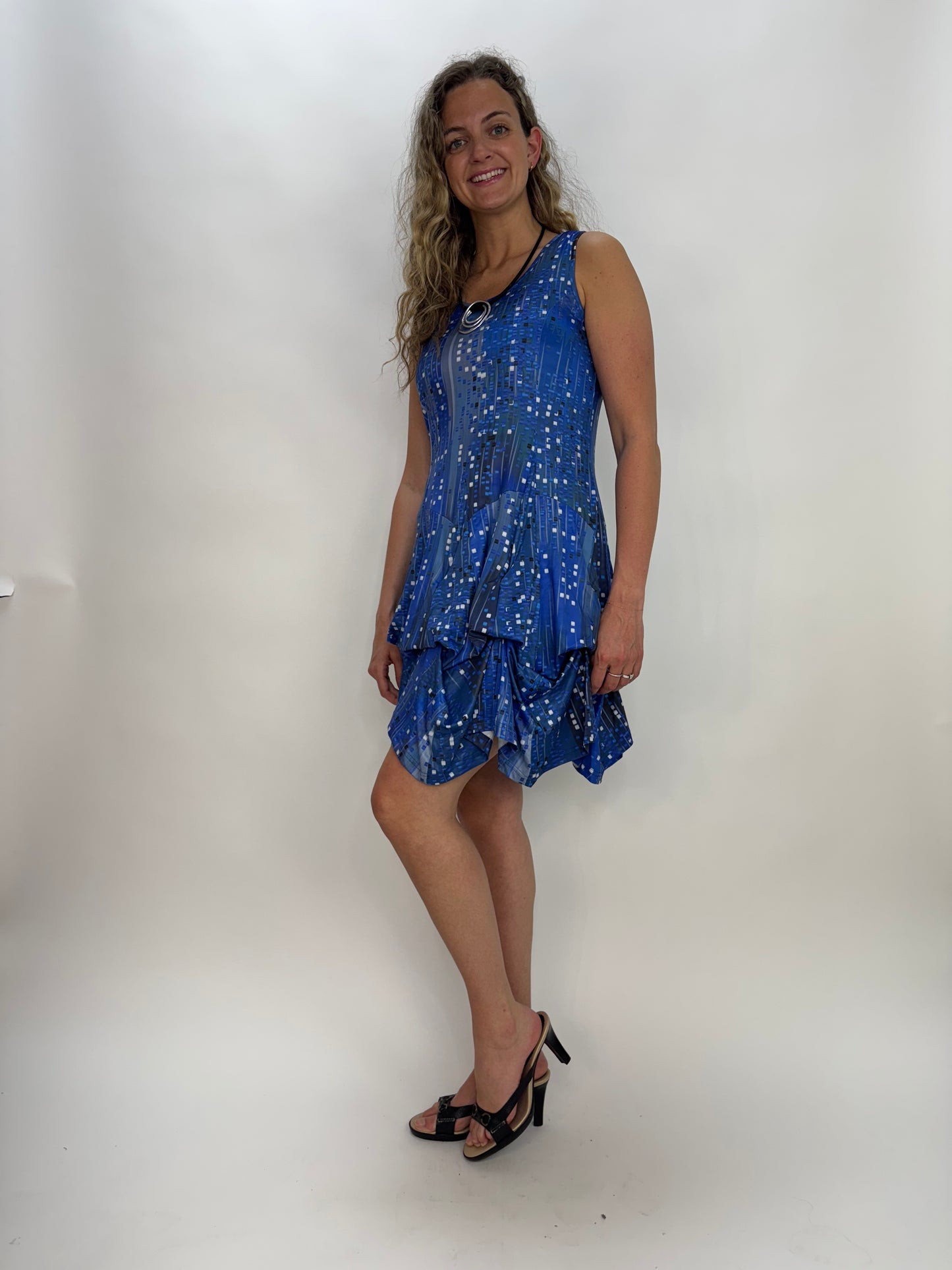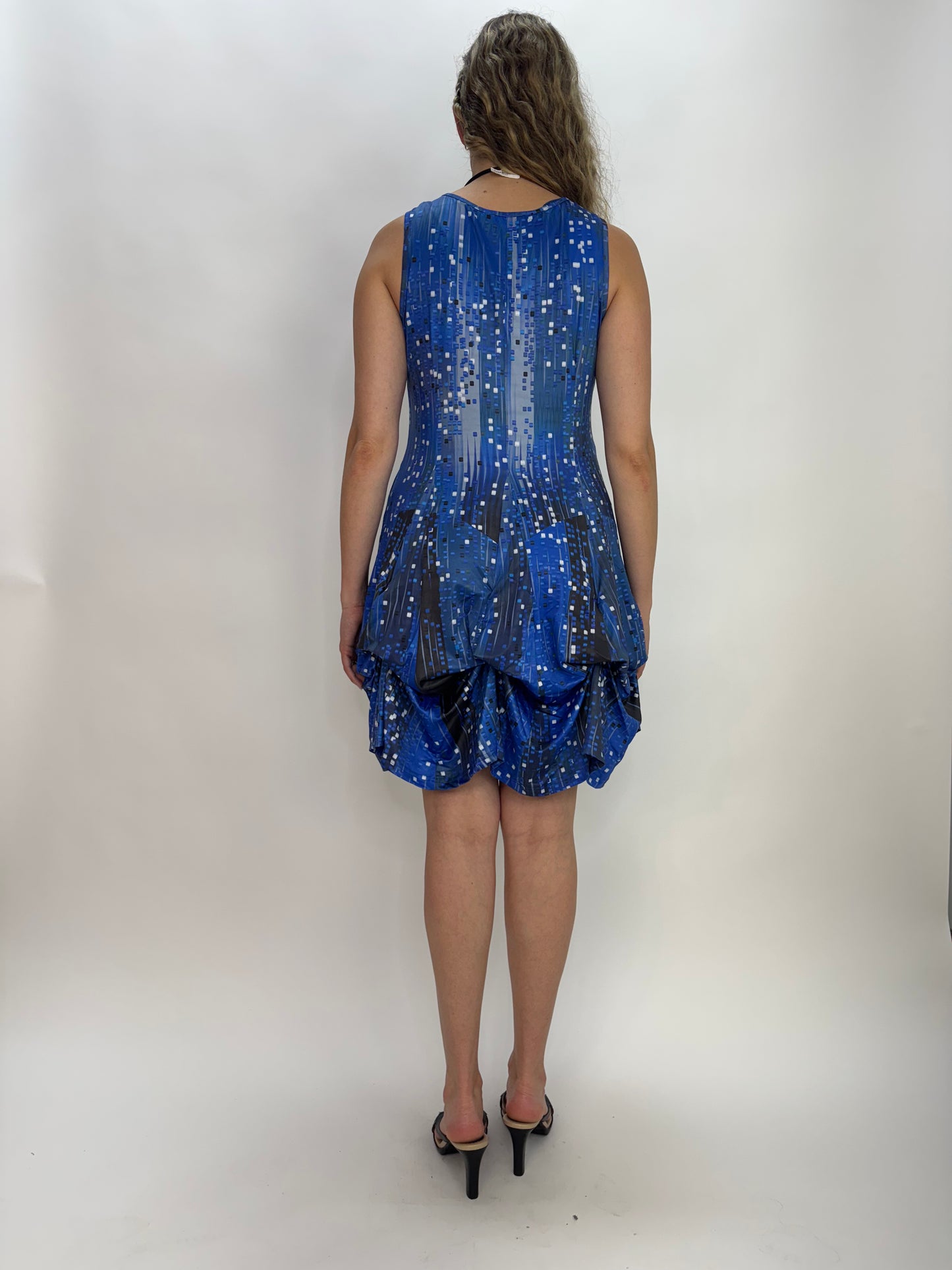 Introducing the Blue Night Sleeveless Bubble Dress! Feel confident and chic in this beautiful Tango Mango dress with a beautiful cool blue pattern. With 8 ties underneath, easily transform the dress for a longer and flowy style. Perfect for any occasion, this dress will be your go-to choice!