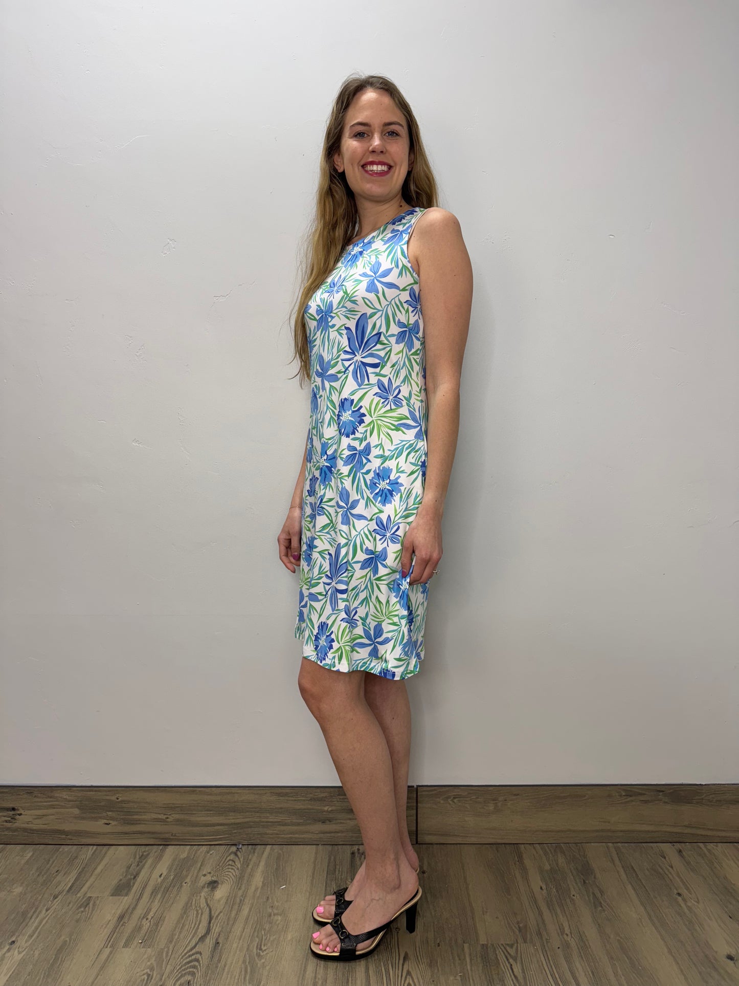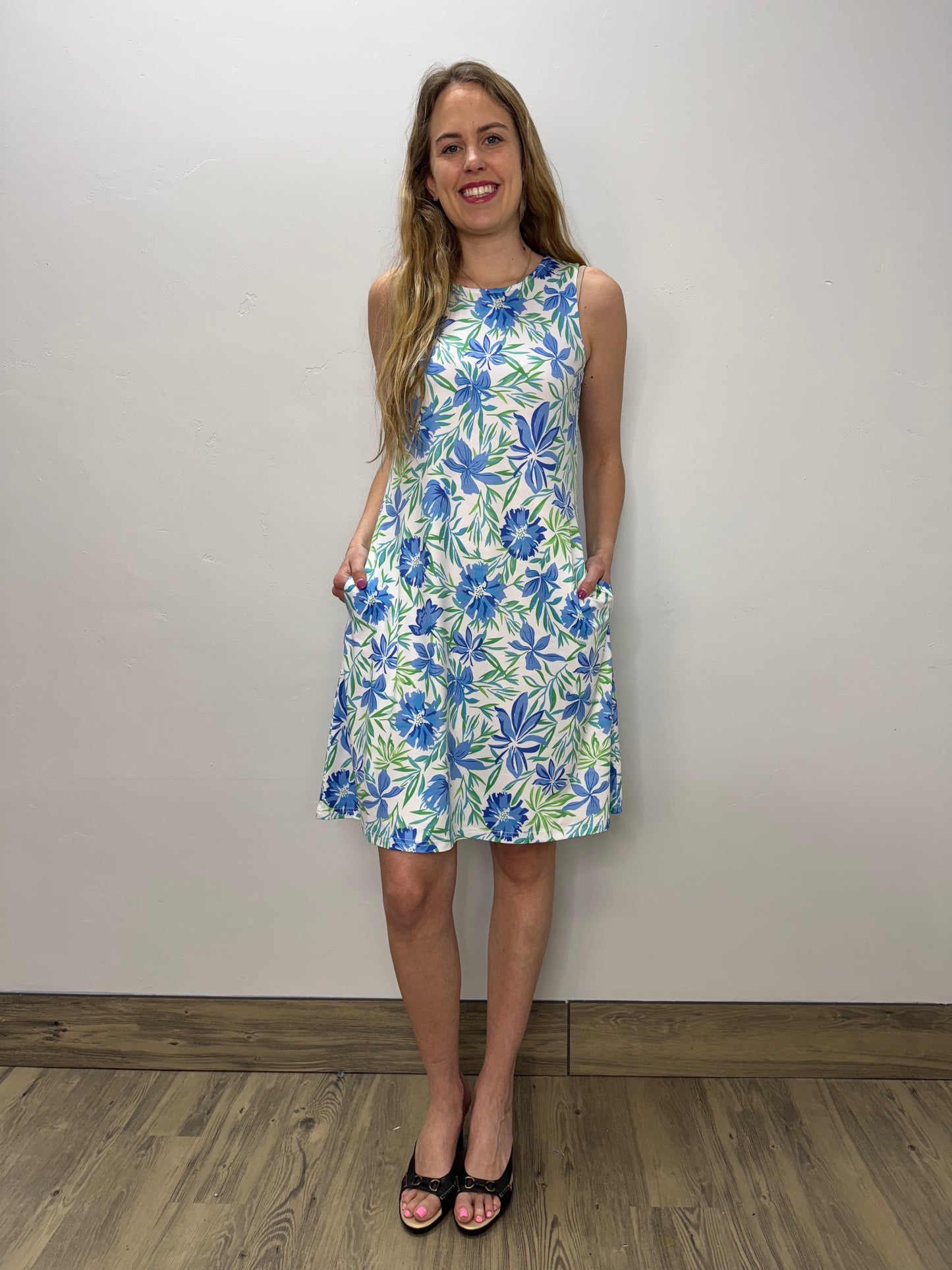 Blue Floral Pattern Sleeveless Aline Dress with Keyhole