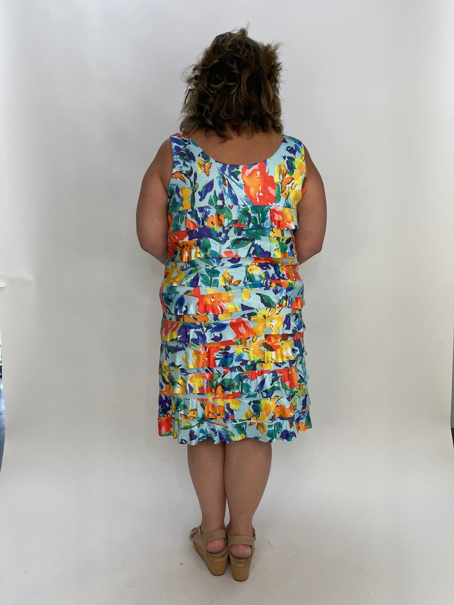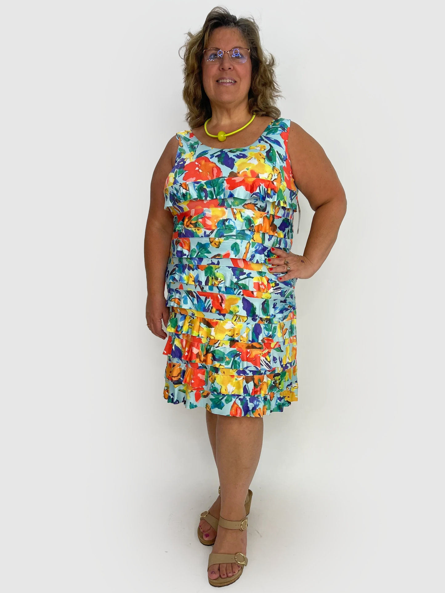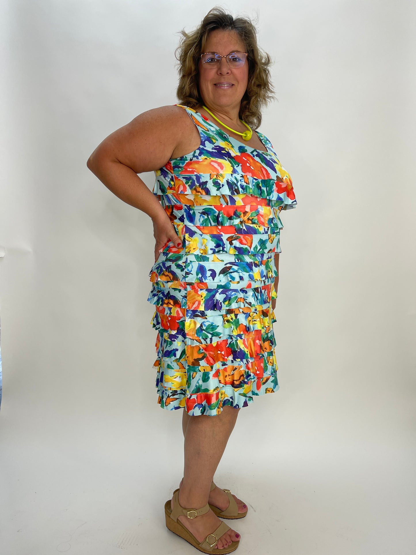 The Colorful Watercolor Sleeveless Ruffle Dress features a flattering, close-fitting silhouette that enhances your natural shape. Designed to fit true to size, this vibrant dress combines playful ruffles with a lively floral pattern, making it perfect for any occasion where you want to stand out with style and confidence!