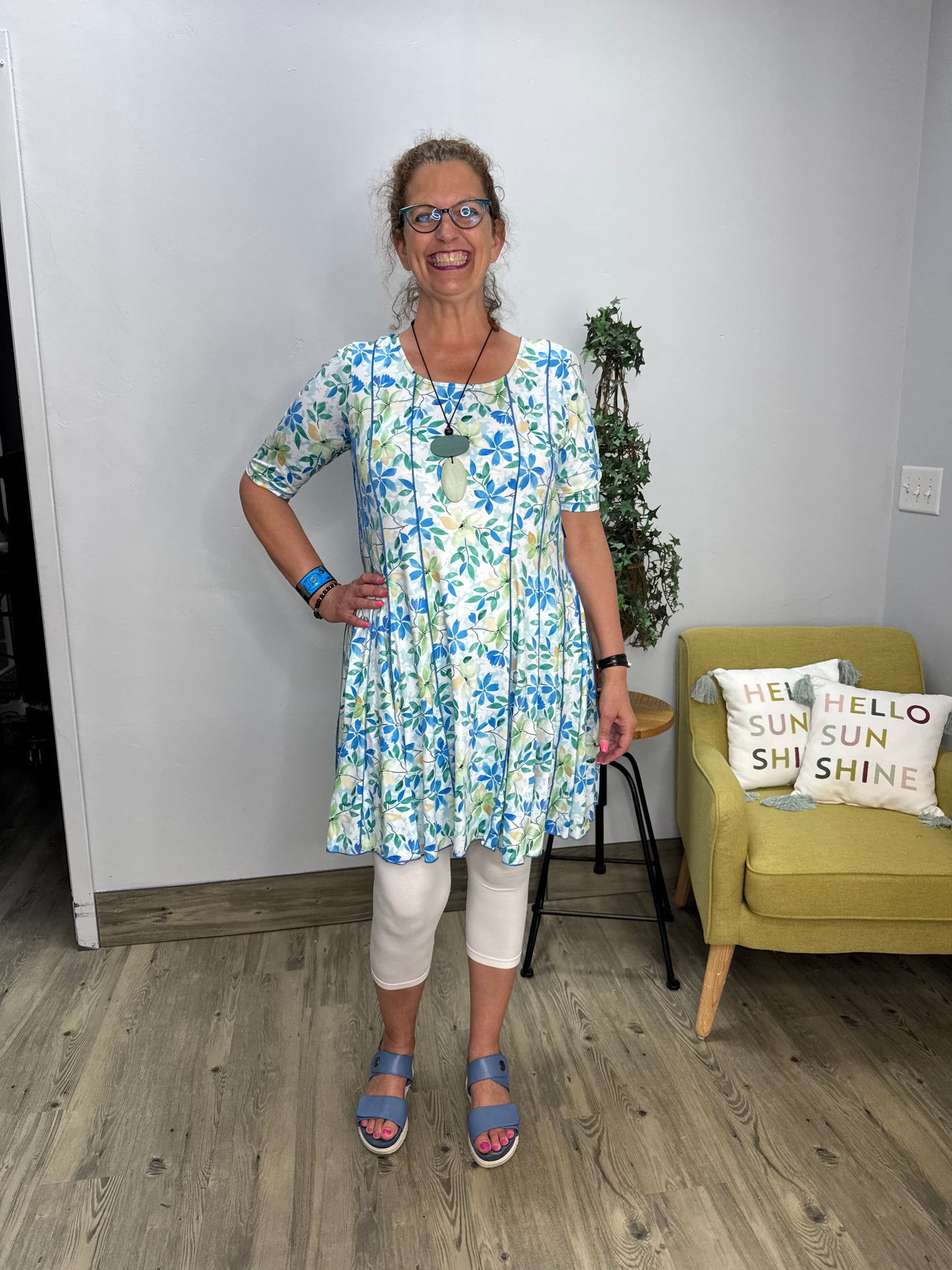 Experience luxury and comfort with our Elbow Sleeve Floral Merrill Edge Dress! The elbow sleeves and scoop neck provide a flattering silhouette, while the Merrill Edge seaming adds a touch of elegance. The knee length design and UPF 50 fabric make this dress a perfect choice for any occasion. Look and feel your best with this must-have dress!