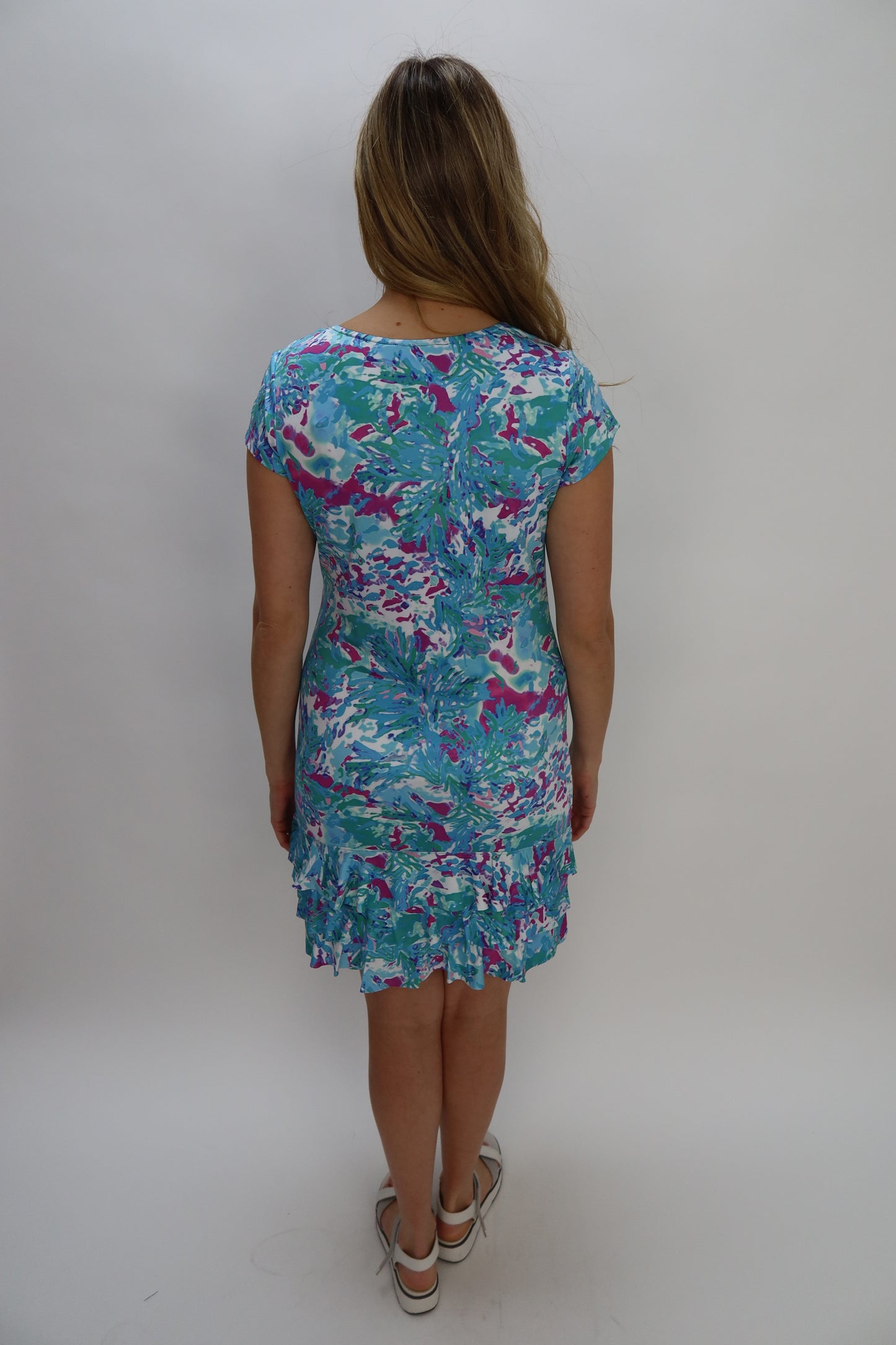 This Tango Mango shift dress comes with a scoop neckline, cap sleeves and a fun tropical pattern. The dress falls to a tiered ruffle hemline with lettuce edging. Includes a built-in slip.