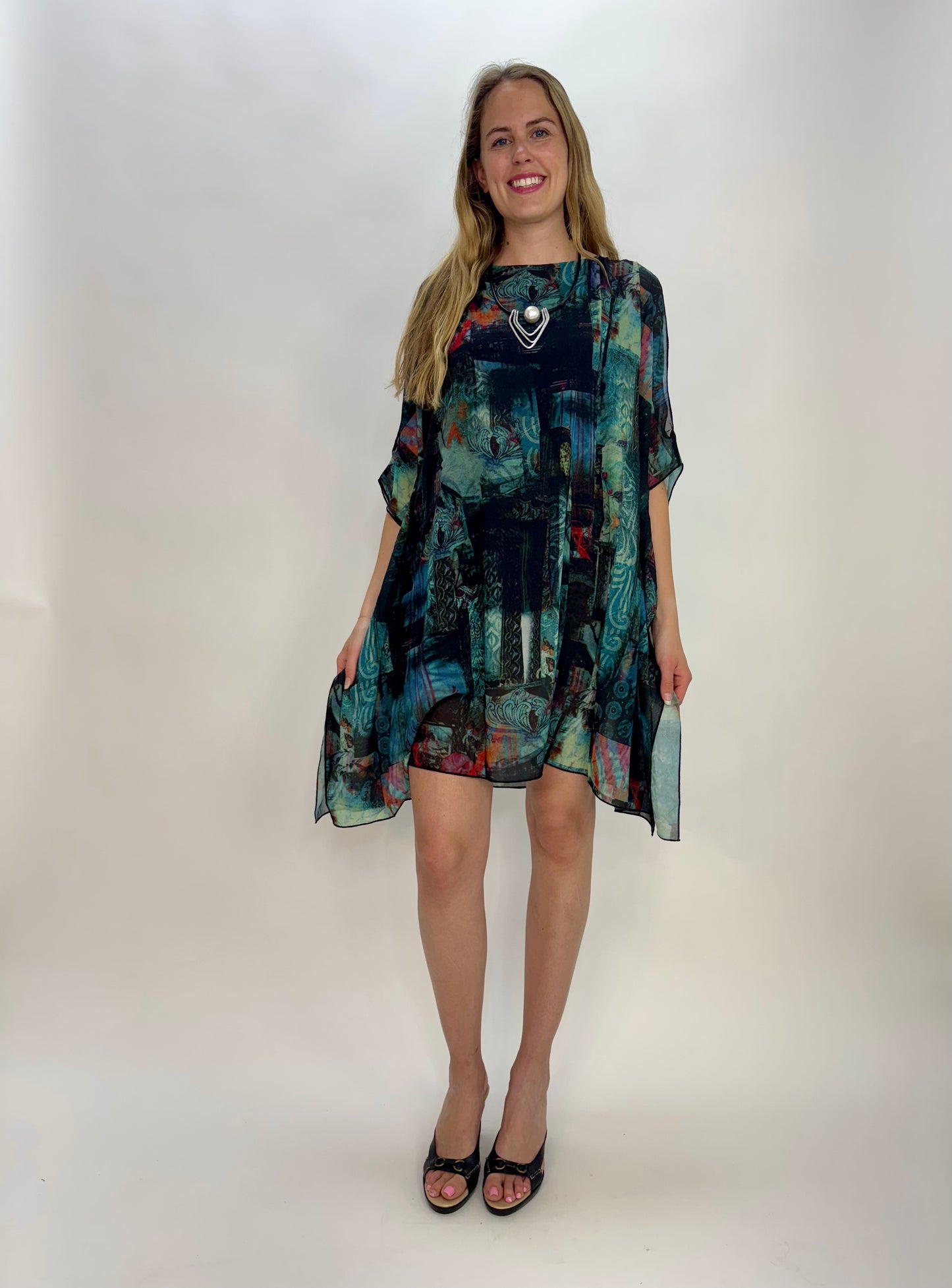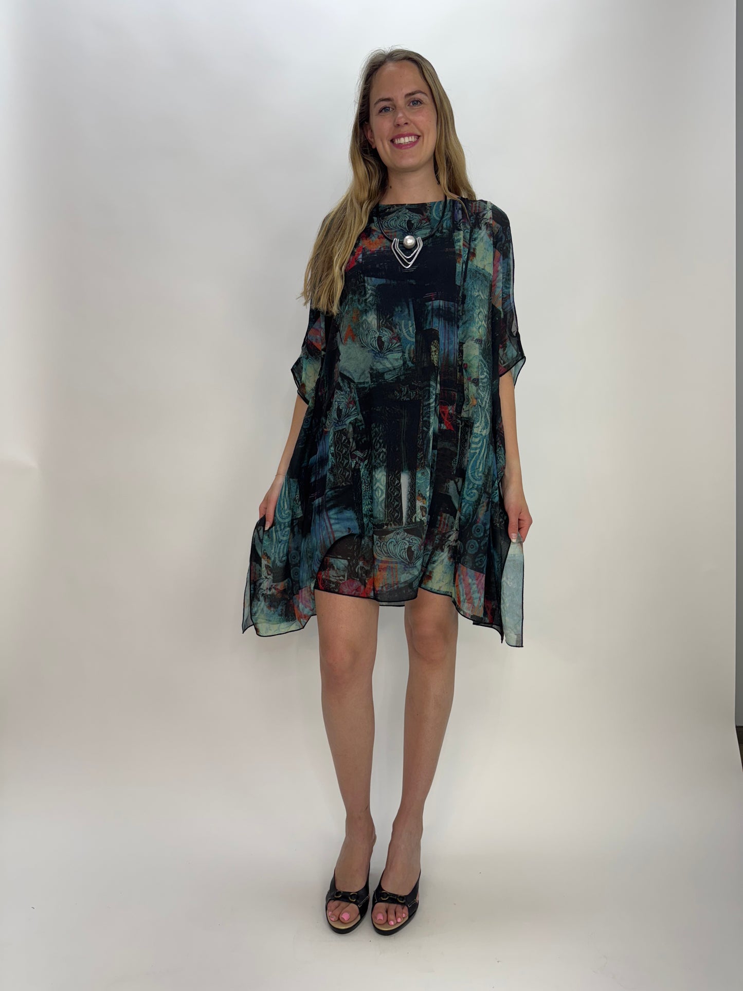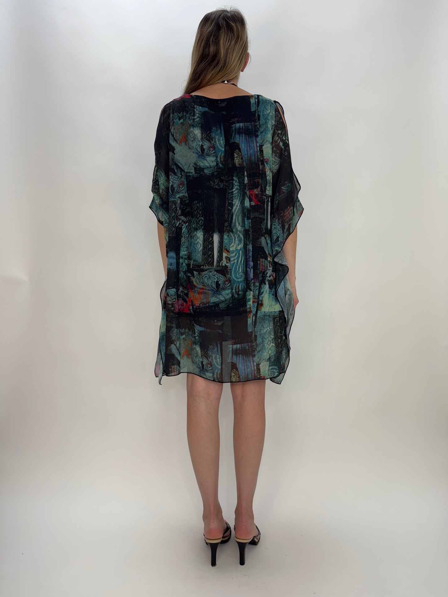Elevate your style with this elegant Teal Watercolor Double Layered Chiffon Dress. Featuring wide arms and a graceful scoop neck, it beautifully highlights open shoulders for a sophisticated, dressy look. The flowing chiffon layers add movement and charm, making it perfect for special occasions where you want to stand out with effortless elegance.