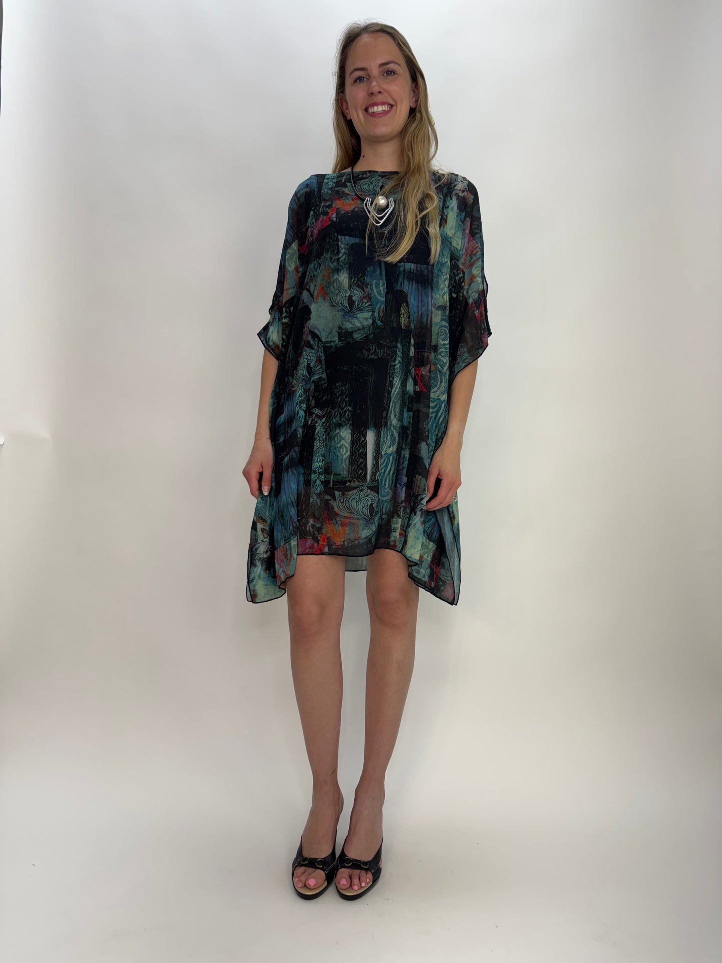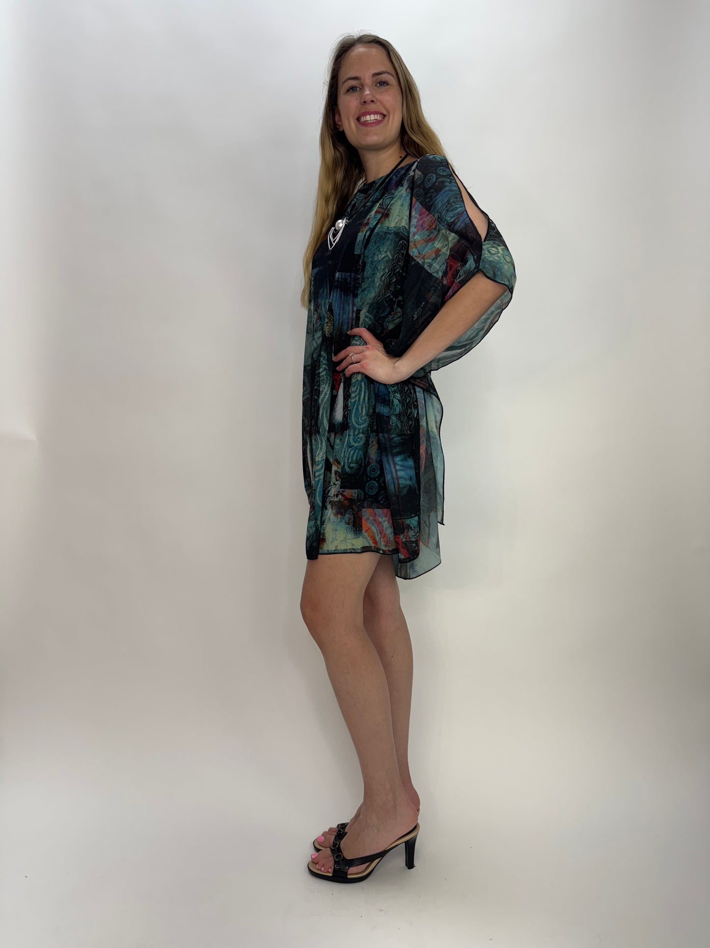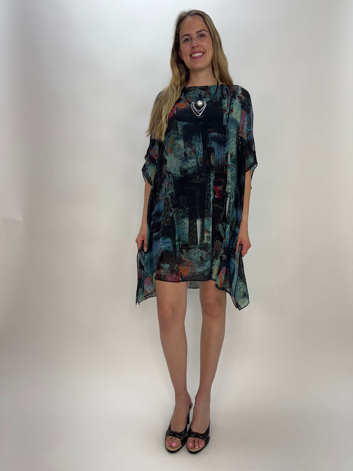 Elevate your style with this elegant Teal Watercolor Double Layered Chiffon Dress. Featuring wide arms and a graceful scoop neck, it beautifully highlights open shoulders for a sophisticated, dressy look. The flowing chiffon layers add movement and charm, making it perfect for special occasions where you want to stand out with effortless elegance.