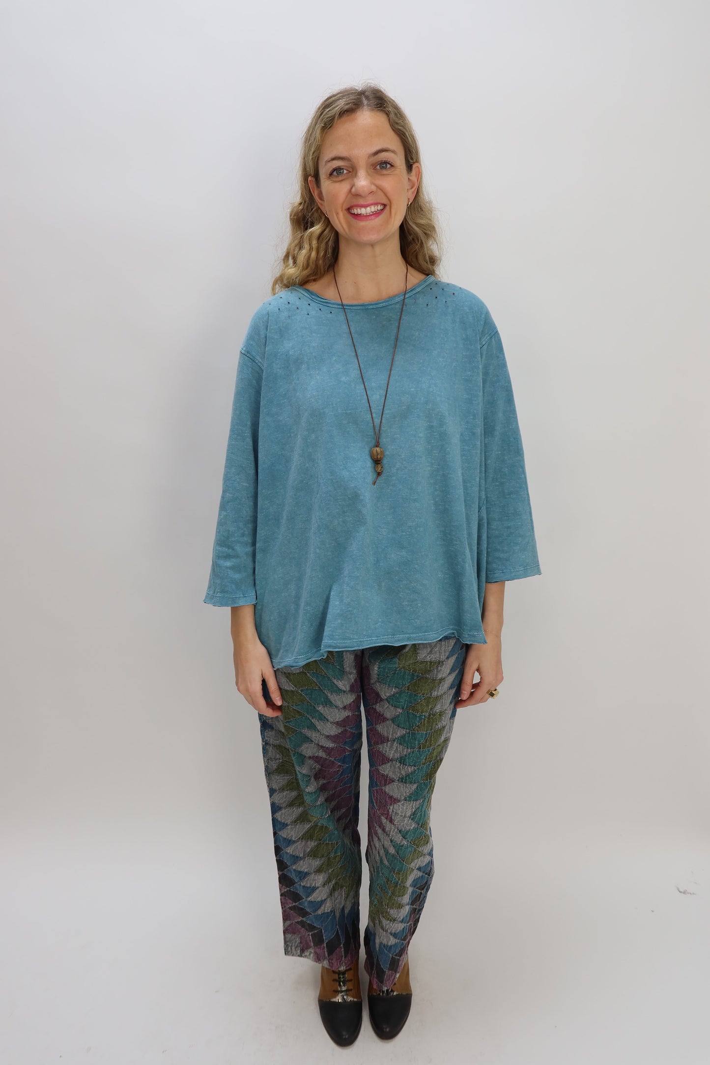 Sapphire Mineral Washed 100% Cotton Long Sleeve Cowl Neck Top