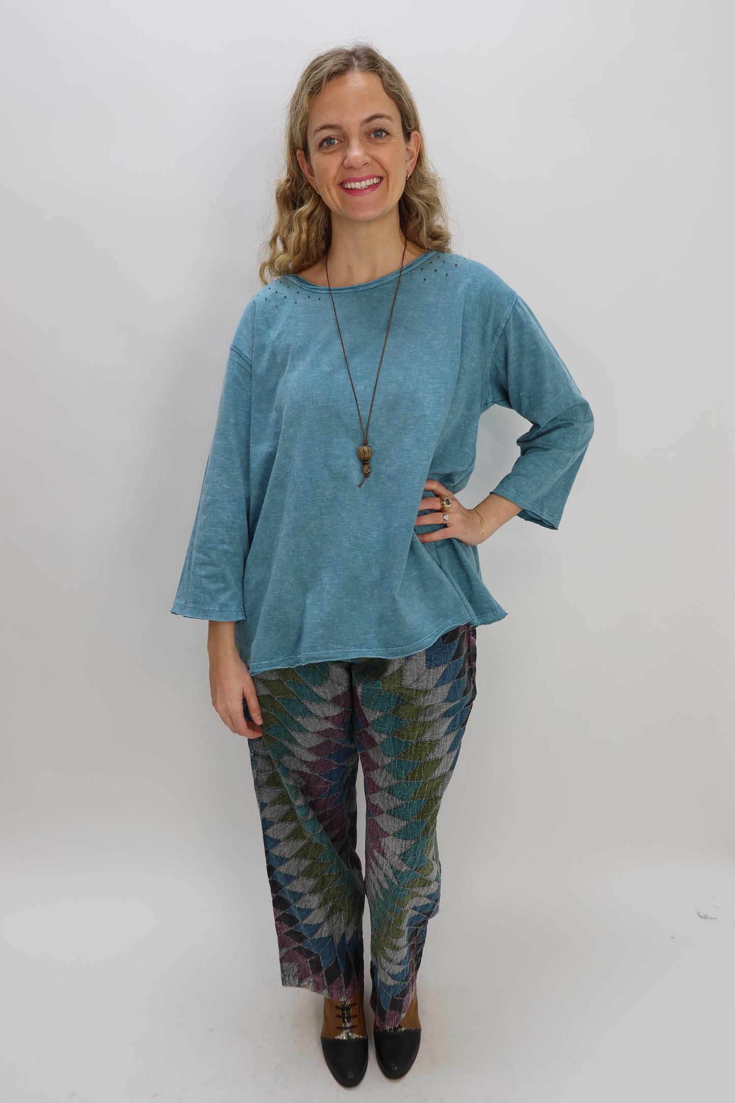 Teal Novelty Brush Overlap Hemline Top with Buttons