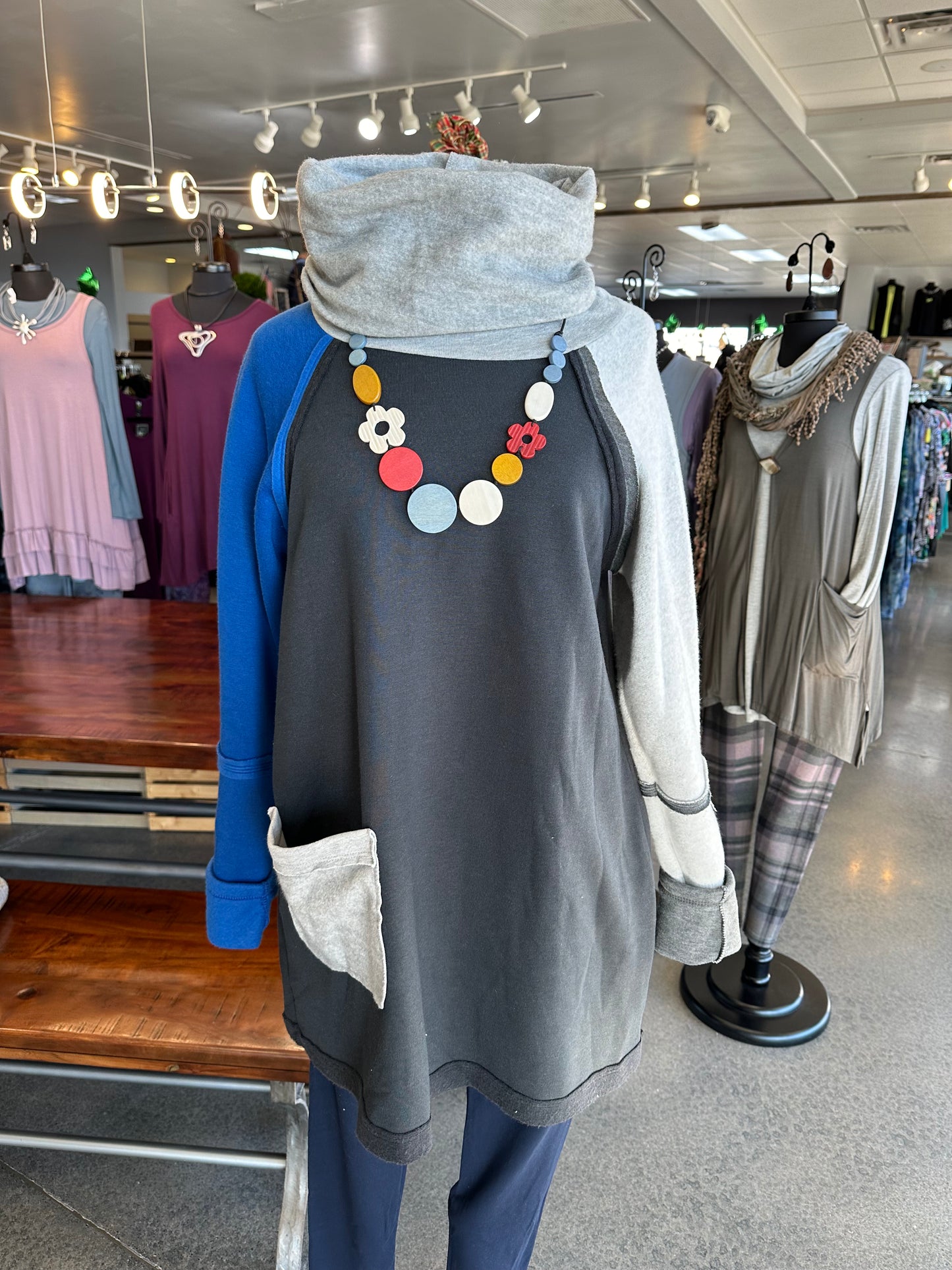 Designed by Twist Boutique owner Trish, the new Colorado flaunts a generous funnel neck that easily adjusts to your desired style to stay warm and cozy this season! Contrast raw seams and a right side patch pocket create added interest. Five inch sleeve cuffs allow you to roll them up to the look and length you prefer. Inside you'll find ultra soft fleece that keeps you comfy and cozy.