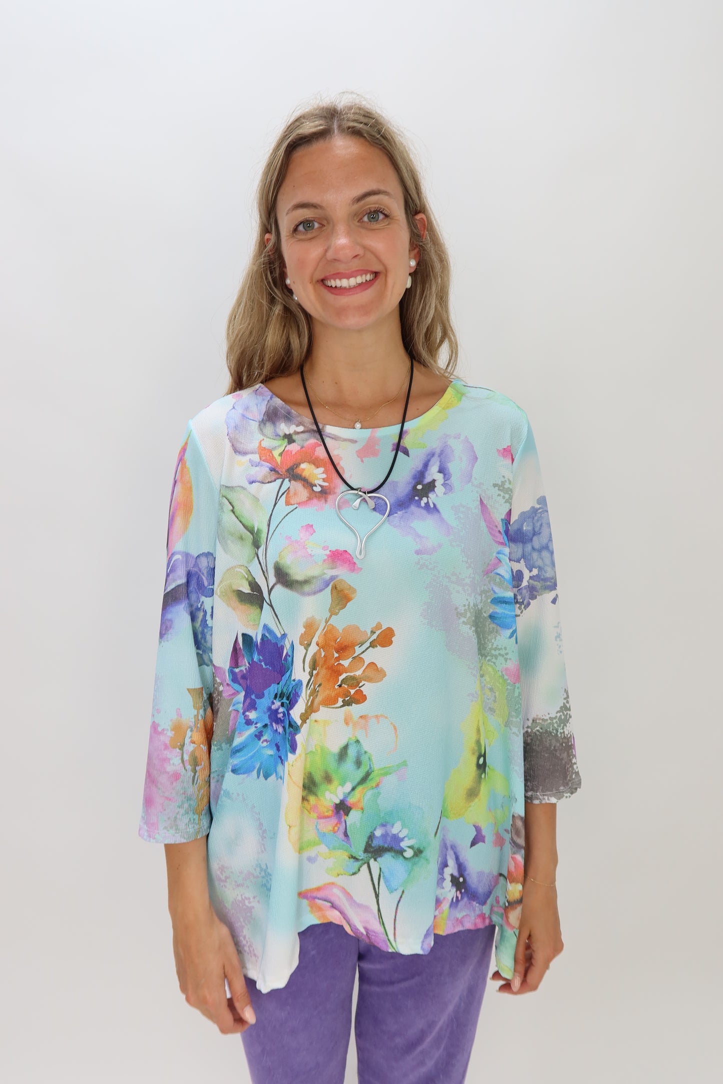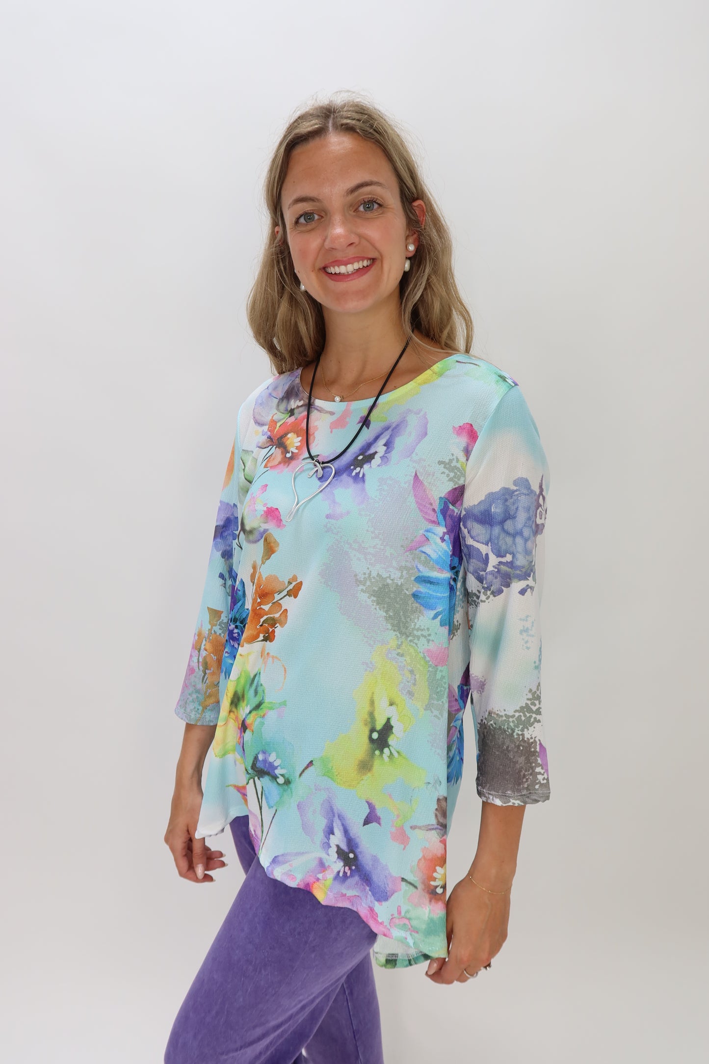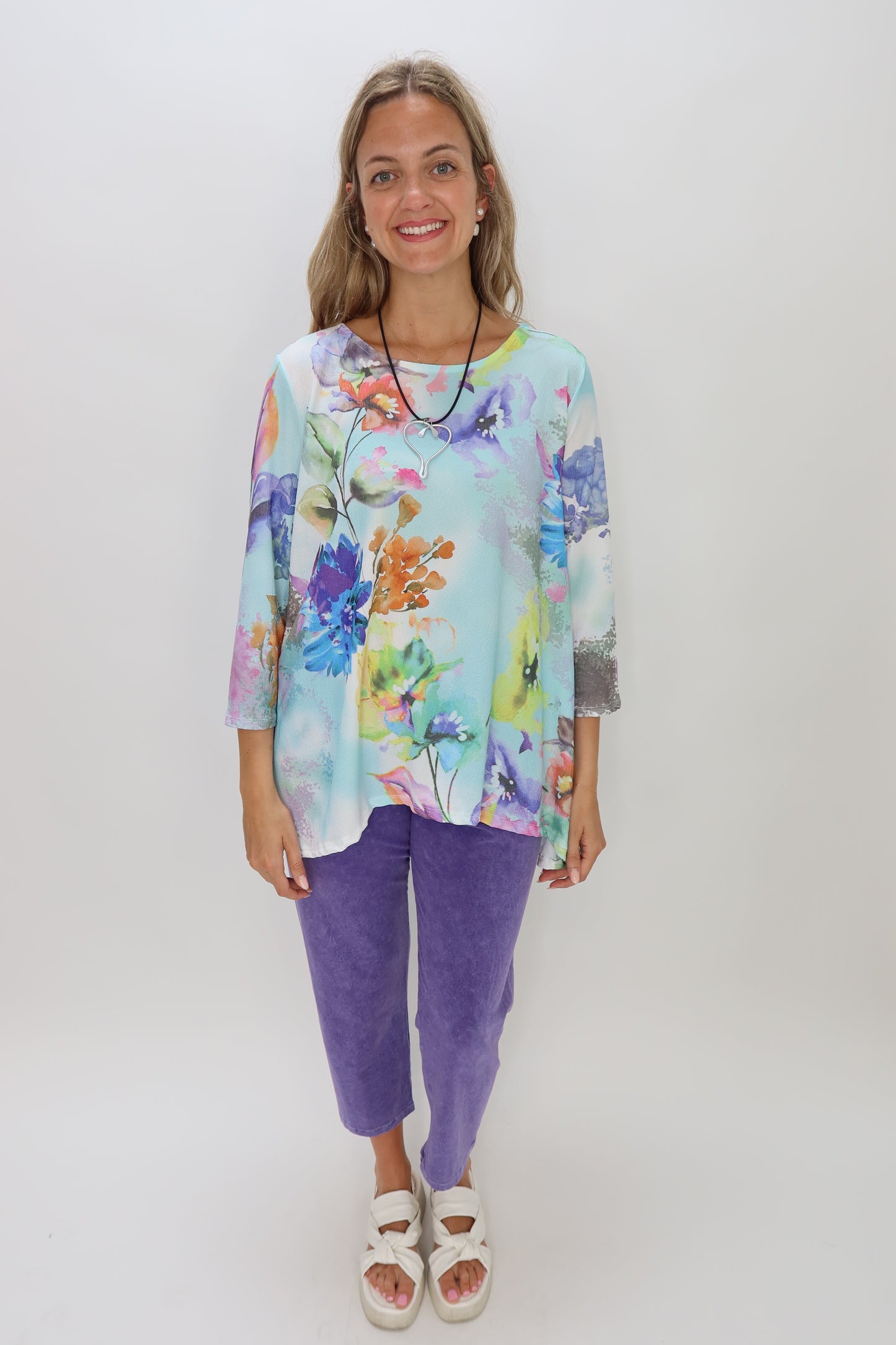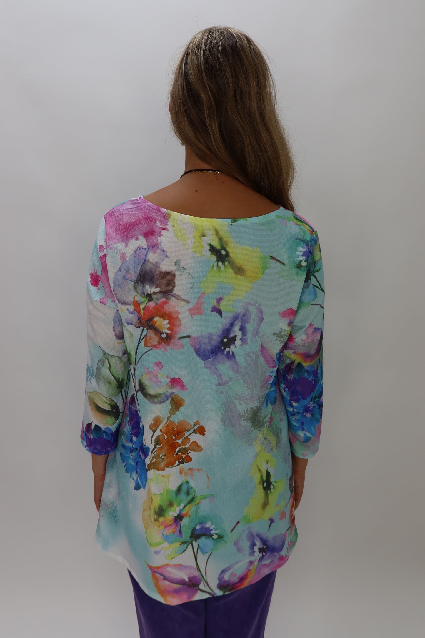 Experience comfort and style with this super soft Blue Floral Pattern Crepe Crew Neck Top. Featuring a flattering scoop neck and a delicate floral design set against a light blue background, it’s perfect for adding a fresh, feminine touch to your wardrobe. Ideal for both casual outings and dressier occasions, this top combines effortless elegance with everyday comfort.