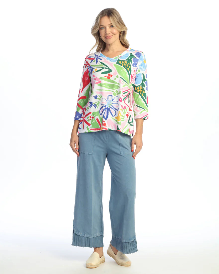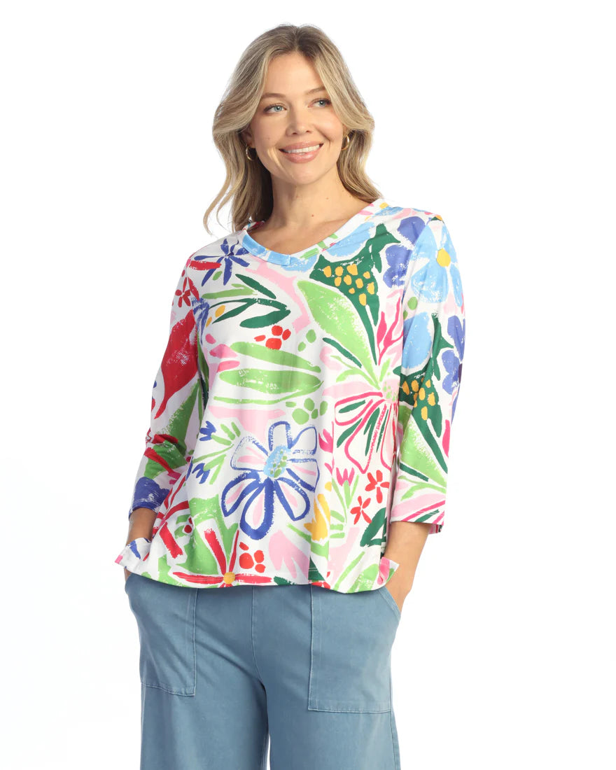 Bold Flowers 3/4 Sleeve V-Neck Top with Side Slits