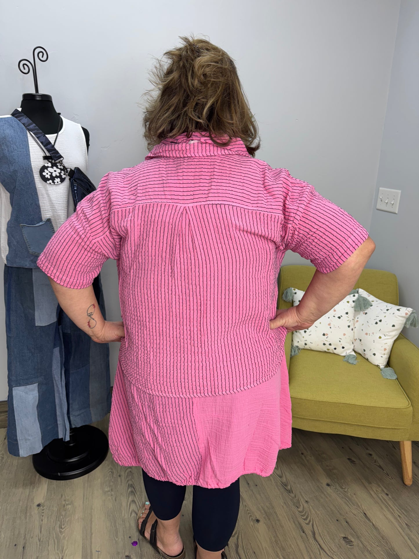 Regular price $62.30Elevate your wardrobe with our bubble gum pink button down top! Perfectly cute with its playful stripes, this top features short sleeves for a touch of casual elegance. It's also a great layering piece over a sleeveless dress for a fun and flirty look. Stand out in style and feel confident in this top!