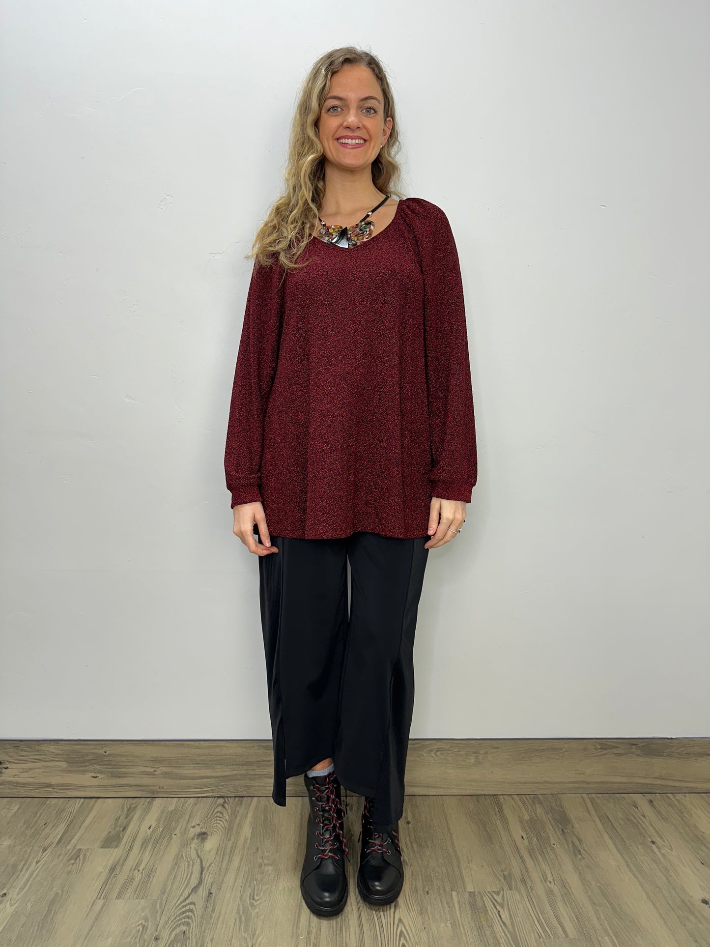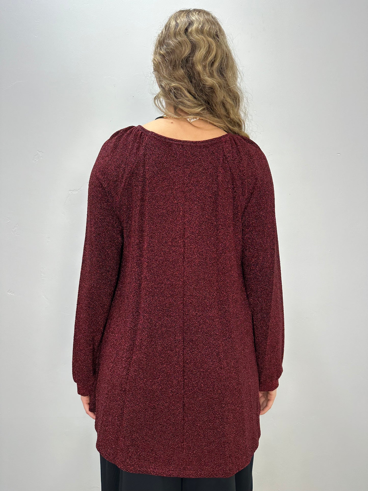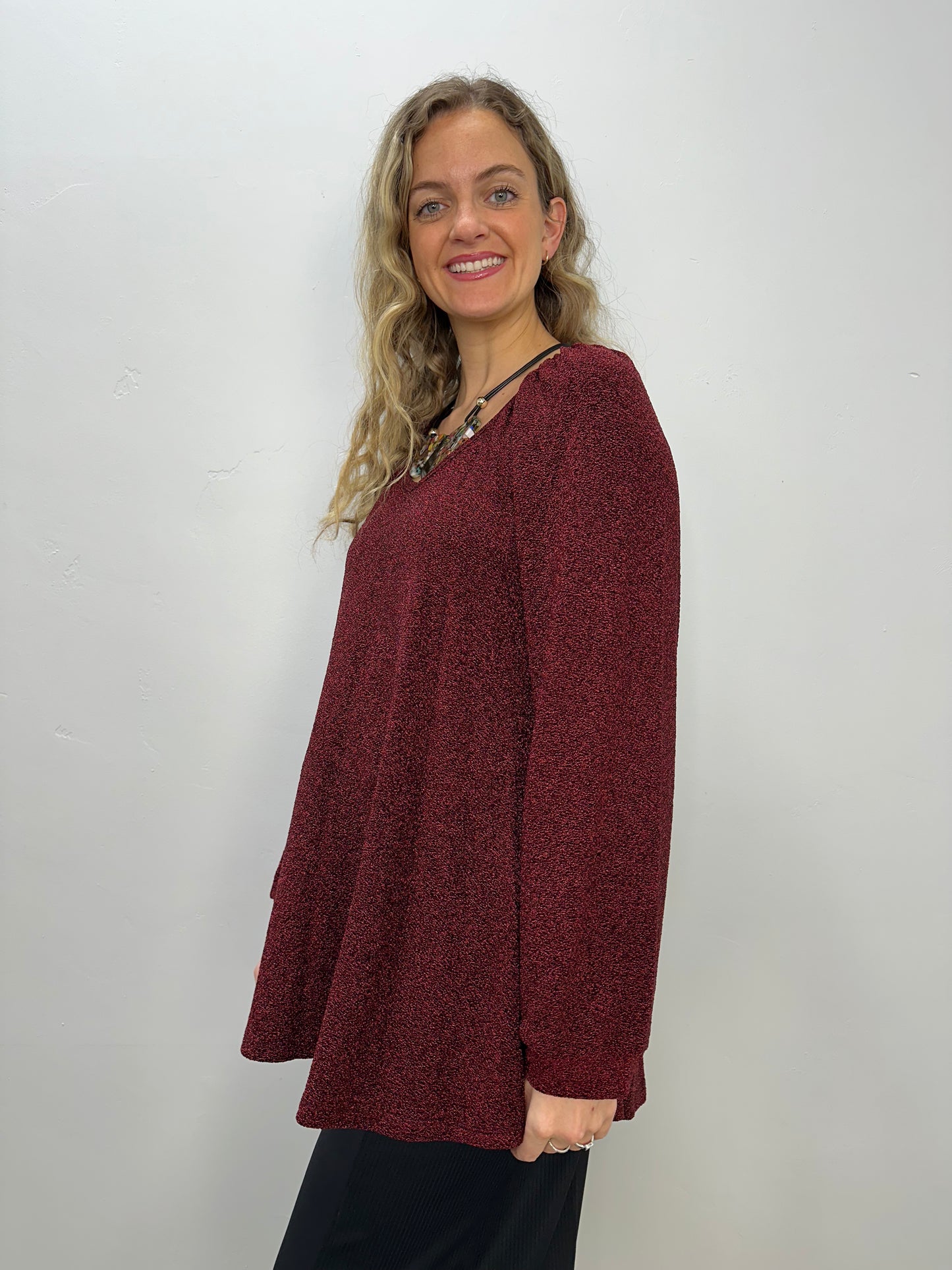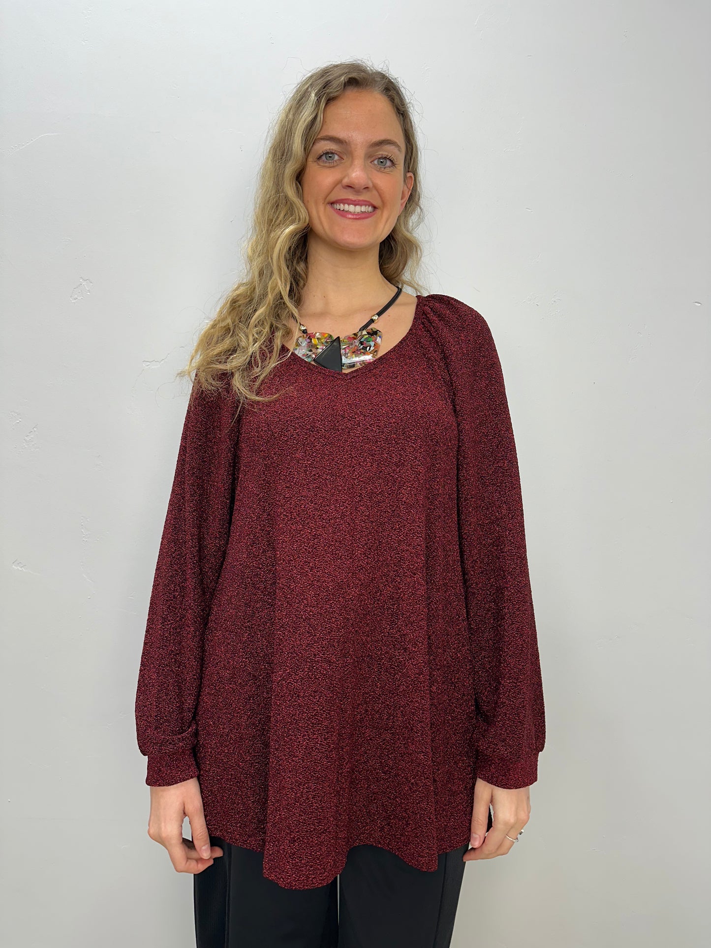 Regular price $55.20Elevate your wardrobe with our Burgundy Long Sleeve V Neck Top. The deep v neck and long sleeves offer a flattering silhouette, perfect for any occasion. Made with high quality lurex material, this top adds a touch of sparkle to your look. Stand out in style and comfort.