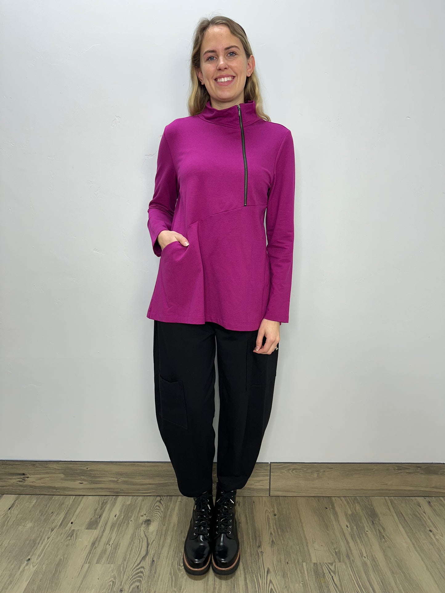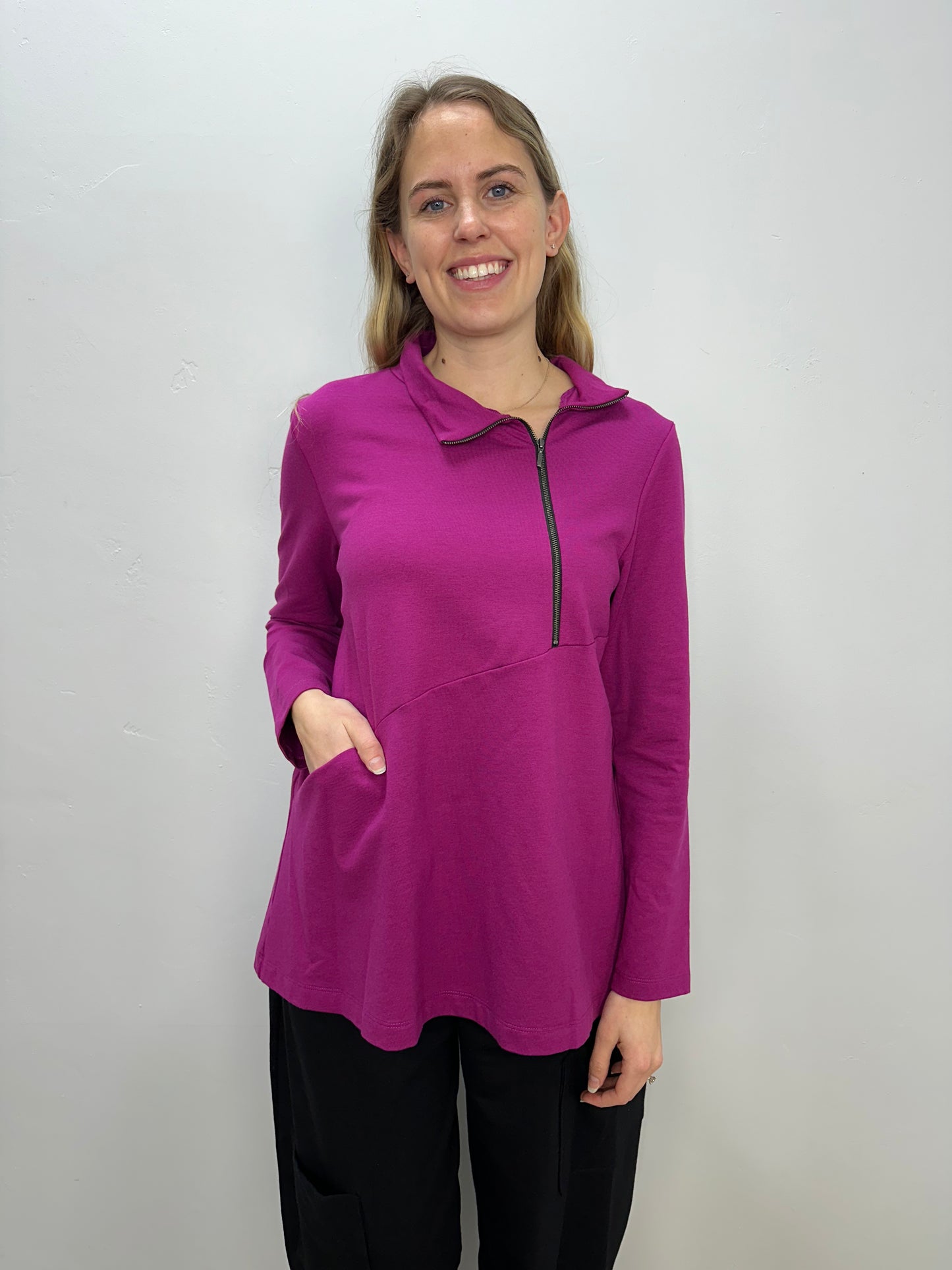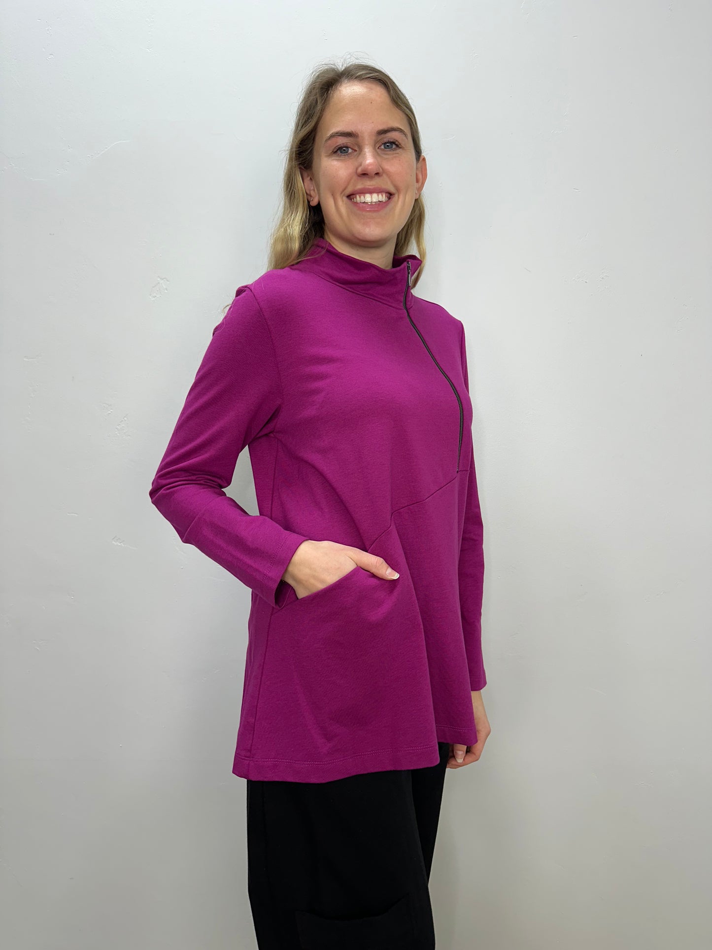 Regular price $132.30Experience the luxury of the Fuchsia French Terry High Neck Tunic. The velvety fabric and A-line silhouette exude sophistication, while the mock neckline with zipper trim and inseam pocket add practicality. Stay warm and elegant with this ultimate comfort and style piece.