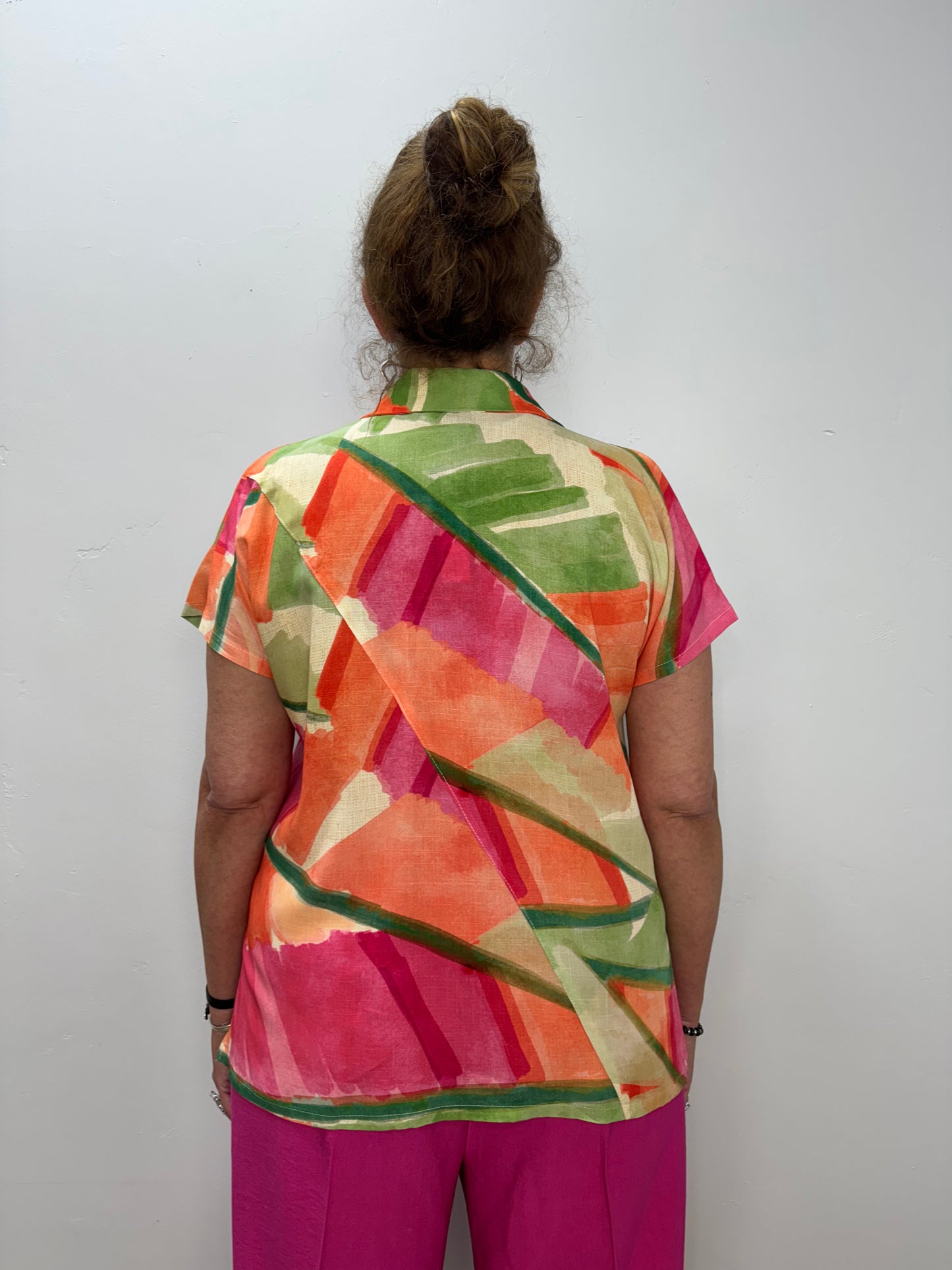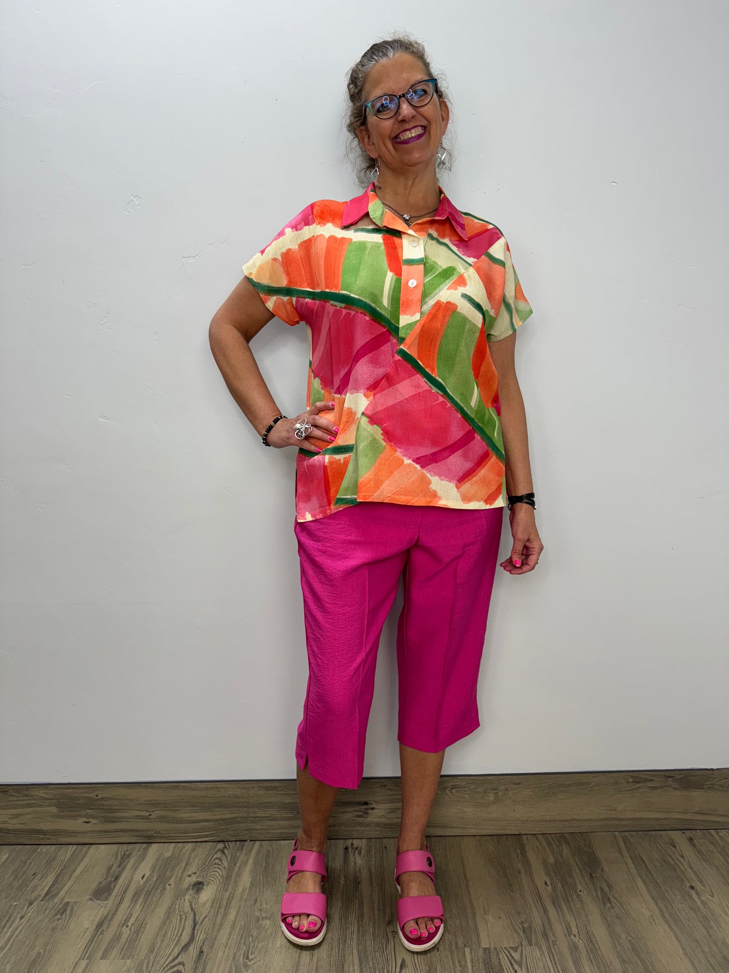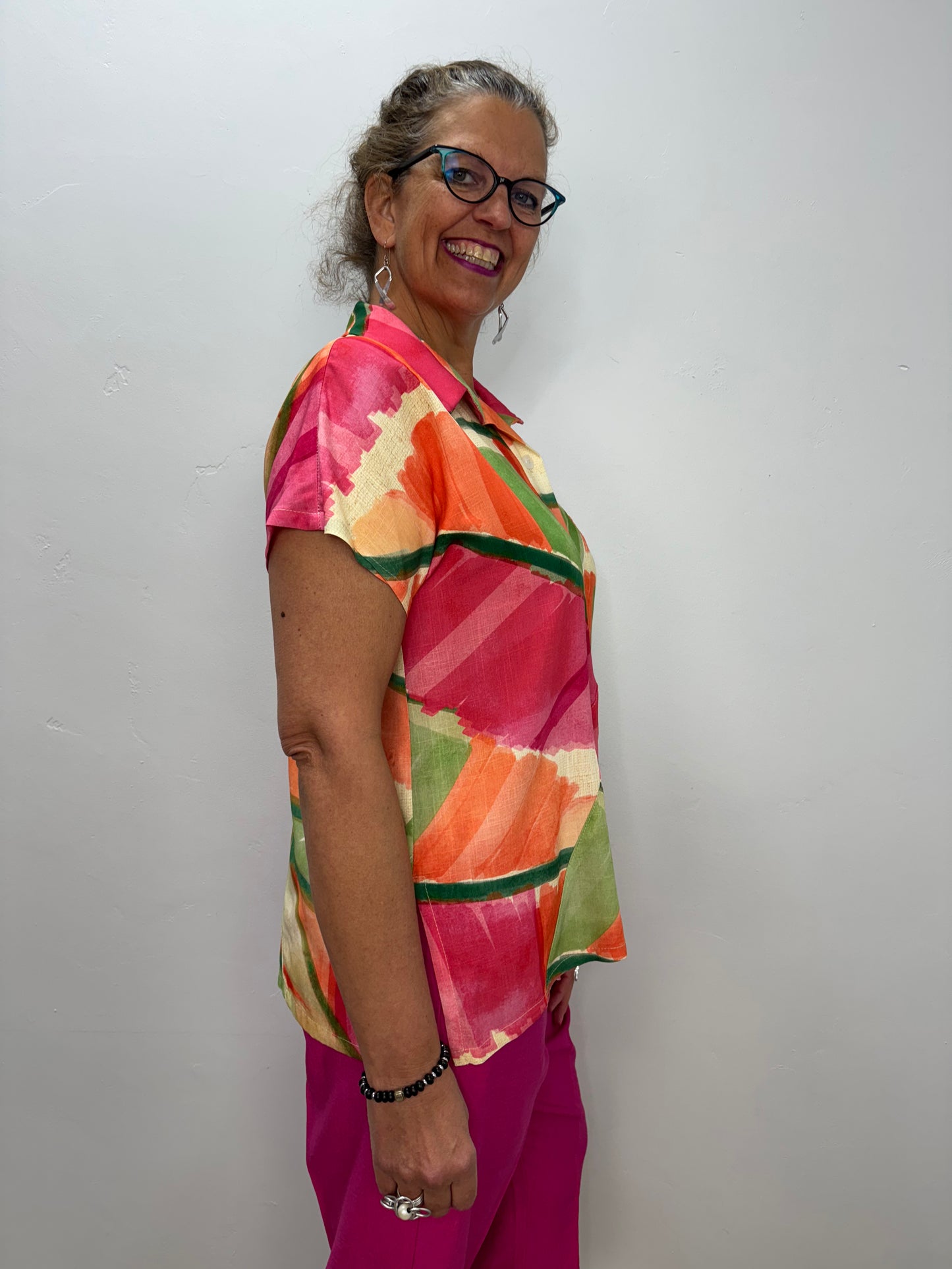 Fuchsia Green Short Sleeves Collared Button Up Top