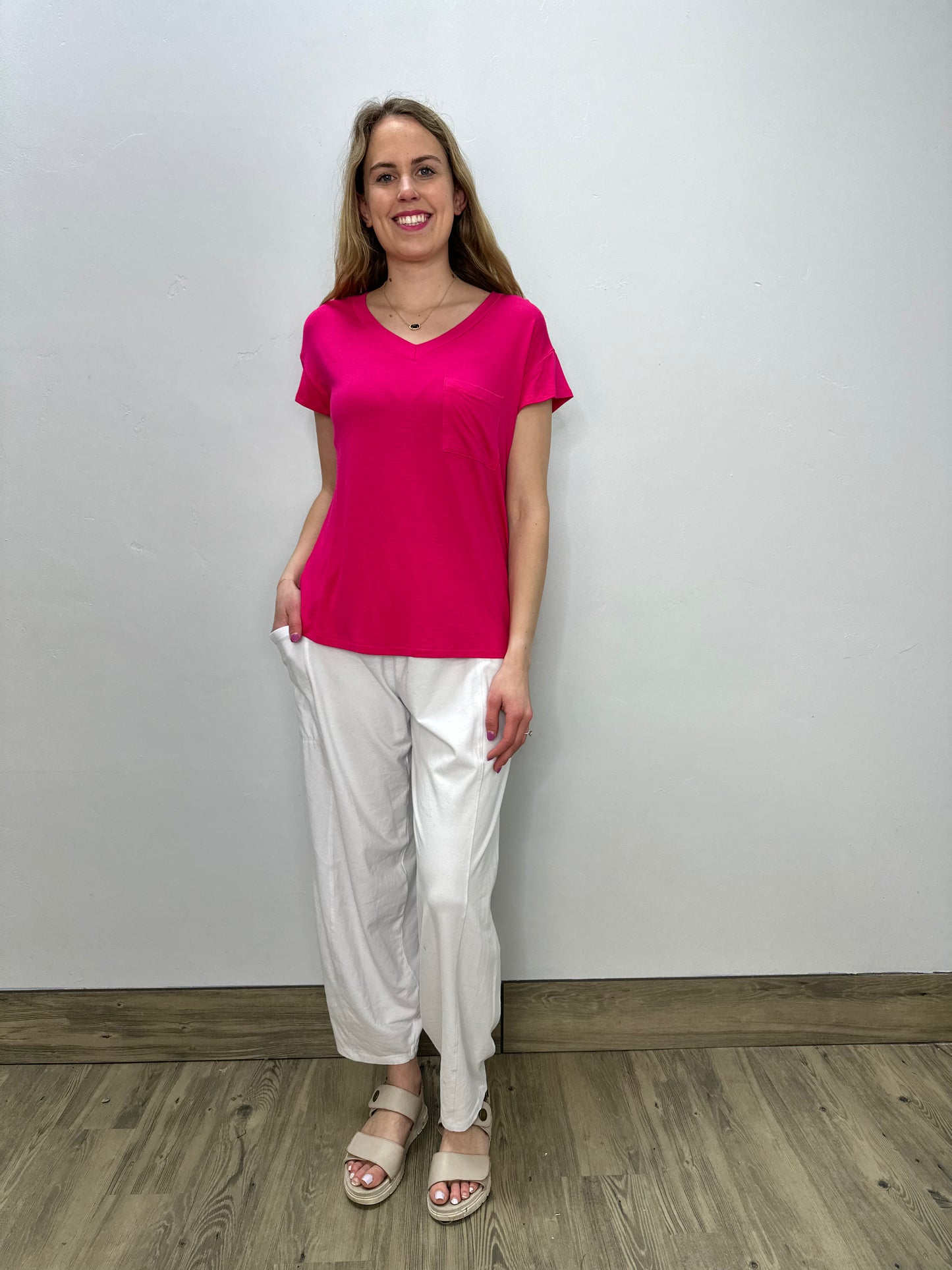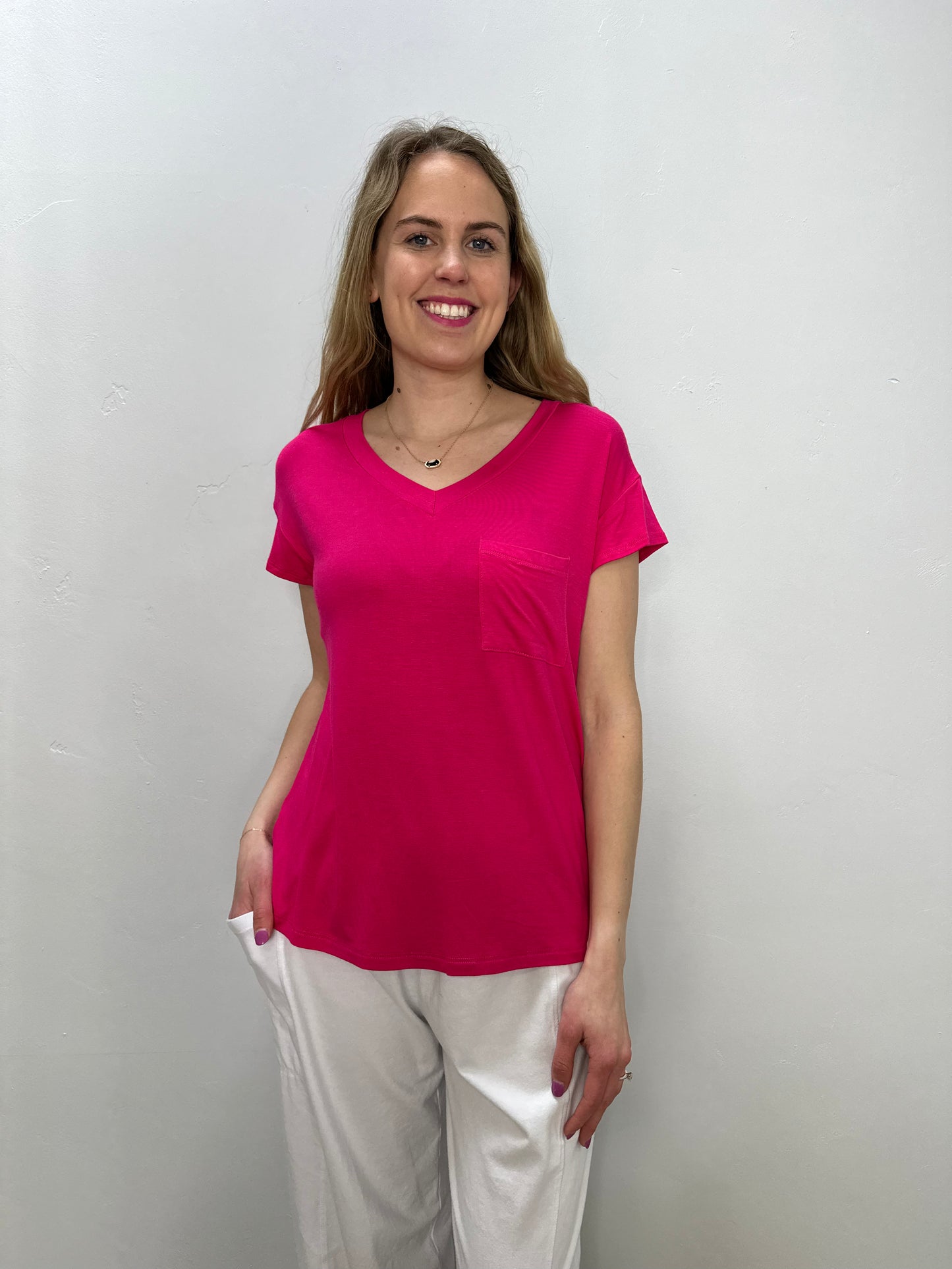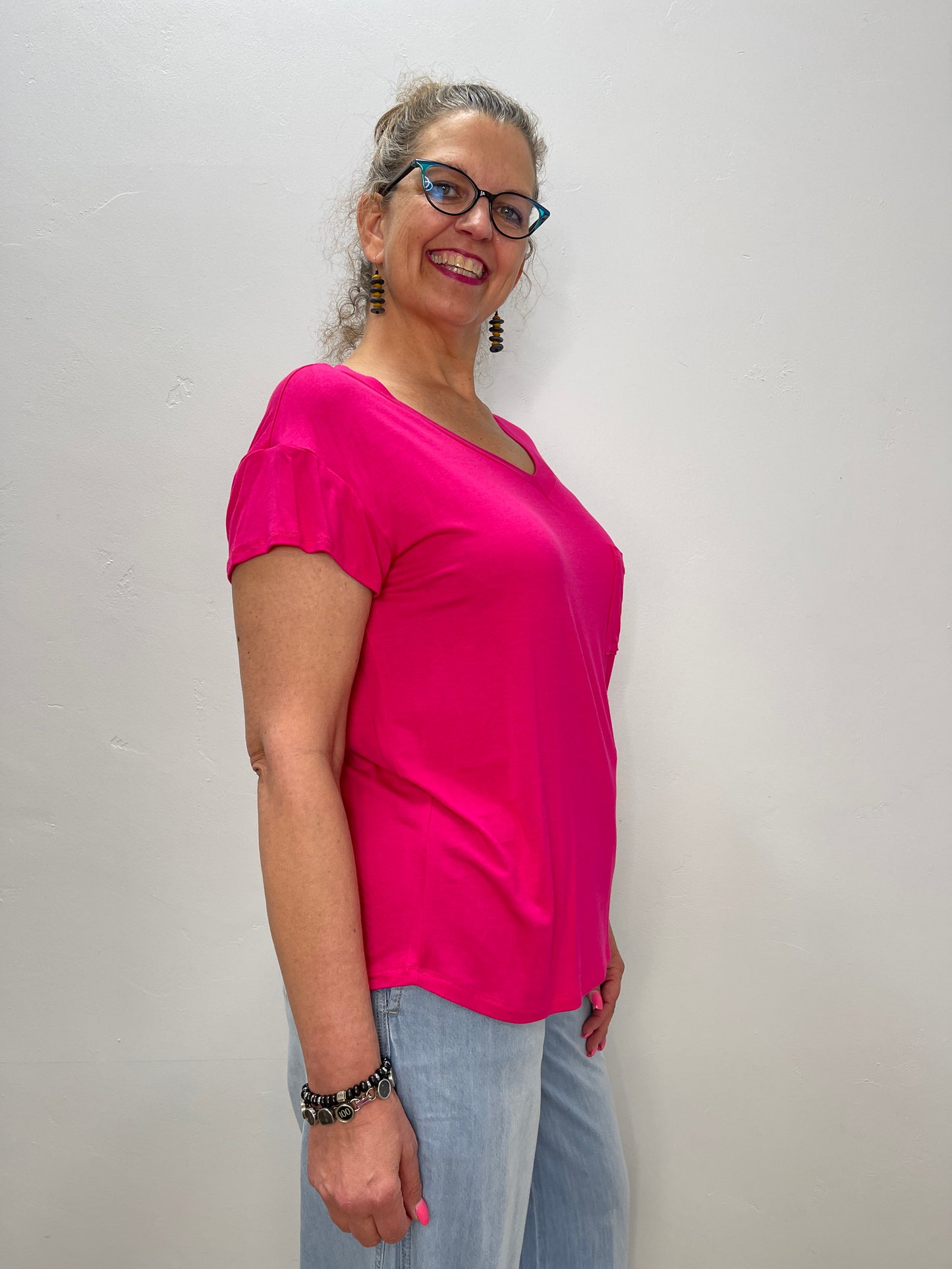 Regular price $29.40Refresh your wardrobe with our Pink V Neck Short Sleeve Top. Never again struggle with finding the perfect basic pink tee, as this top is a must-have for everyone. Its versatile design and soft fabric provide comfort and style for any occasion. Upgrade your basics now!