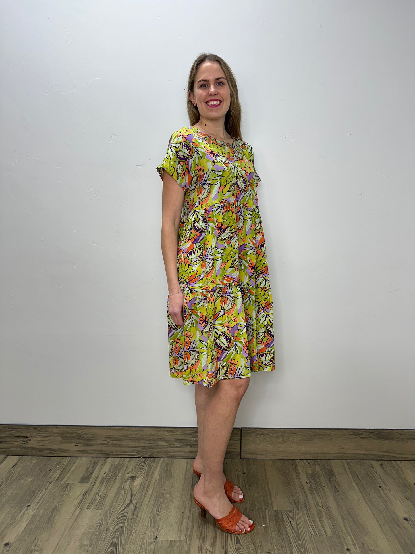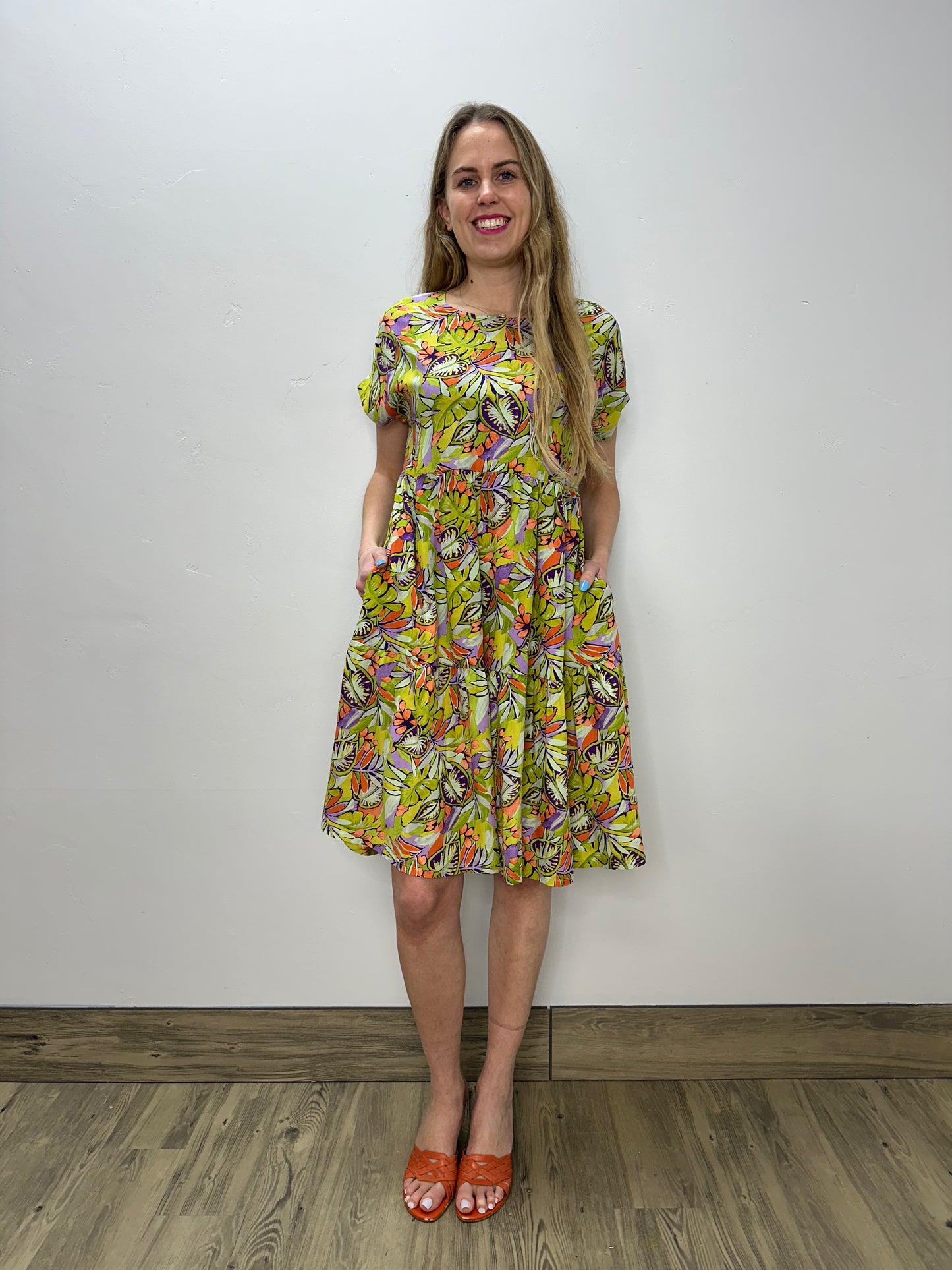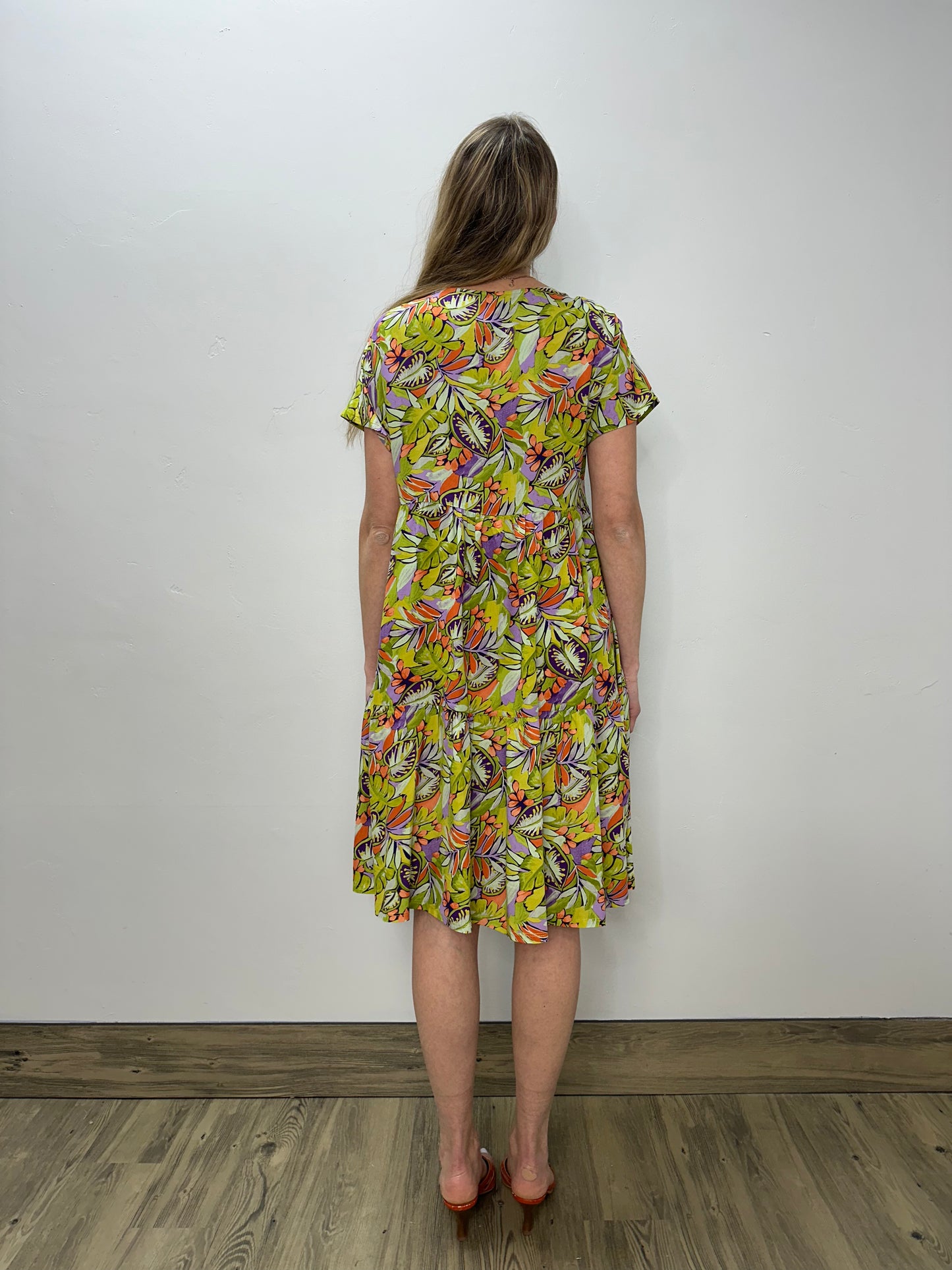 Green Tropical Leaves Floral Tiered Short Sleeve Dress