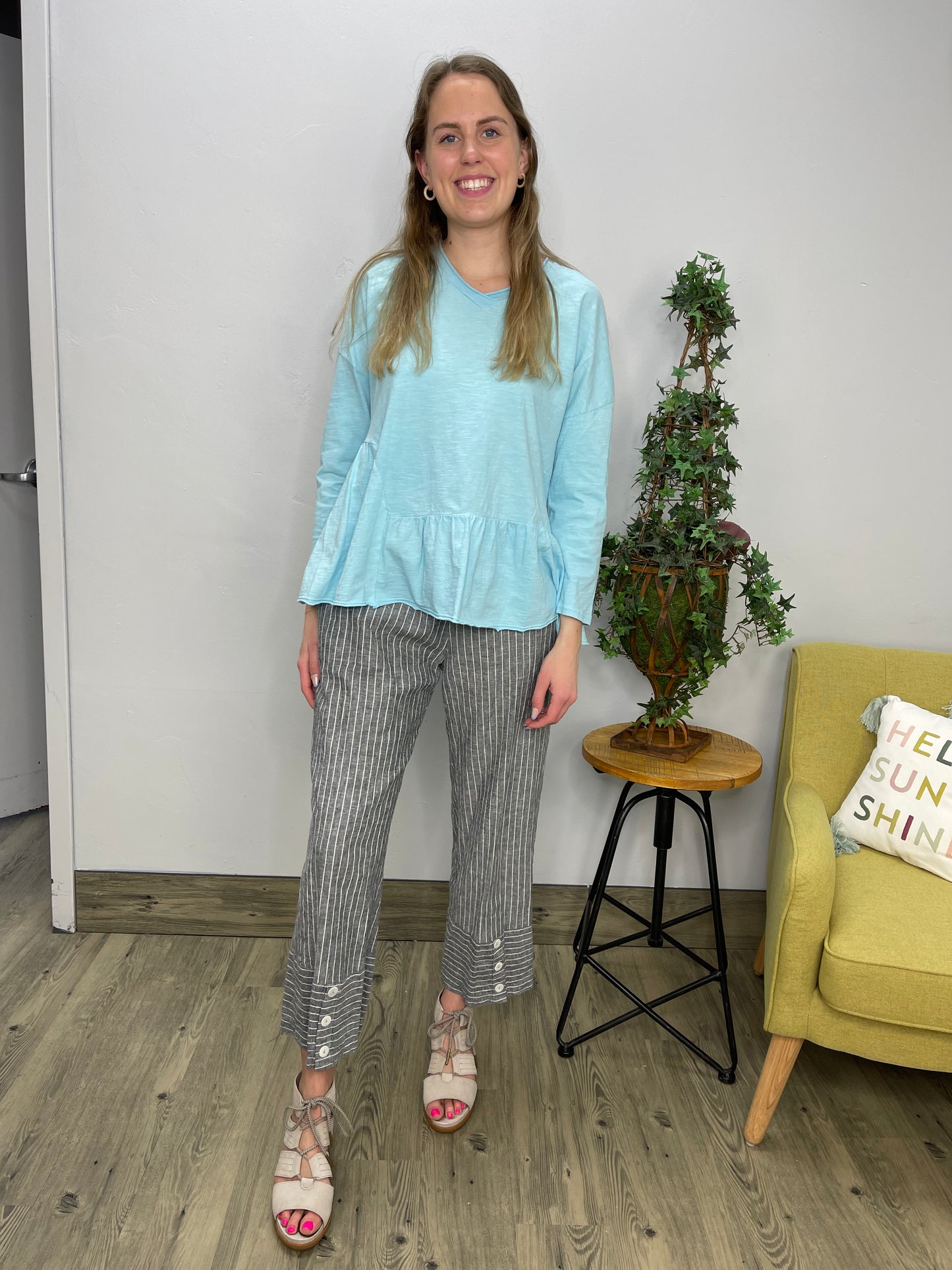 Regular price $103.20Elevate your look with this exquisite ice blue long sleeve top. A modern take on a classic style, this top features a skirted bottom and shirring detail to flatter the silhouette. Luxurious and timeless, it will be your go-to piece for a touch of elegance.
